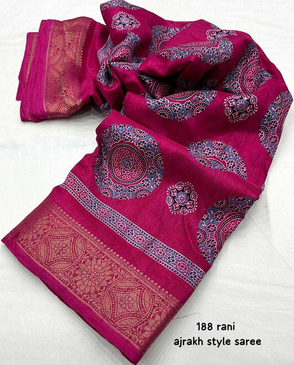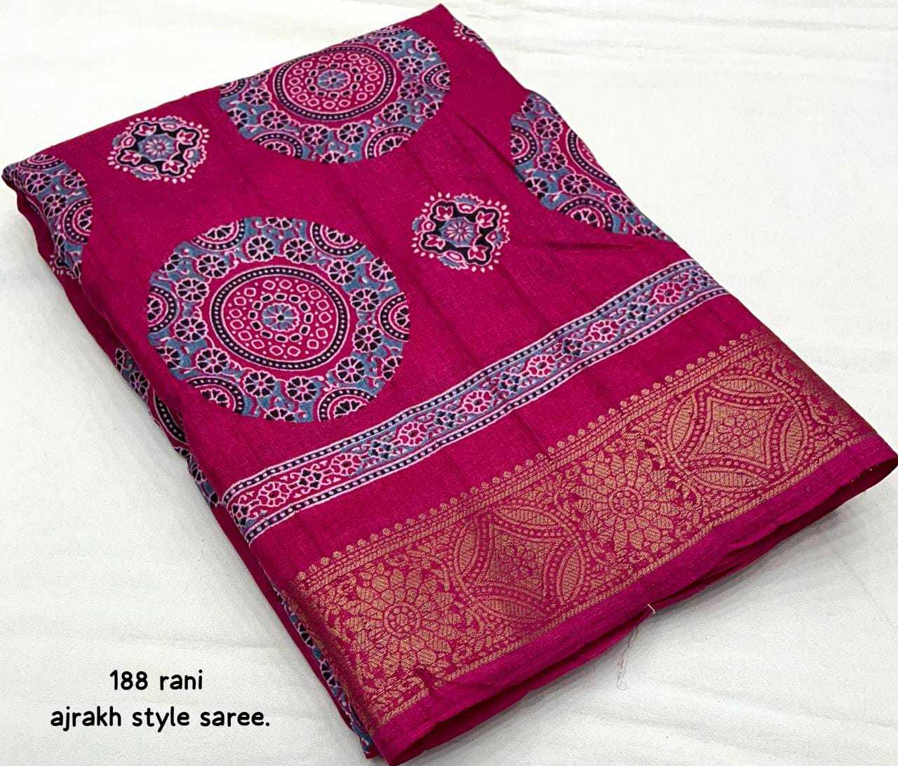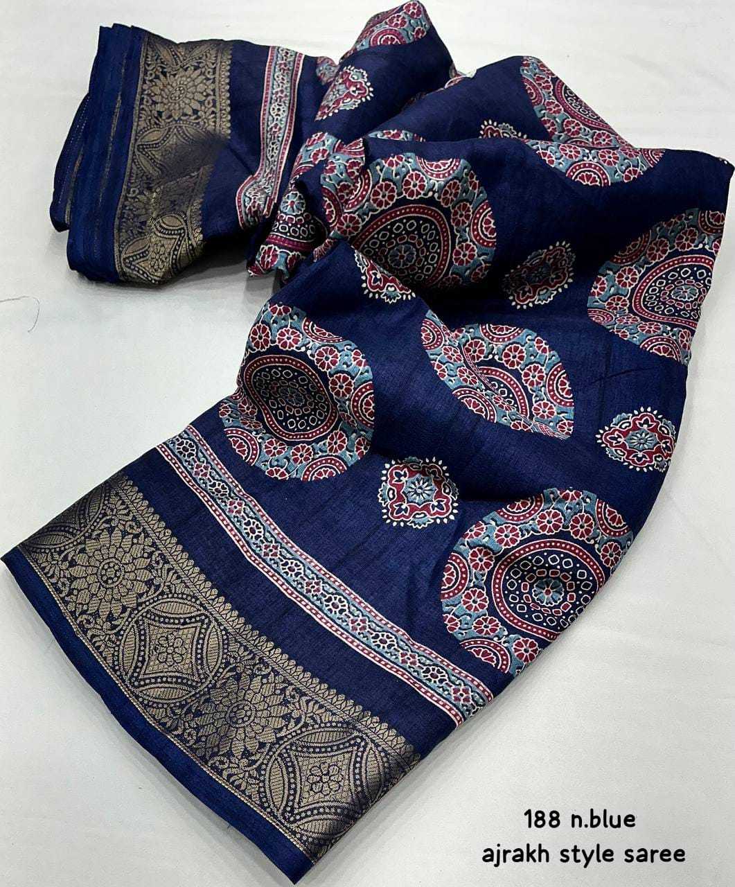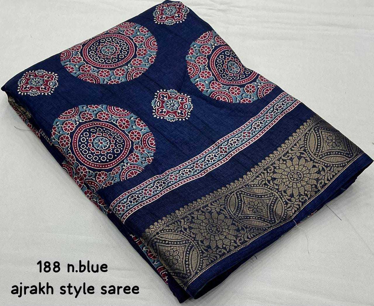 new arrivals New trending ajrakh style saree KC-188 KC- handloom ajrakh Quality- soft sulb silk saree with zari woven pattu border. Ajrakh style prints. Blouse- running slun silk blouse. Rate - 650+ship Top trusted quality |