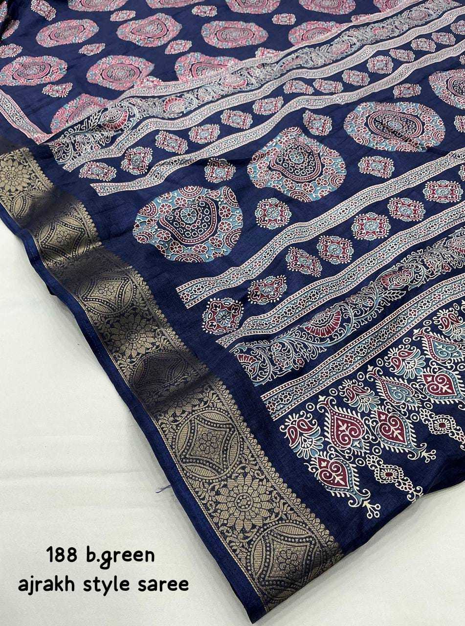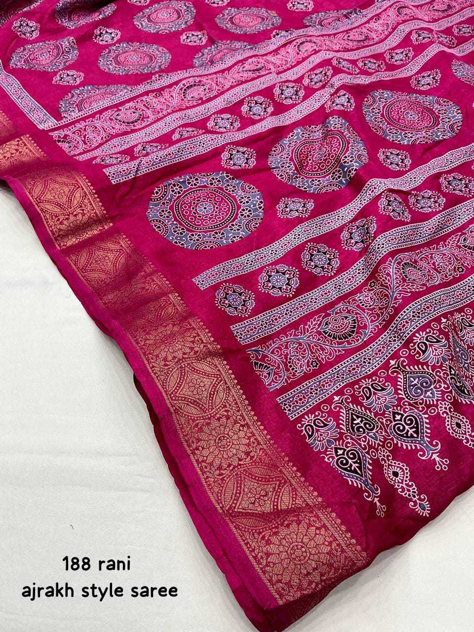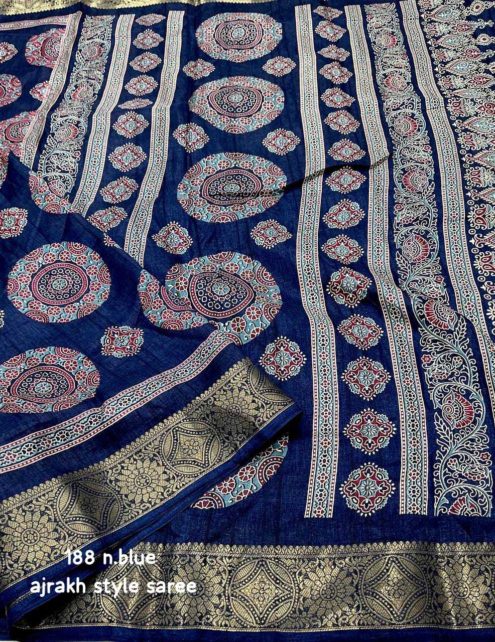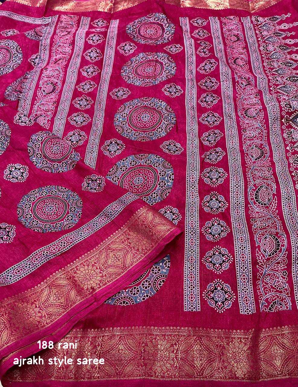new arrivals New trending ajrakh style saree KC-188 KC- handloom ajrakh Quality- soft sulb silk saree with zari woven pattu border. Ajrakh style prints. Blouse- running slun silk blouse. Rate - 650+ship Top trusted quality |