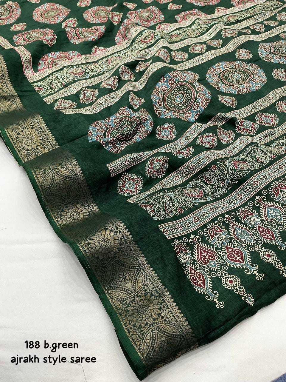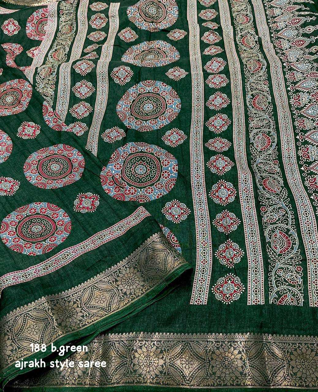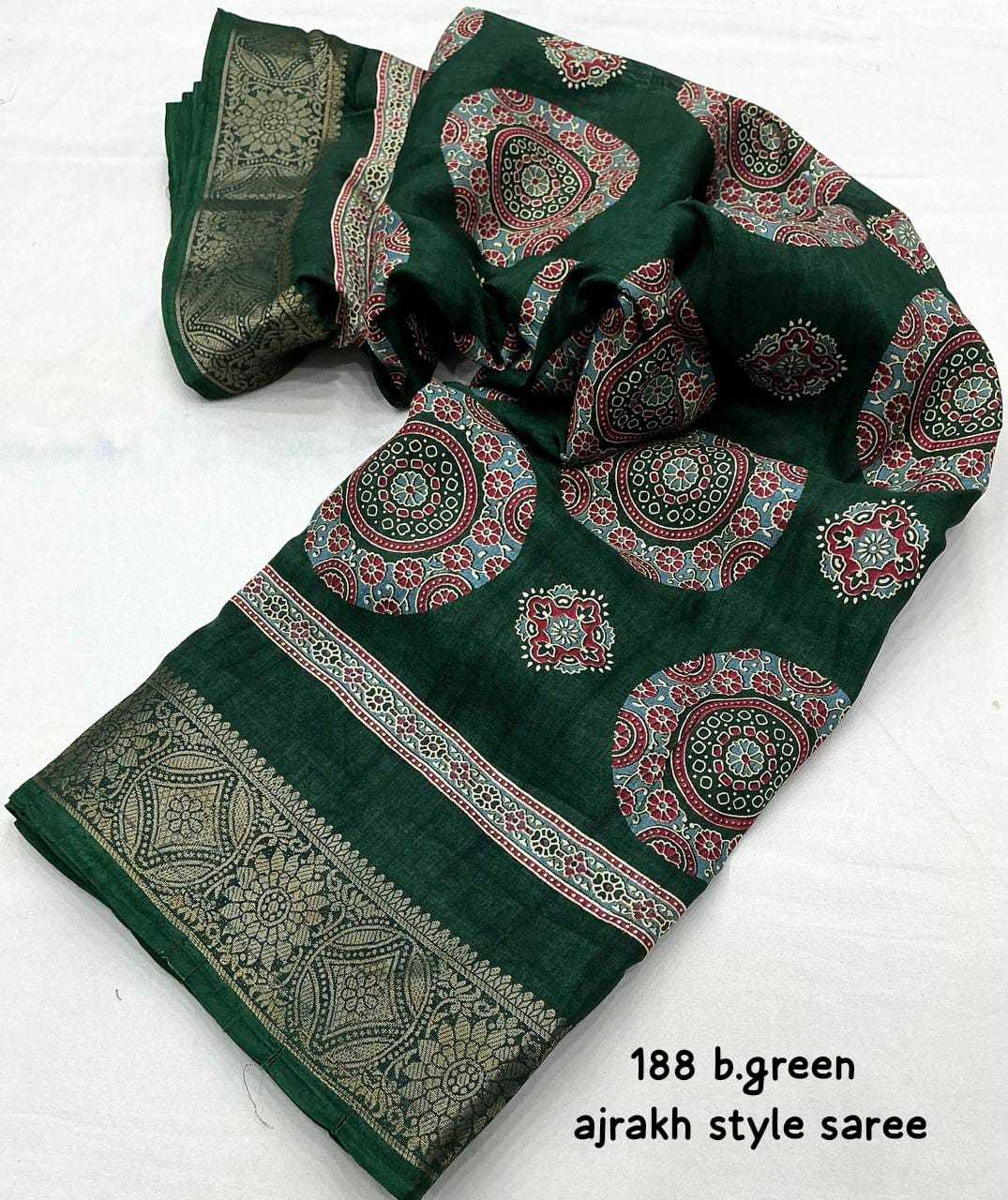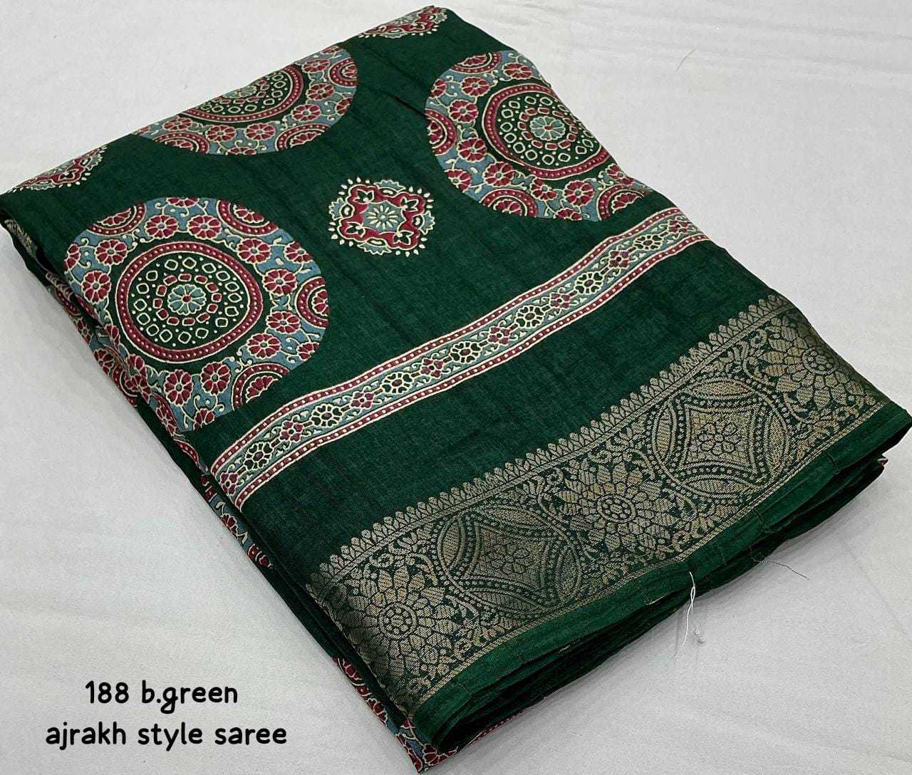 new arrivals New trending ajrakh style saree KC-188 KC- handloom ajrakh Quality- soft sulb silk saree with zari woven pattu border. Ajrakh style prints. Blouse- running slun silk blouse. Rate - 650+ship Top trusted quality |