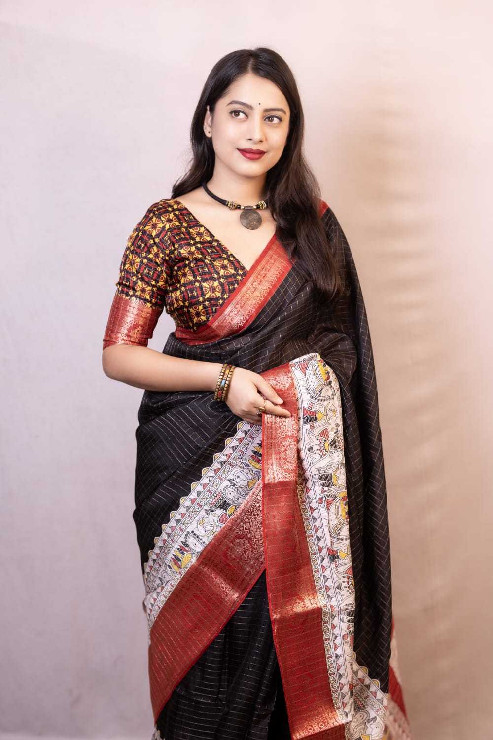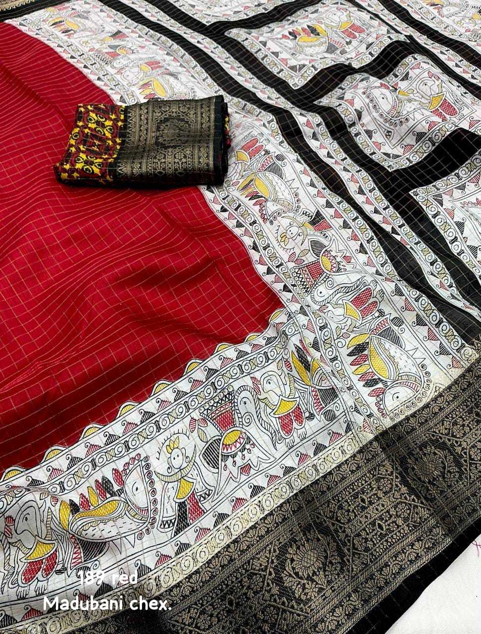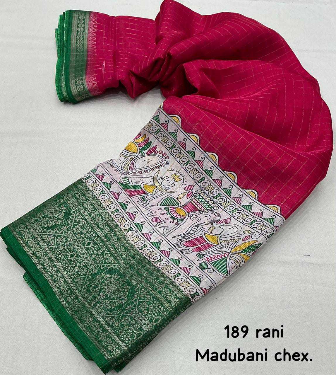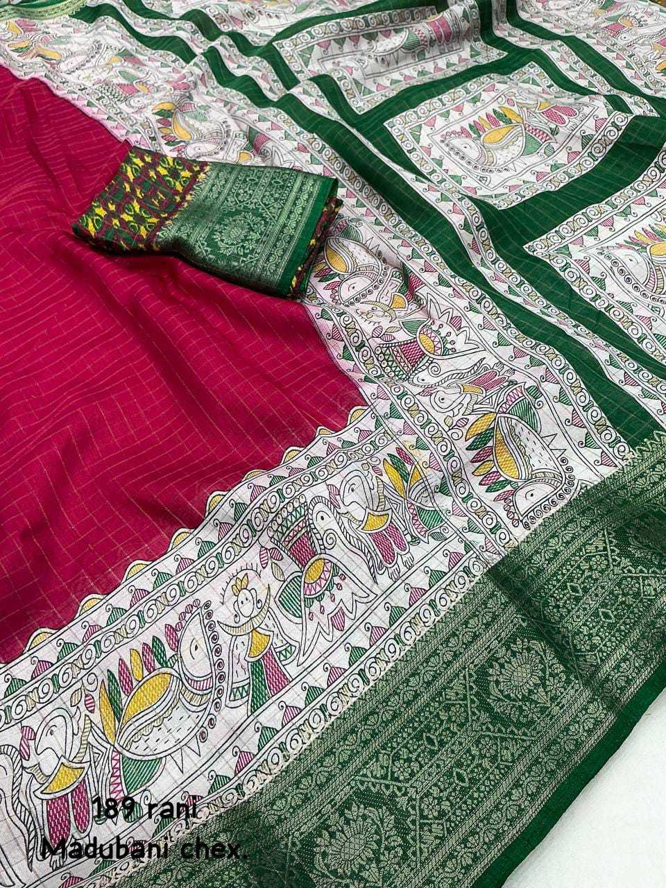 new arrivals New fancy printed catalog Kc- 189 madhubani chex. Quality- soft cotton crape chex saree with zari woven jacq border. Madhubani prints panel. Blouse- running kalamkari prints blouse. Rate - 730+ship. Top trusted quality |