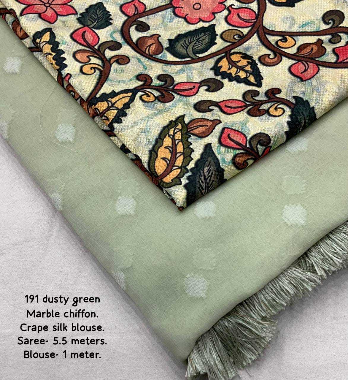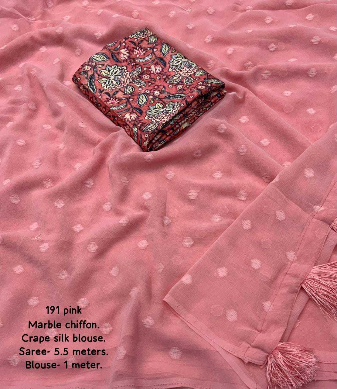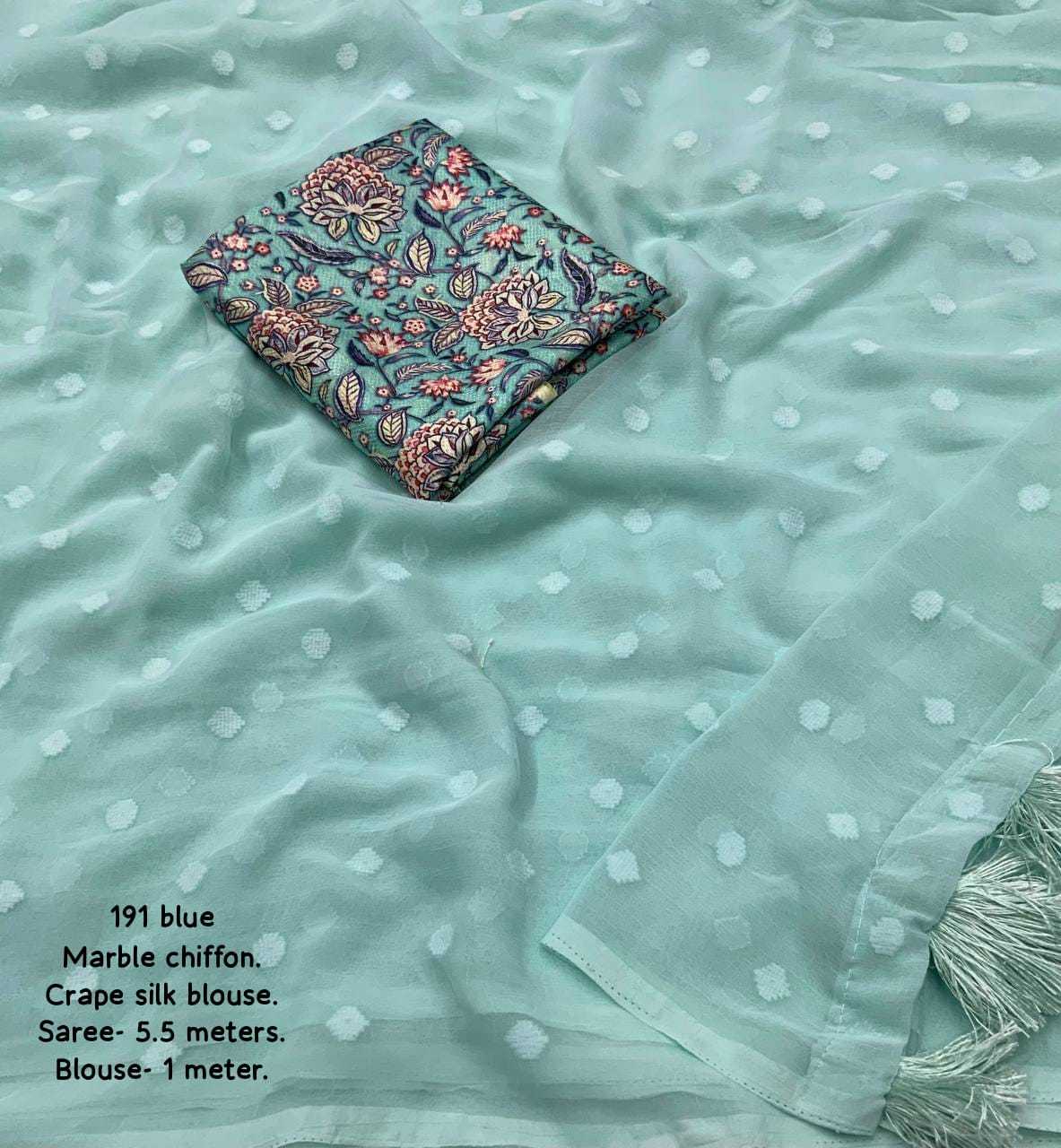 New arrivals New marble chiffon catalog KC - 191 KC - bubble chiffon. Quality- soft marble chiffon saree with self woven butti. Cotton tassles on pallu. Blouse- digital printed crape silk blouse. Rate - 650+ship Top trusted quality |