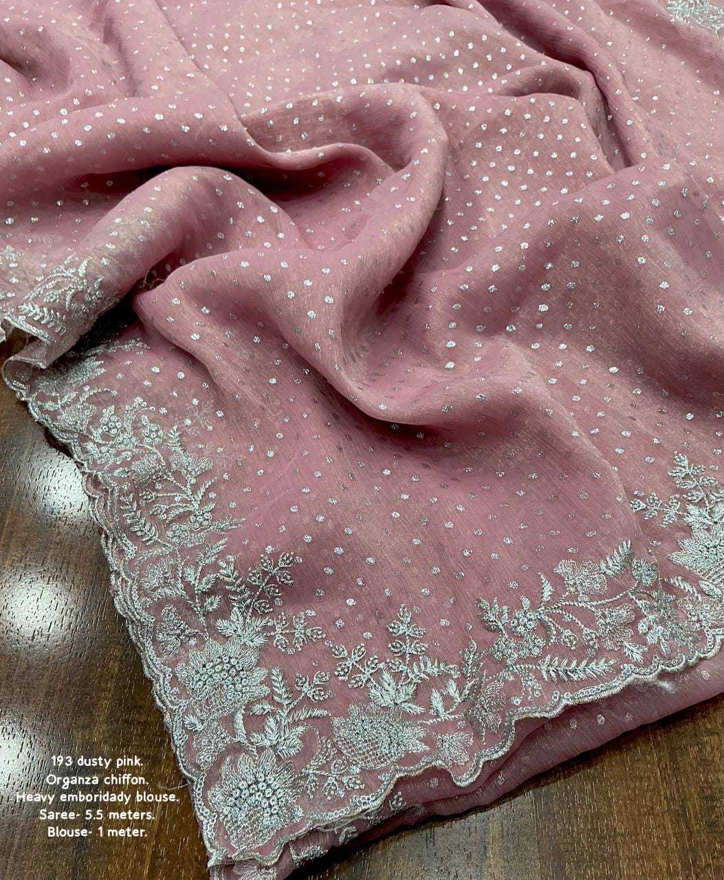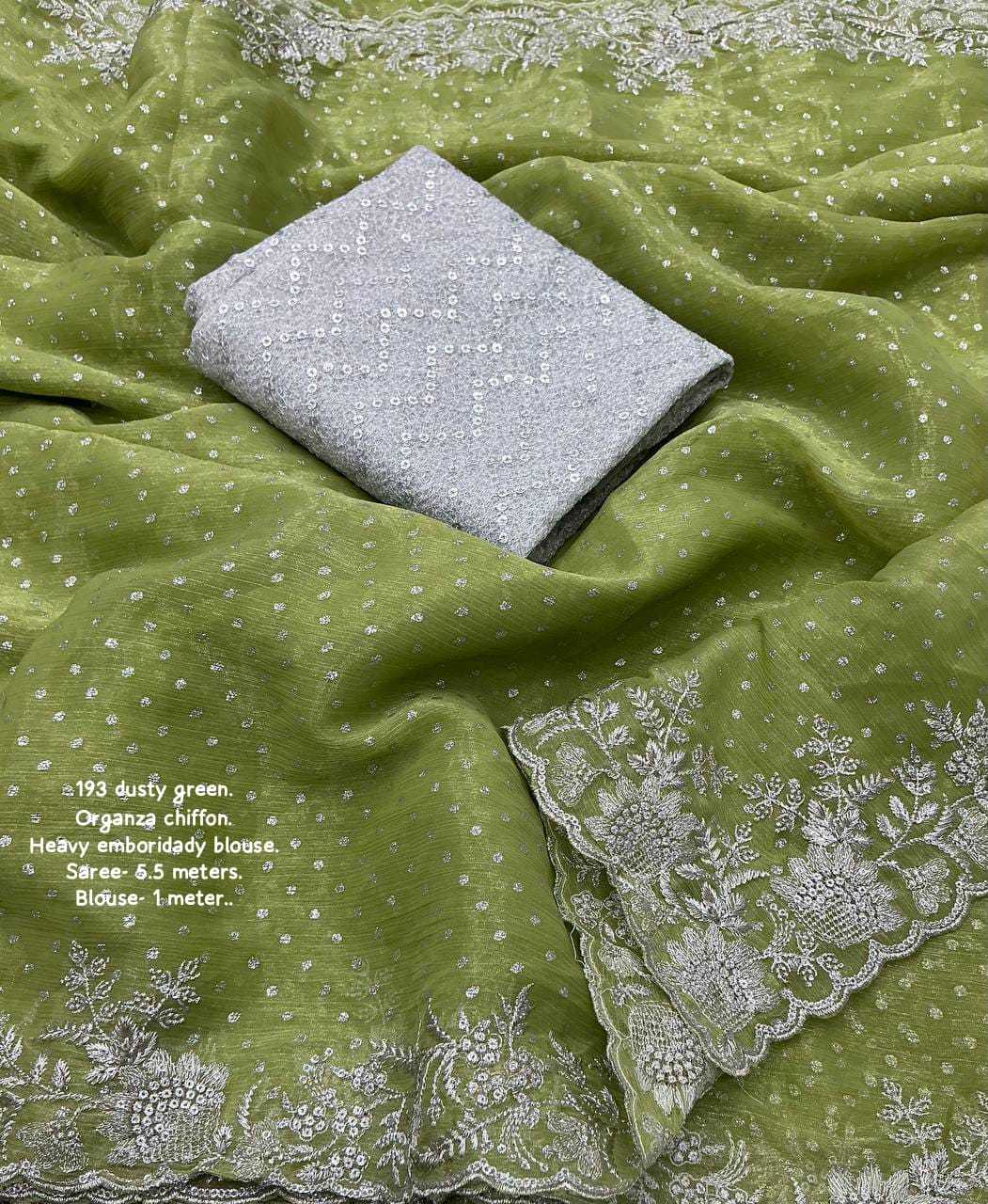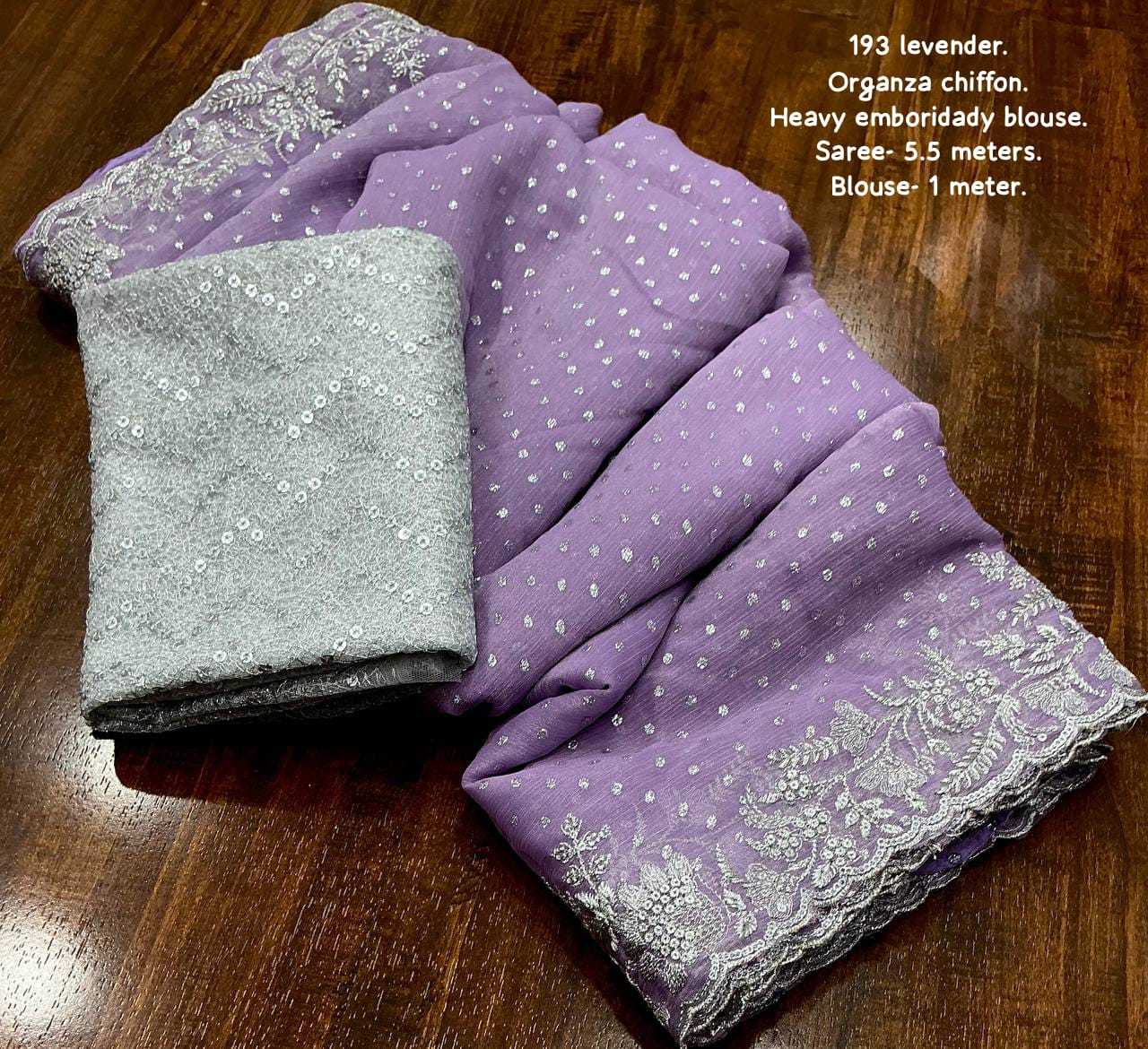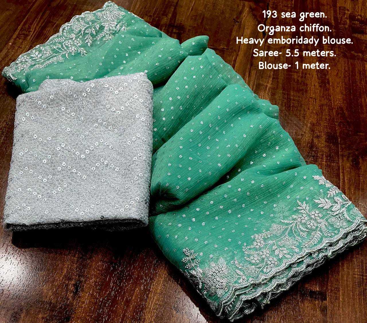 new arrivals New fancy emboridary catalog KC - 193 KC - organza chiffon. Quality- soft organza chiffon saree with silver butti additional work. Silver zari emboridady in c-pallu. Blouse- soft net with super heavy sequence emboridary. Rate - 1650+ship Top trusted quality |