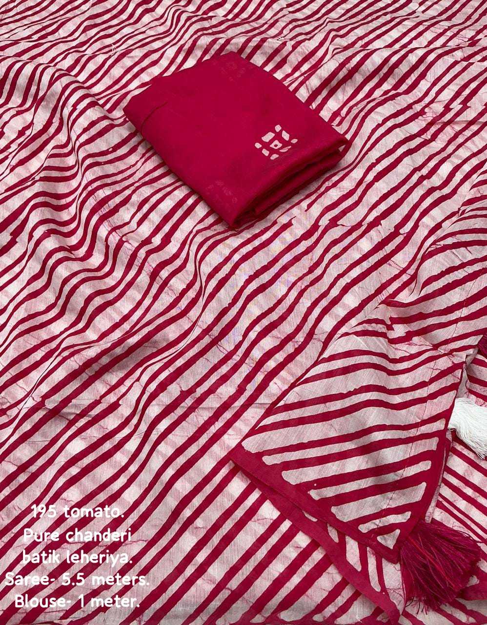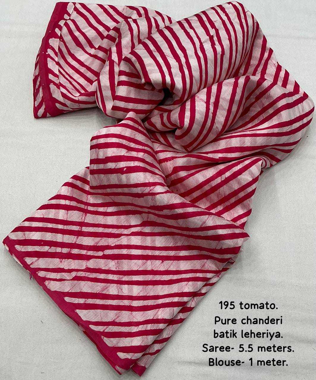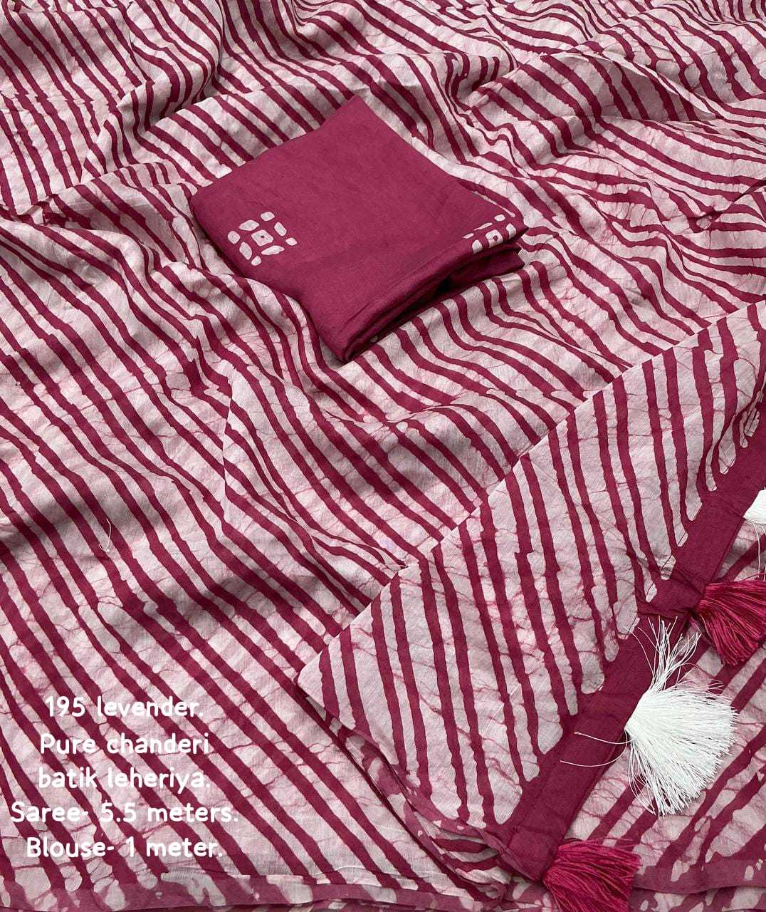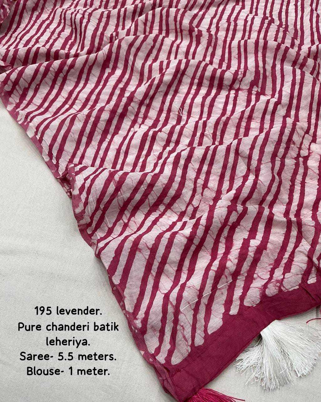 new arrivals New pure chanderi leheriya batik saree. KC - 195. kc - magic leheriya. Quality- soft chanderi cotton saree with leheriya batik design. Cotton tassles on pallu. Blouse- contrast running chanderi cotton blouse. Rate - 1050+ship Top Trusted Quality |