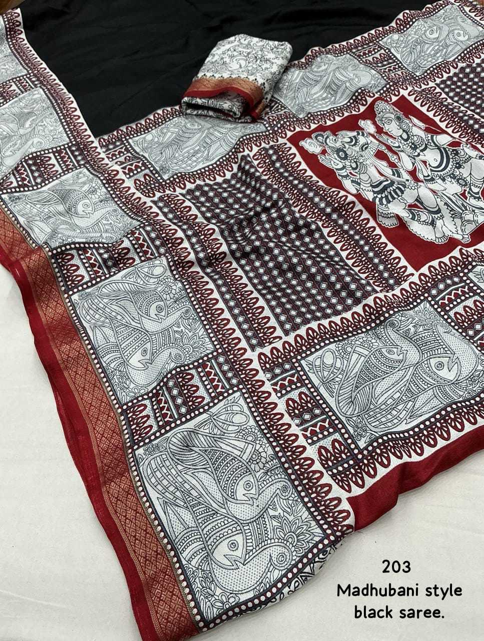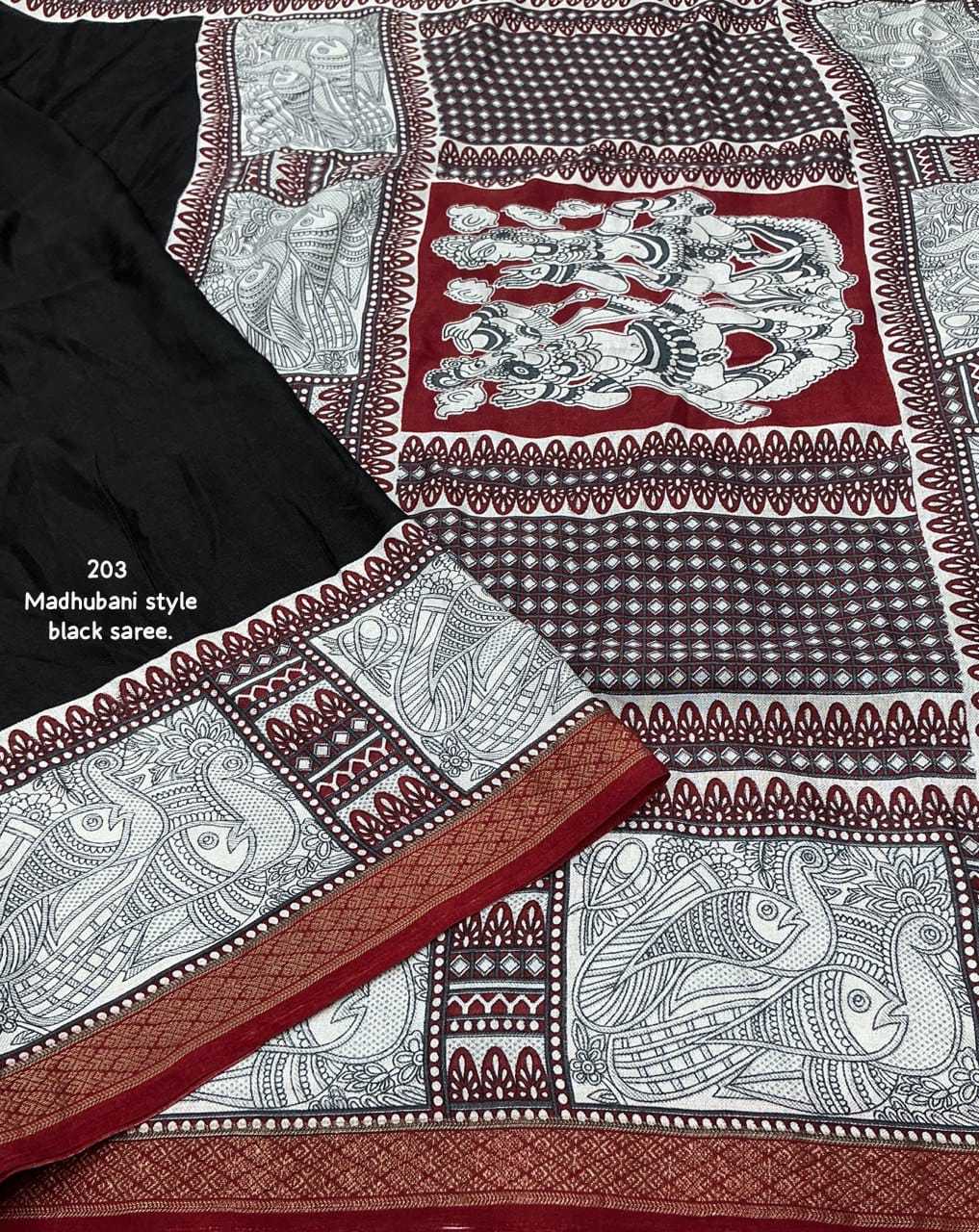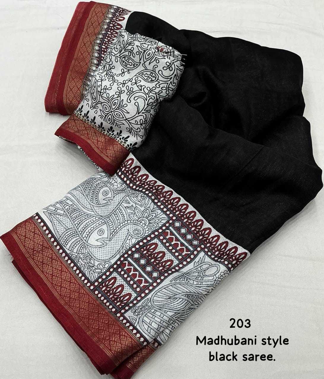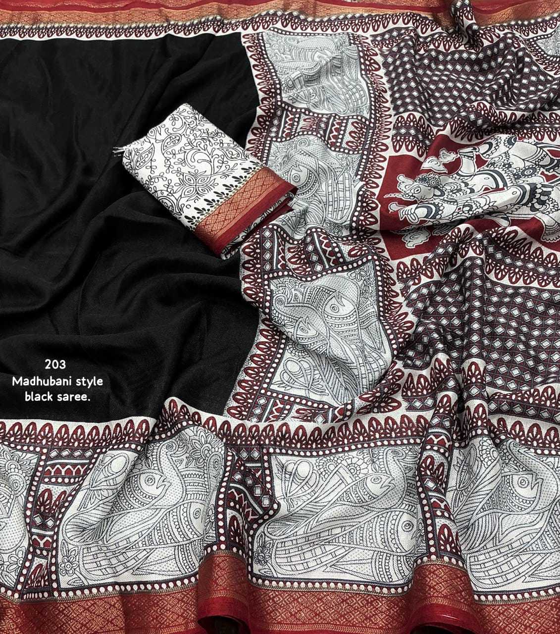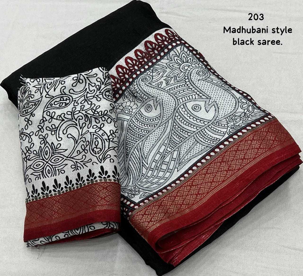 new arrivals New special edition KC- 203 KC- marina cotton (black edition) Quality- soft pashmina cotton saree with self woven designs and zari pattu woven borders. Madubani style prints. Blouse- perfect matched running cofton blouse with white and black prints. Rate - 520/- +ship Single color special edition |