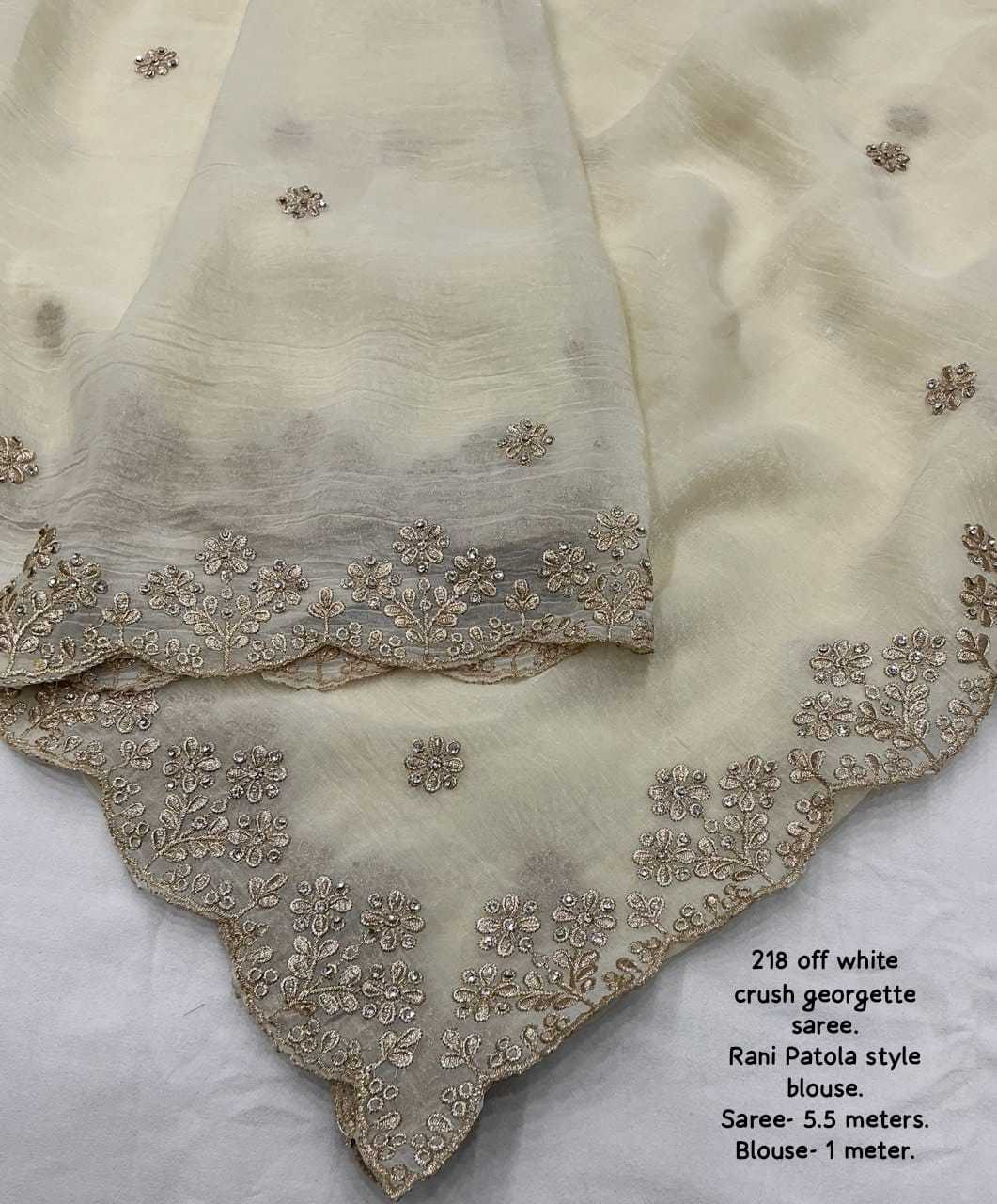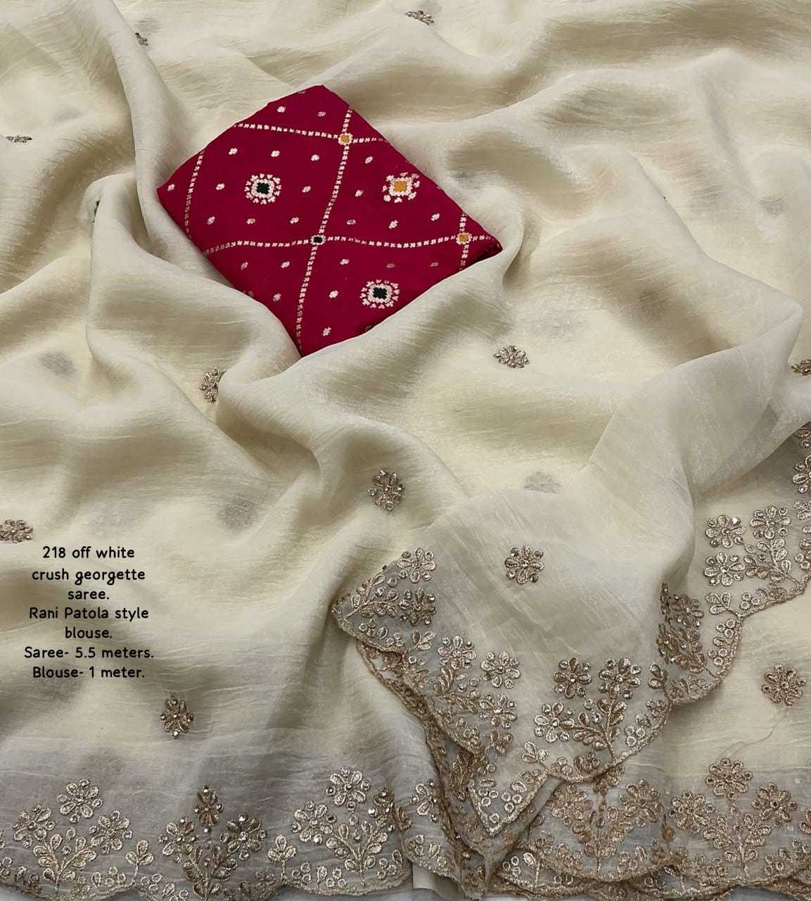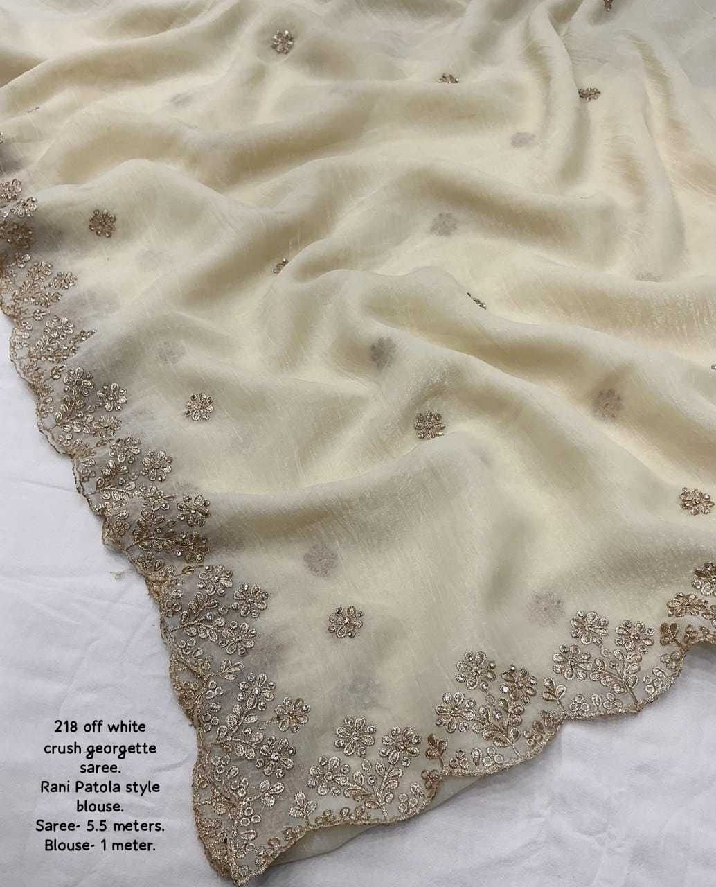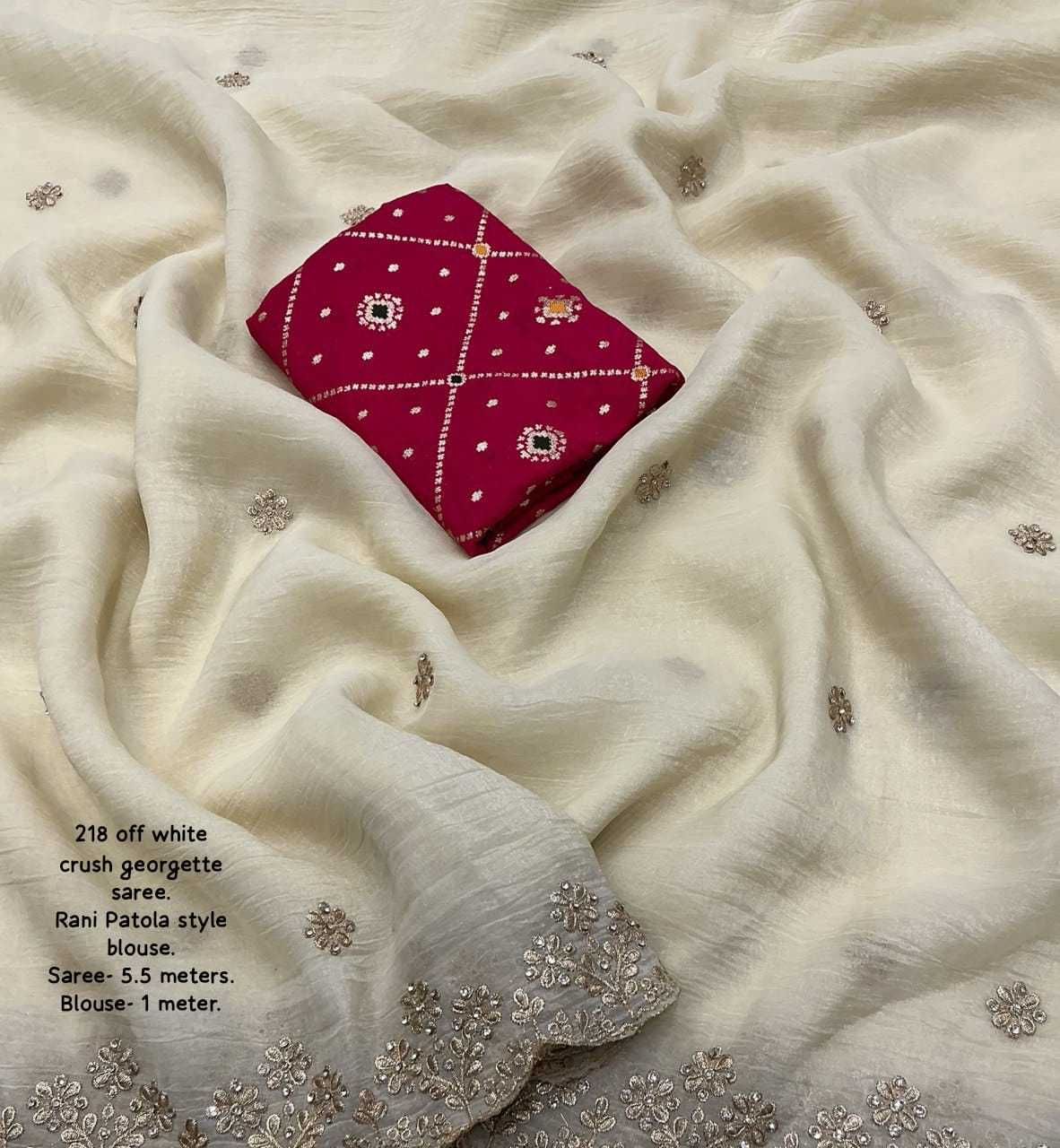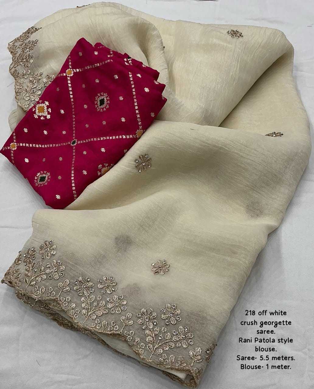 new arrivals New fancy off white emboridary saree Single color exdition KC - 218 zari crush. Quality- soft crunchy crush saree with zari emboriday and stone work on it. Blouse- Contrast rani color patalo style banarsi zari woven blouse. Rate - 1300/-+ship. Top premium quality |
