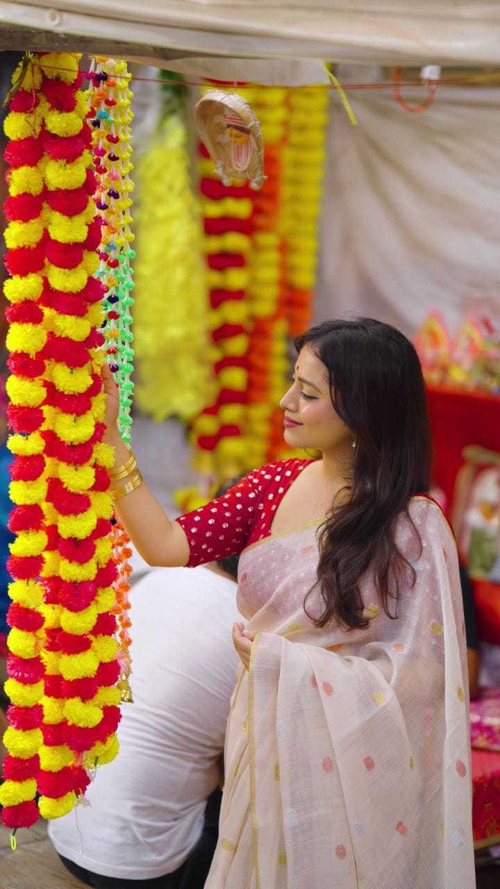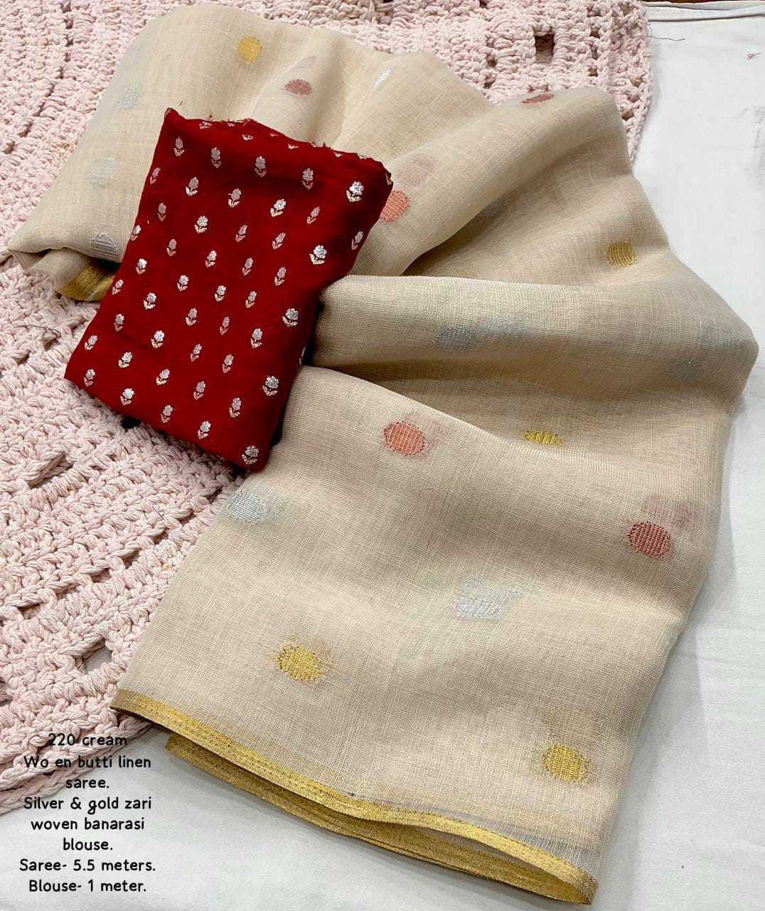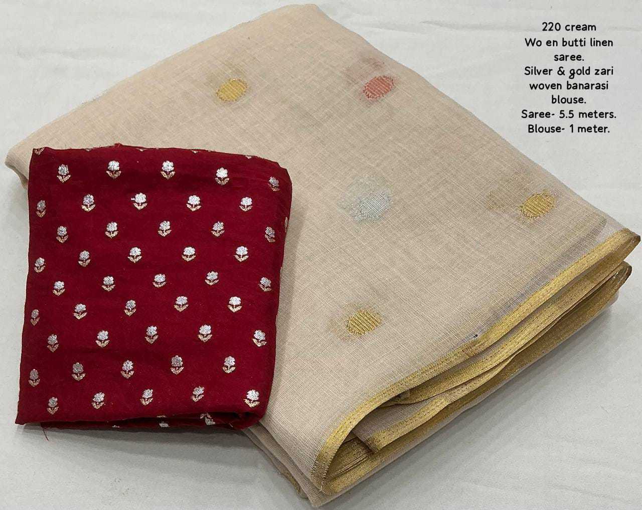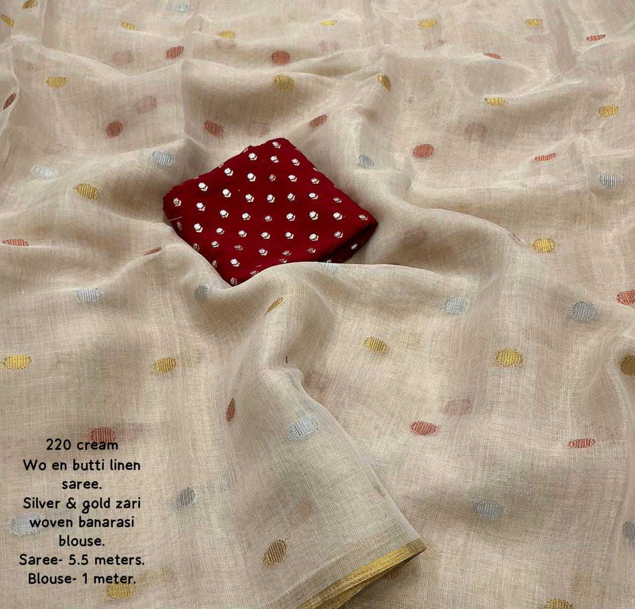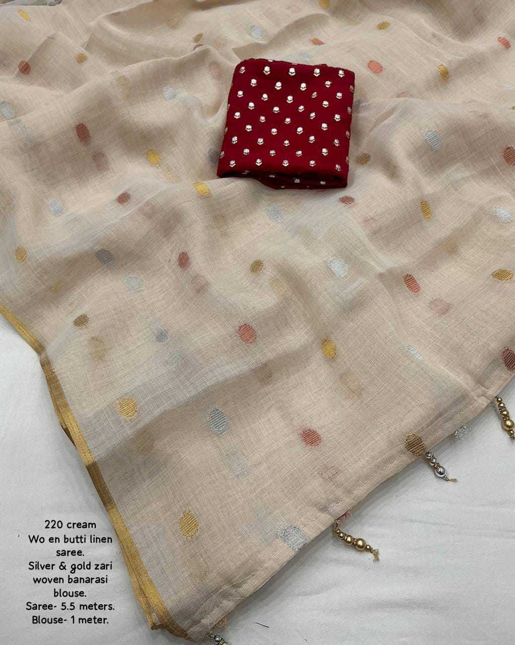 new arrivals New premium line n catalog KC - 220 butti linen (single color edition) Quality- soft linen multi-color woven butti saree with zari pattu woven border. Moti style jhumka on pallu. Blouse- marron tye and dye banarasi silk with beautiful combination silver and gold zari. Rate - 1150+ship Top premium quality |