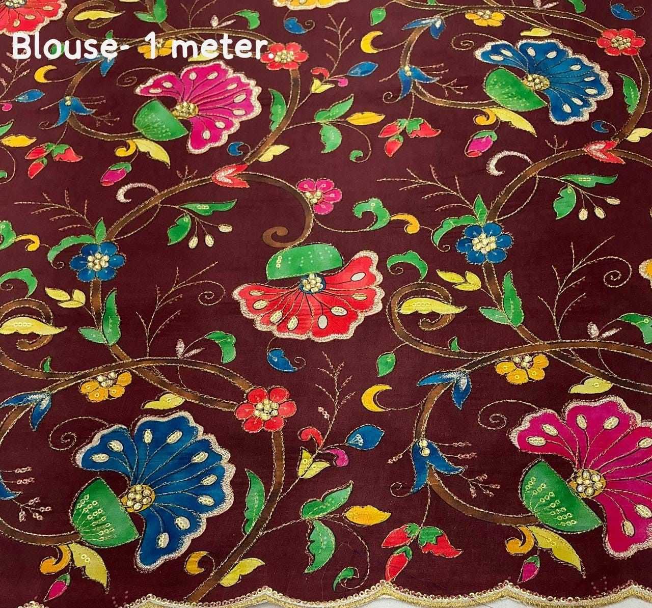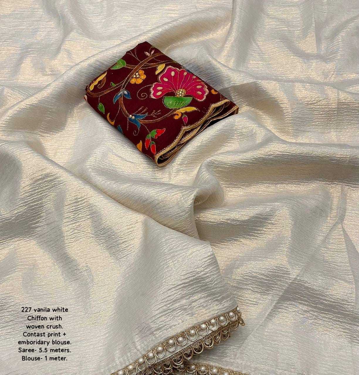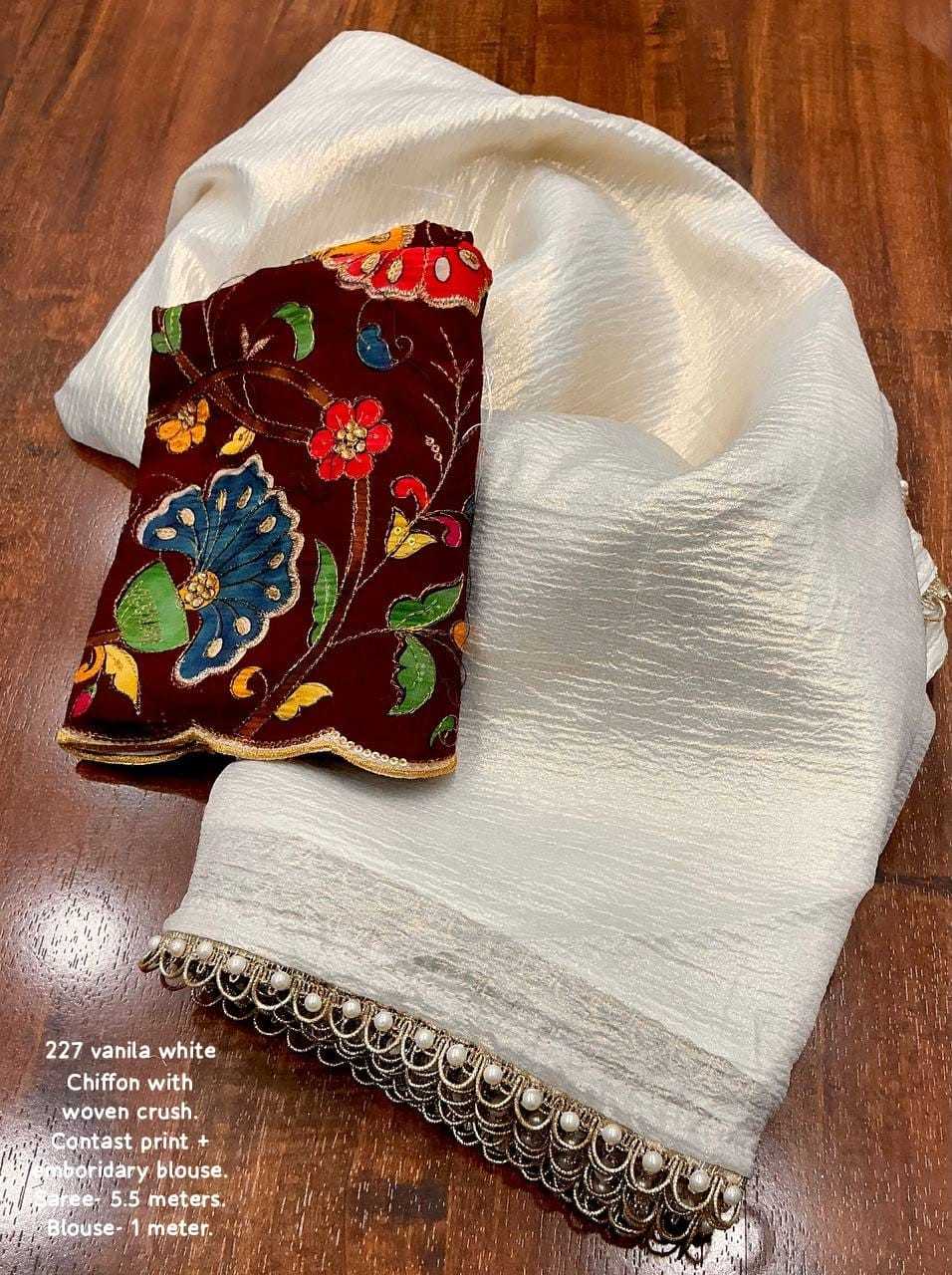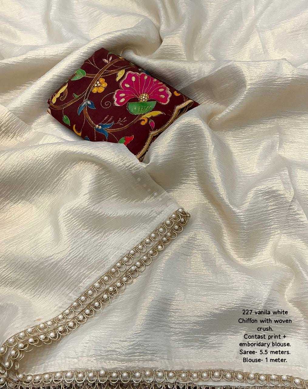 new arrivals New premium single.edition KC- 227 banila crush. Quality - vanila white soft chiffon saree with woven crush on it. Simple shiny coating on saree. Patched handwork look moti lace. Blouse- contarst marron beautifull combination of print and emboridary on phantom silk. Rate - 2350+ship Top premium quality |