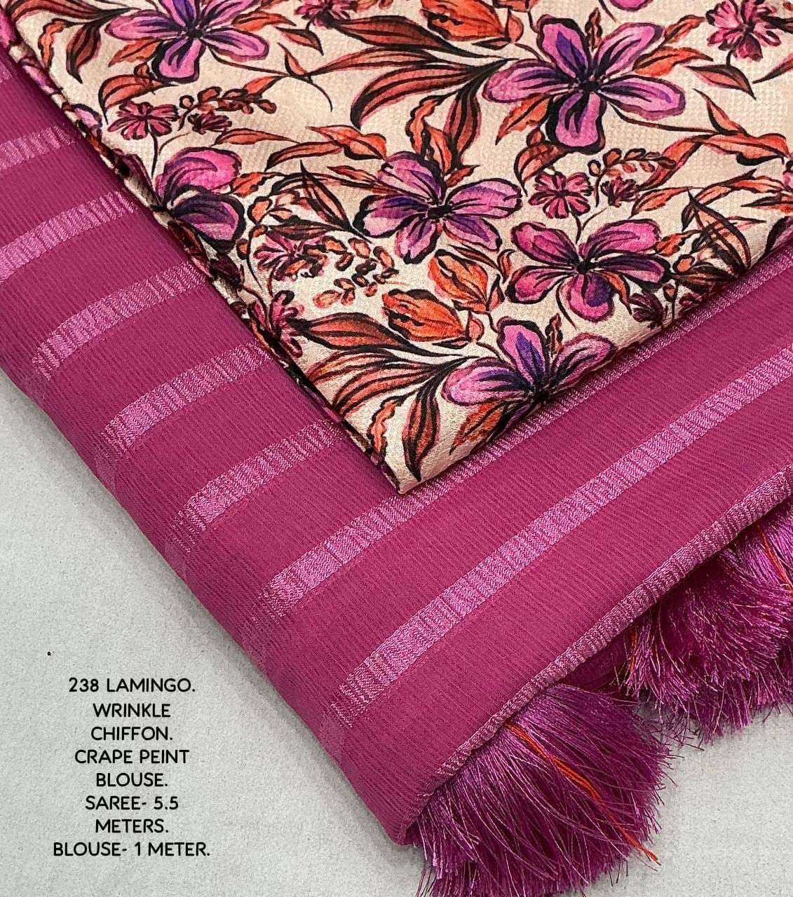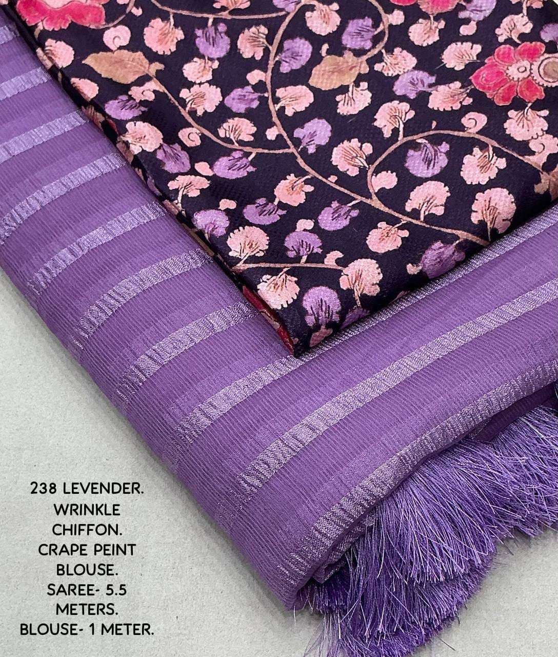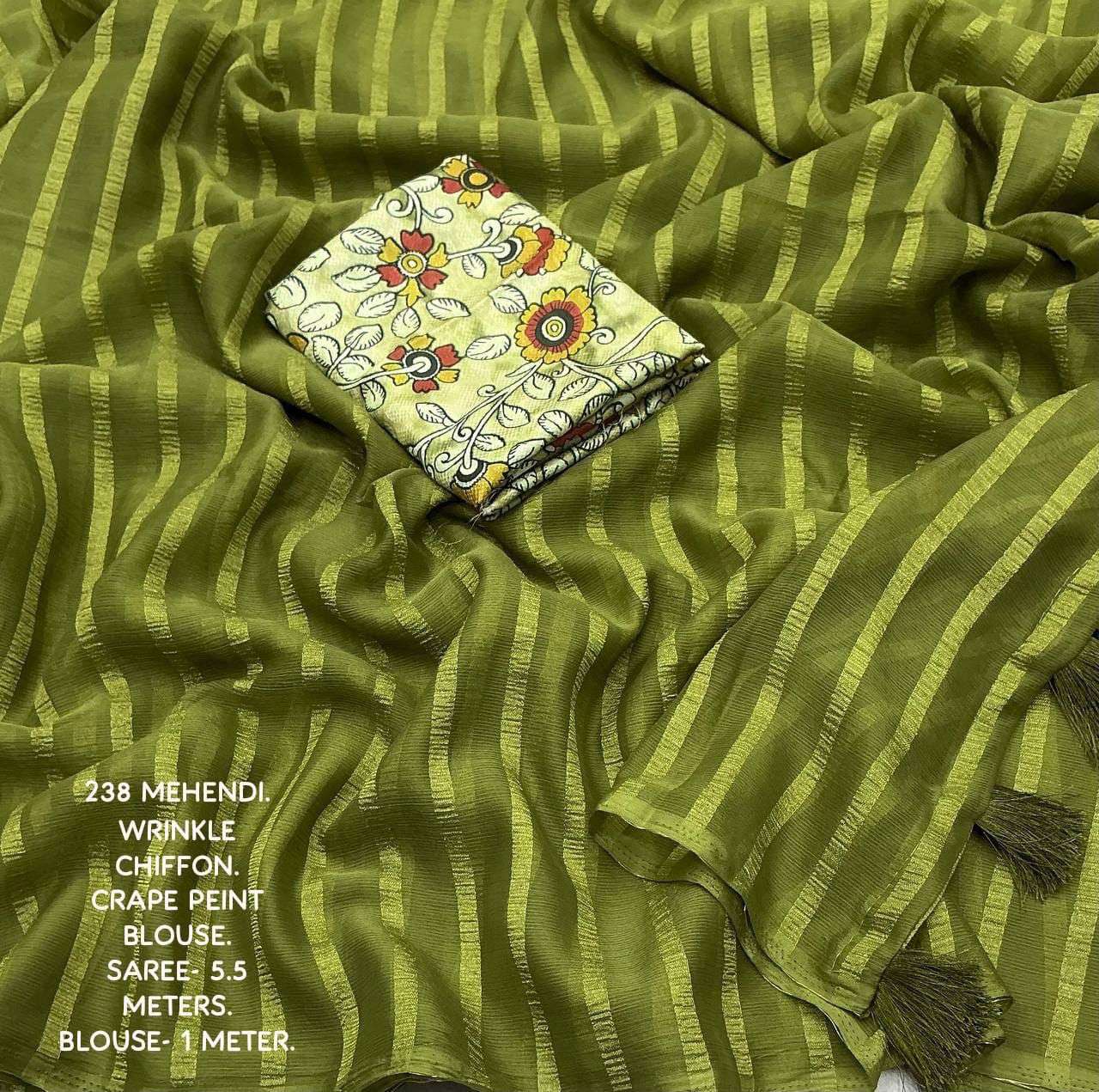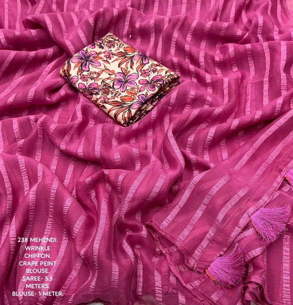 new arrivals New fancy plain saree with printed blouse catalog KC - 238 WRINKLE LININGS. quality- soft chiffon sRee with vertical wrinkle woven linings. Cotton tassles on pallu. Blouse- perfectly matched printed carpe silk blouse. Rate - 499/- +ahip Top trusted quality |