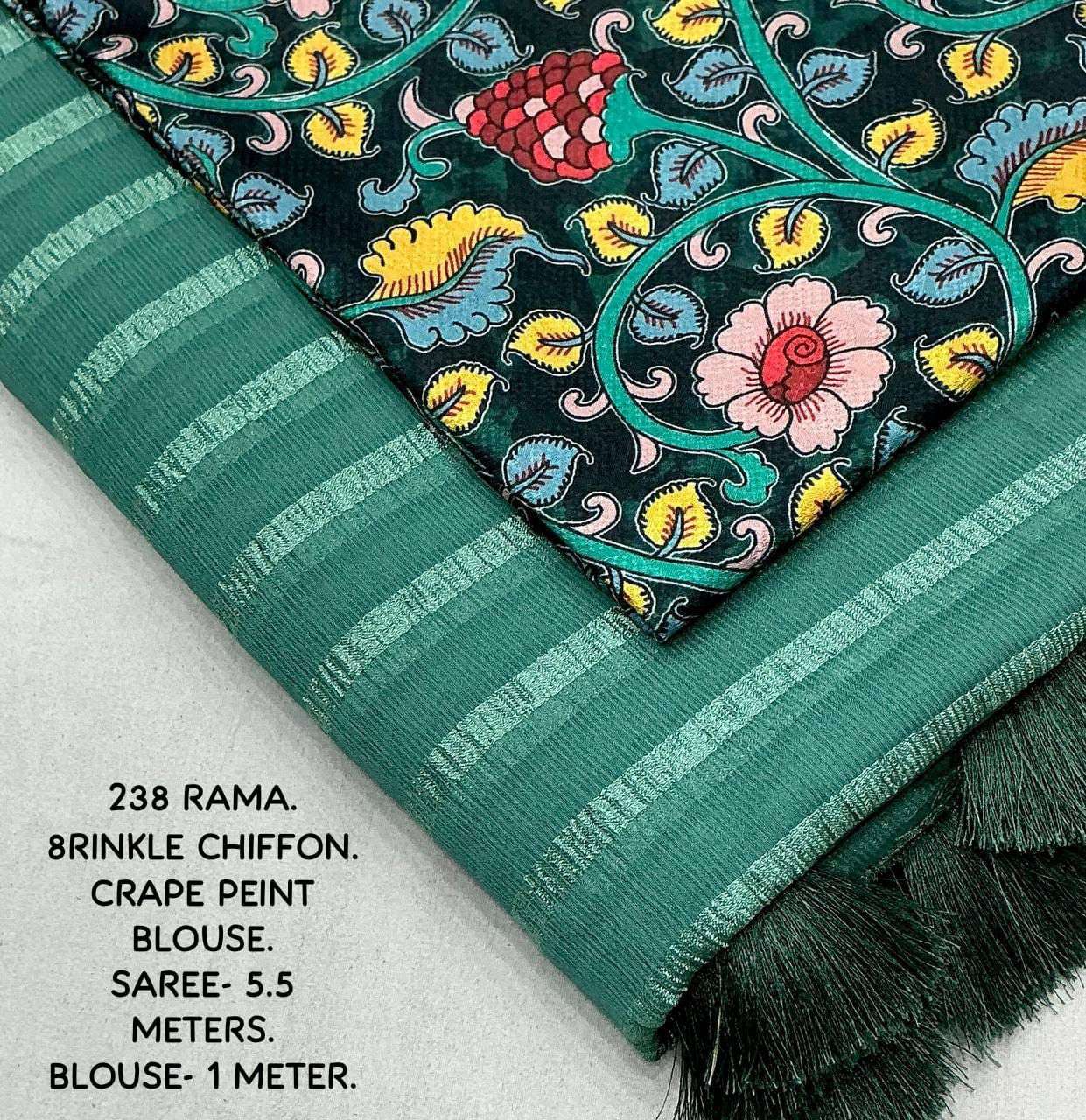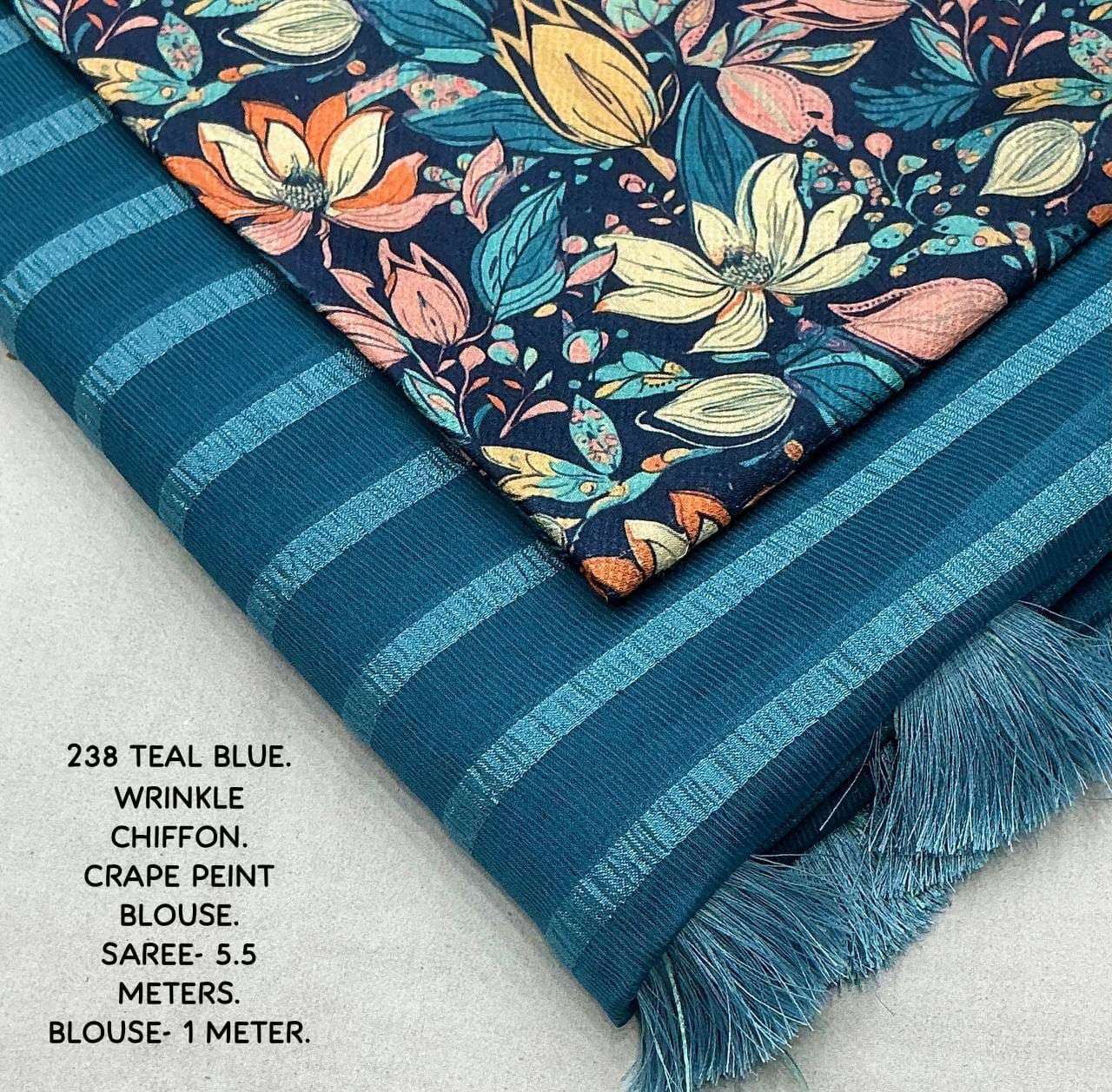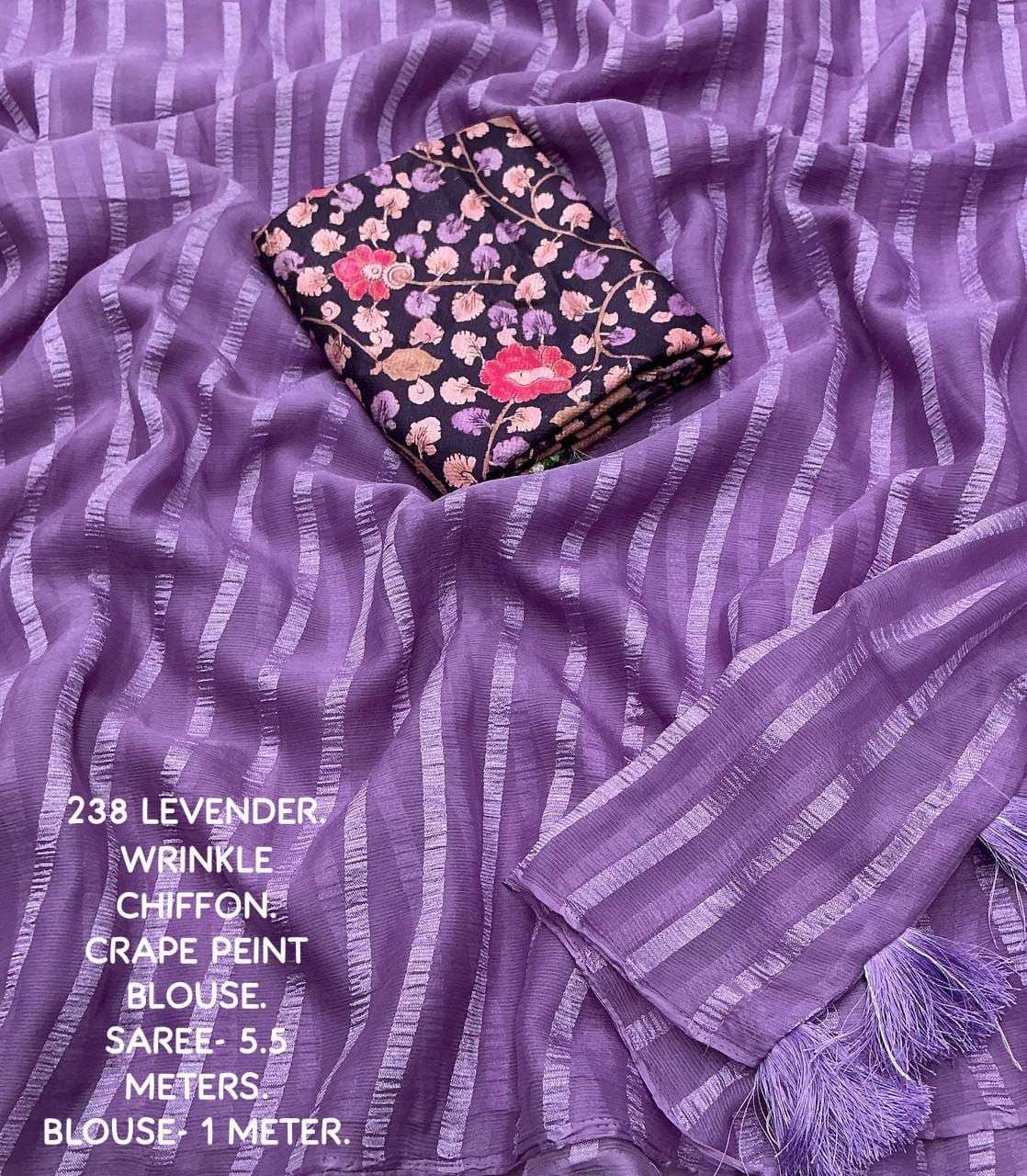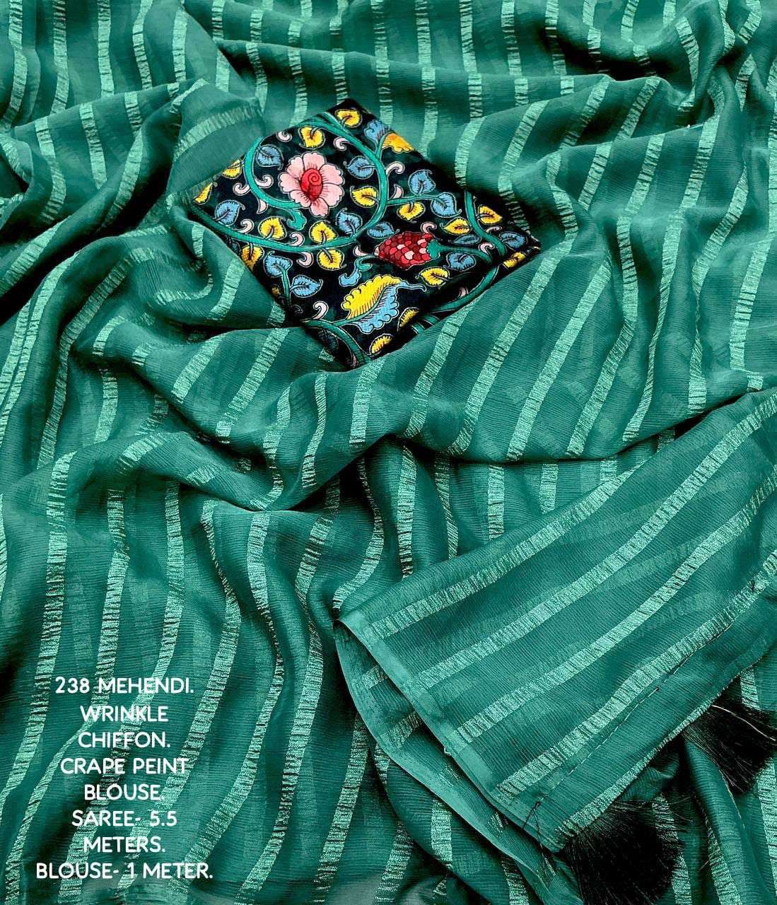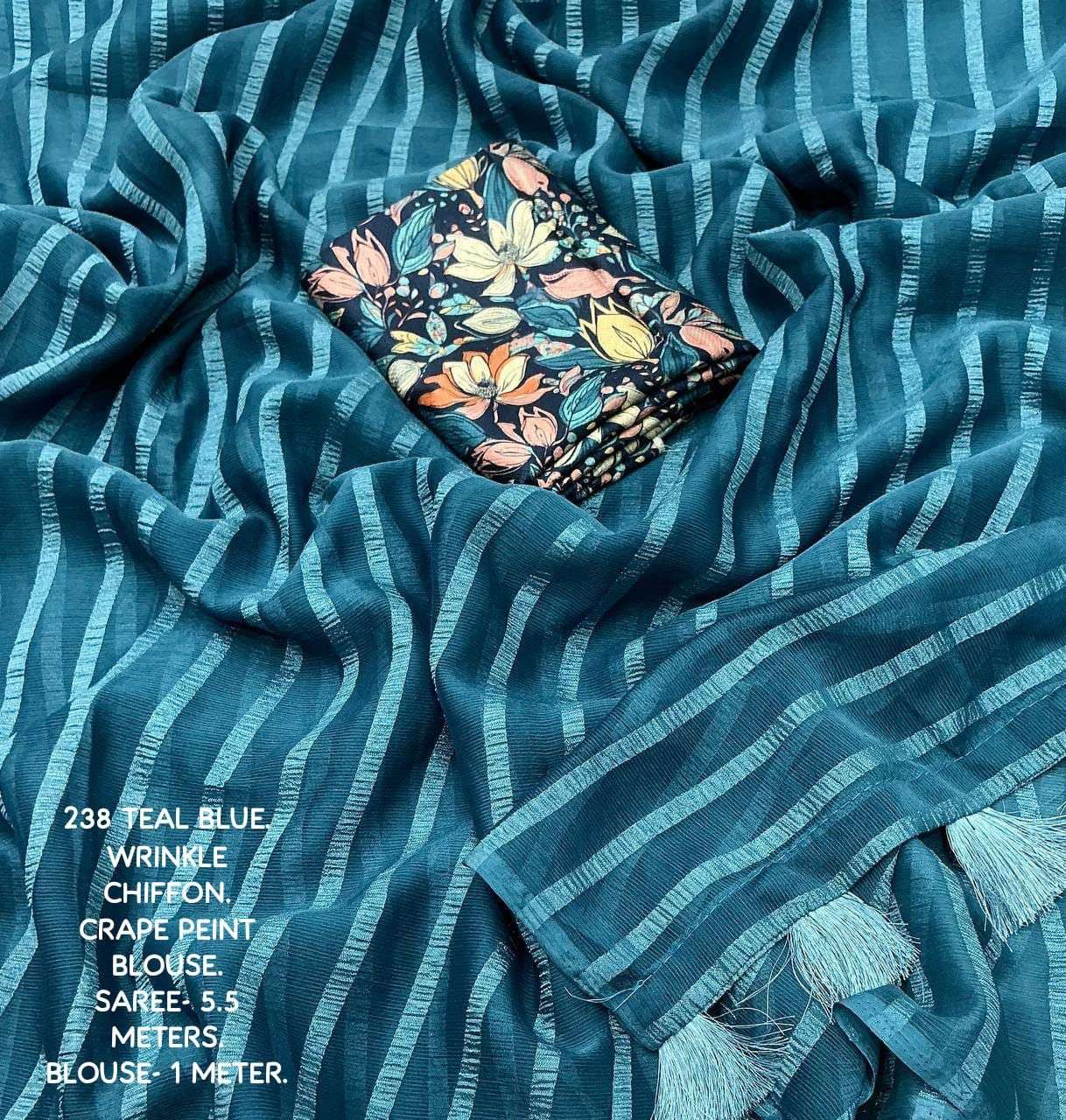 new arrivals New fancy plain saree with printed blouse catalog KC - 238 WRINKLE LININGS. quality- soft chiffon sRee with vertical wrinkle woven linings. Cotton tassles on pallu. Blouse- perfectly matched printed carpe silk blouse. Rate - 499/- +ahip Top trusted quality |