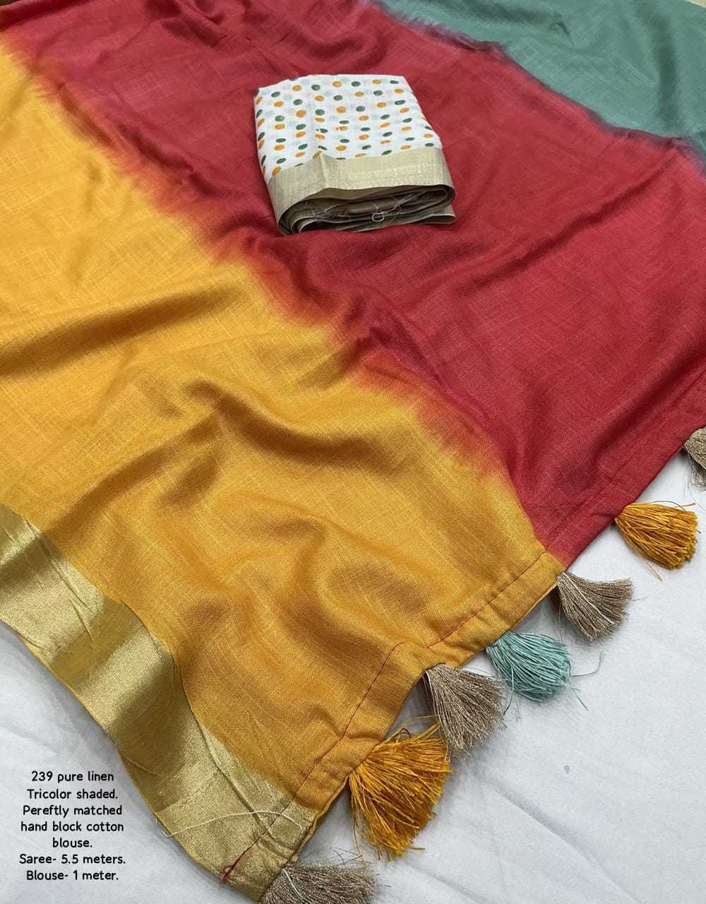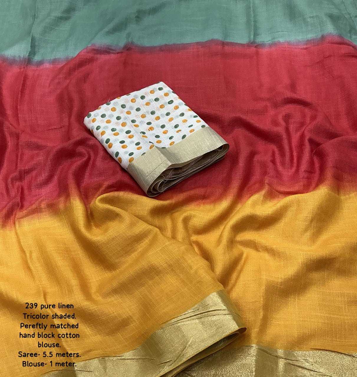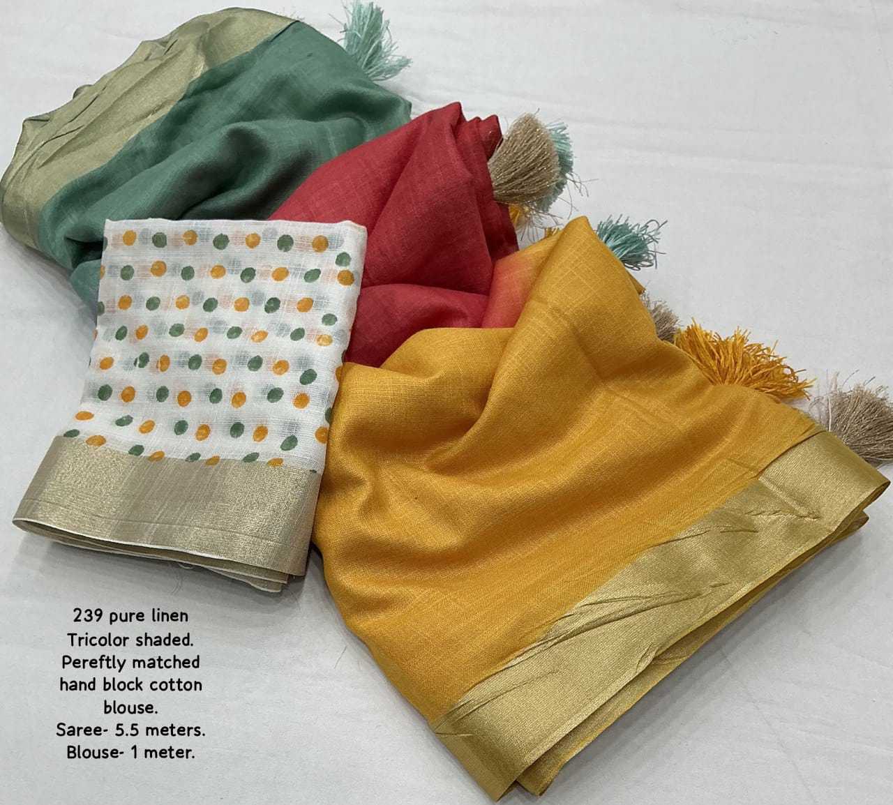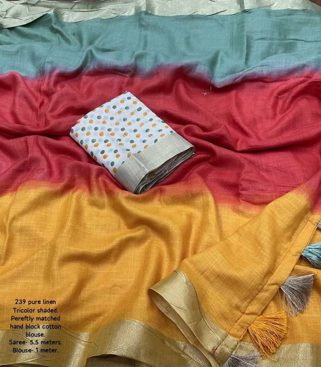new arrivals New premium pure linen single color edition KC- 239 pure trishaded linen. Quality- soft linen saree with zari woven pattu. Three color shaded hand dying. Cotton tassles on apllu. Blouse- white block printed pure linem blouse. Rate - 1350+ship Top trusted quality |