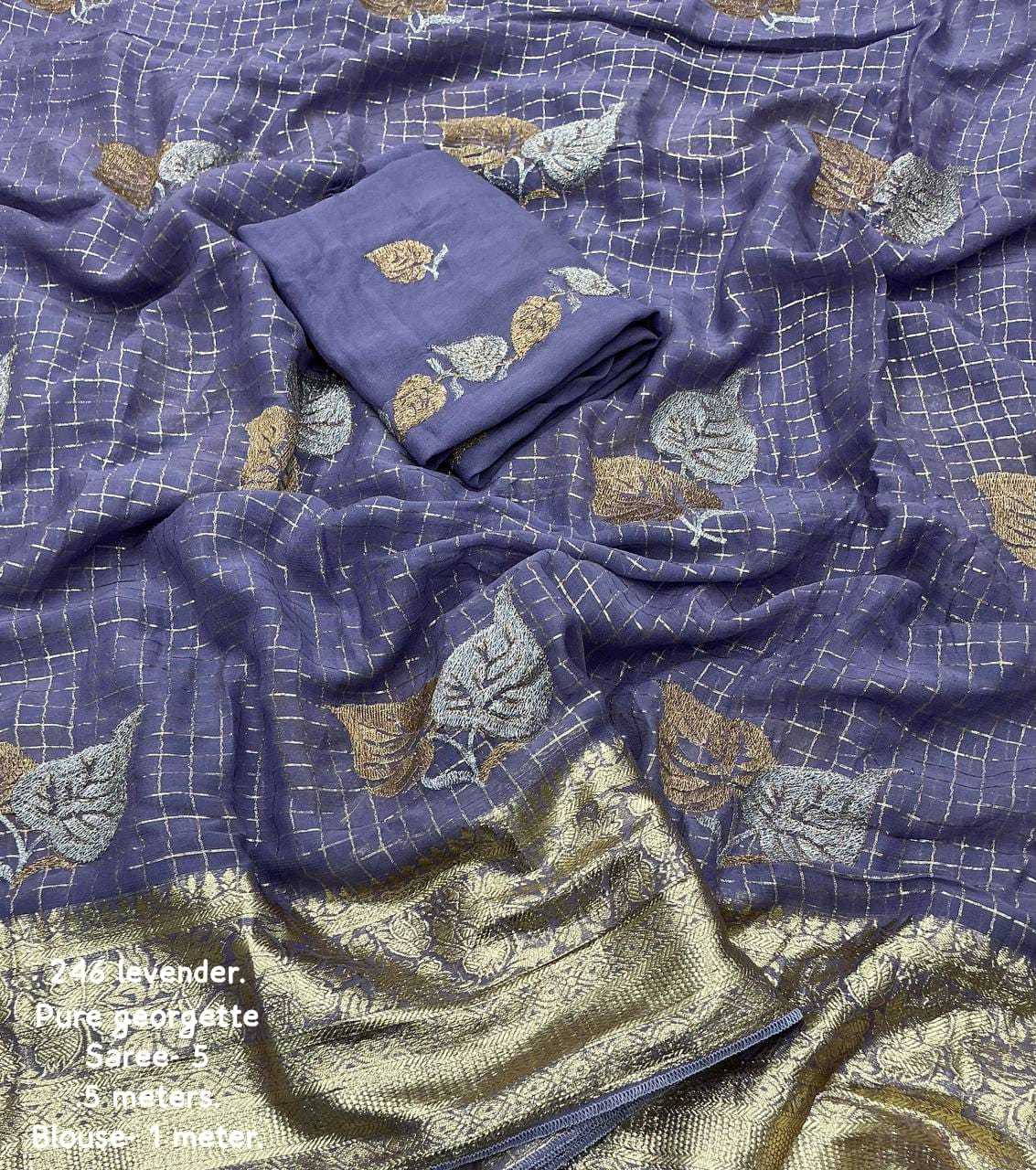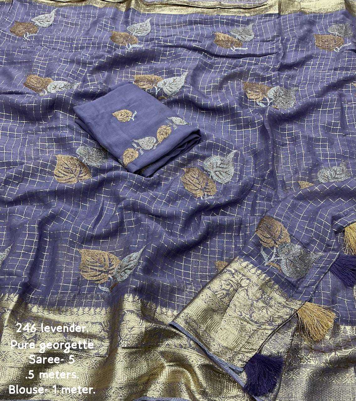 new arrivals New premium georgette chex saree. KC- 246 georgette leaf Quality- pure Georgette saree with zari woven small chex and zari woven border. Silver & gold zari leag emboridary. Cotton tassles on pallu. Blouse- perfect matched tye and dye pure georgette blouse with emboridary. Rate - 1500+ship Top trusted quality |