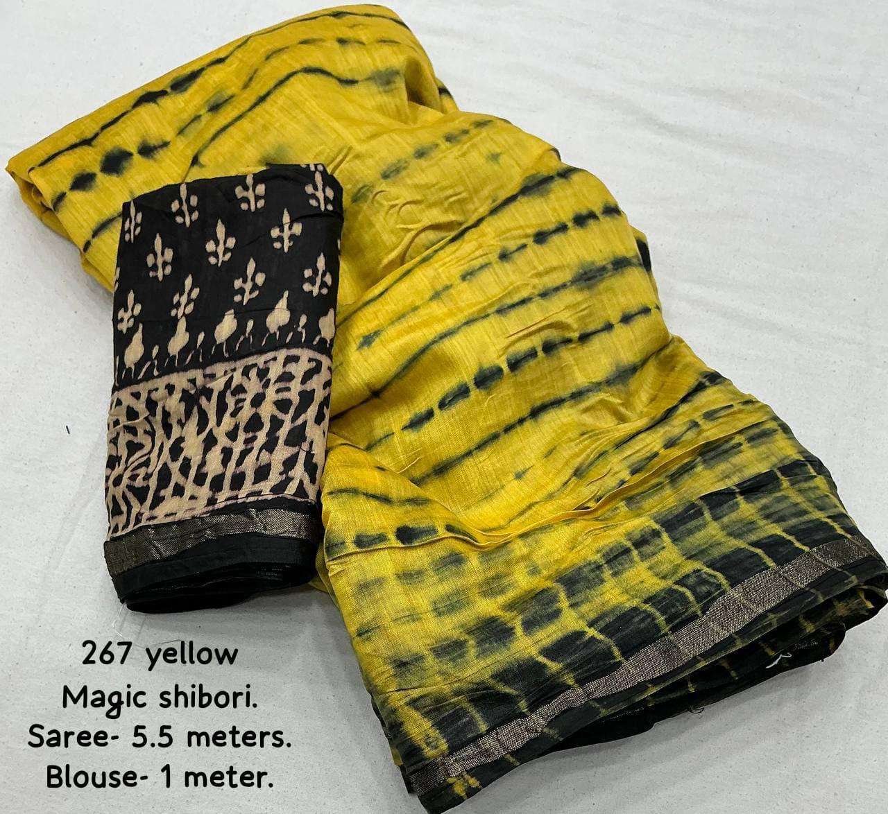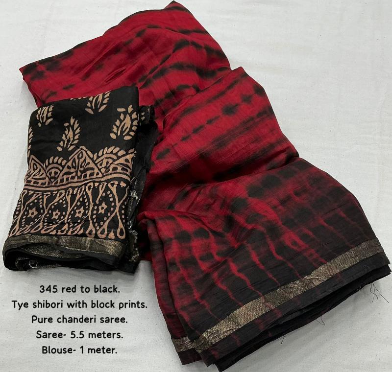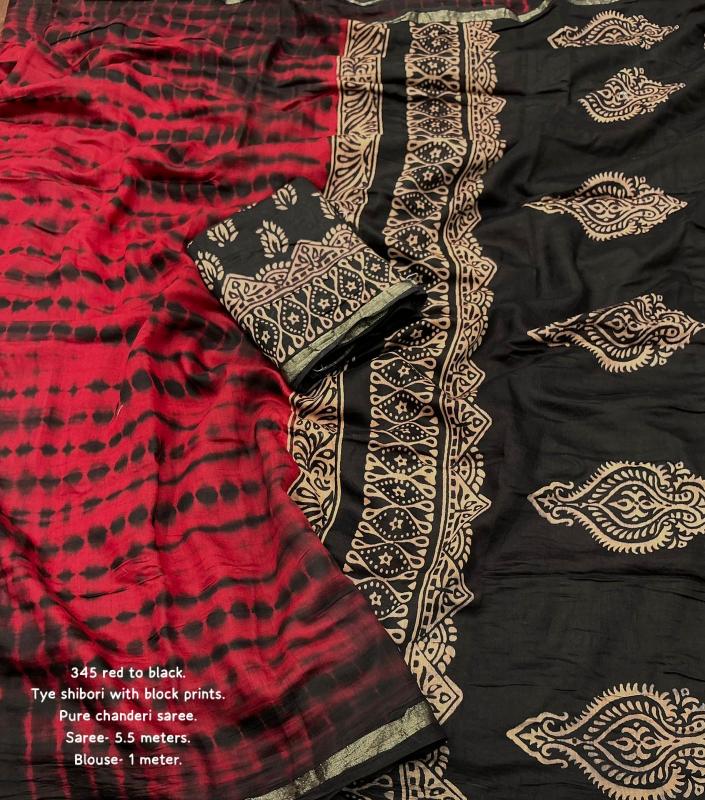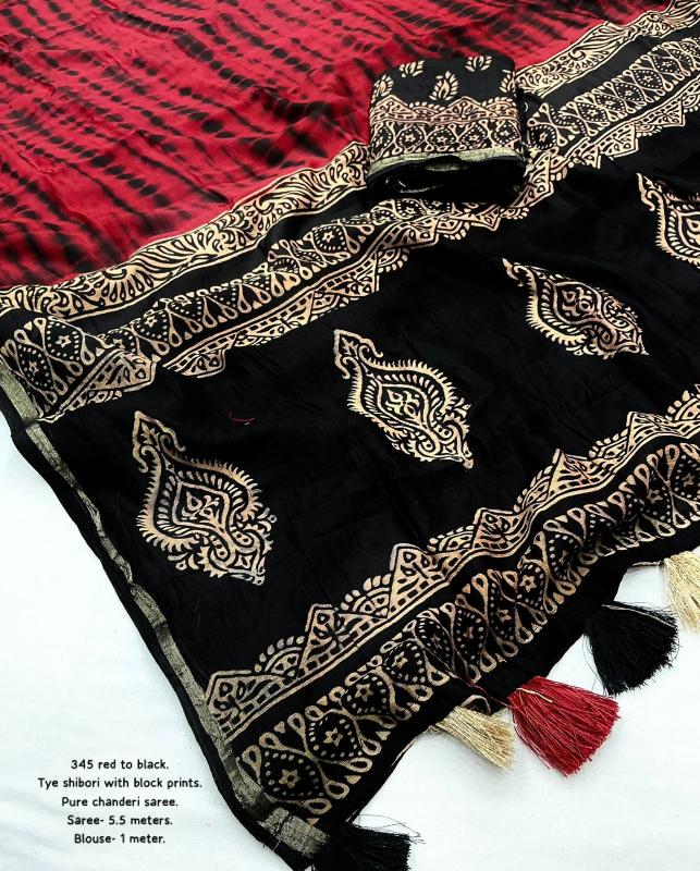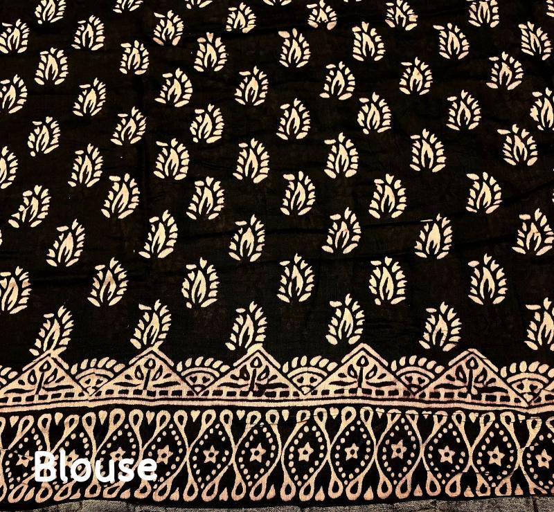 kc - 267 MAGIC SHIBORI. quality- pure chanderi cotton with zari pattu woven border. Tied and dyed (completely hand crafted shibori) with black big block pallu. Accessoried with cotton tassels. Blouse- contrast black chanderi cotton with block prints. Rate - 1300+ship Top trusted quality |