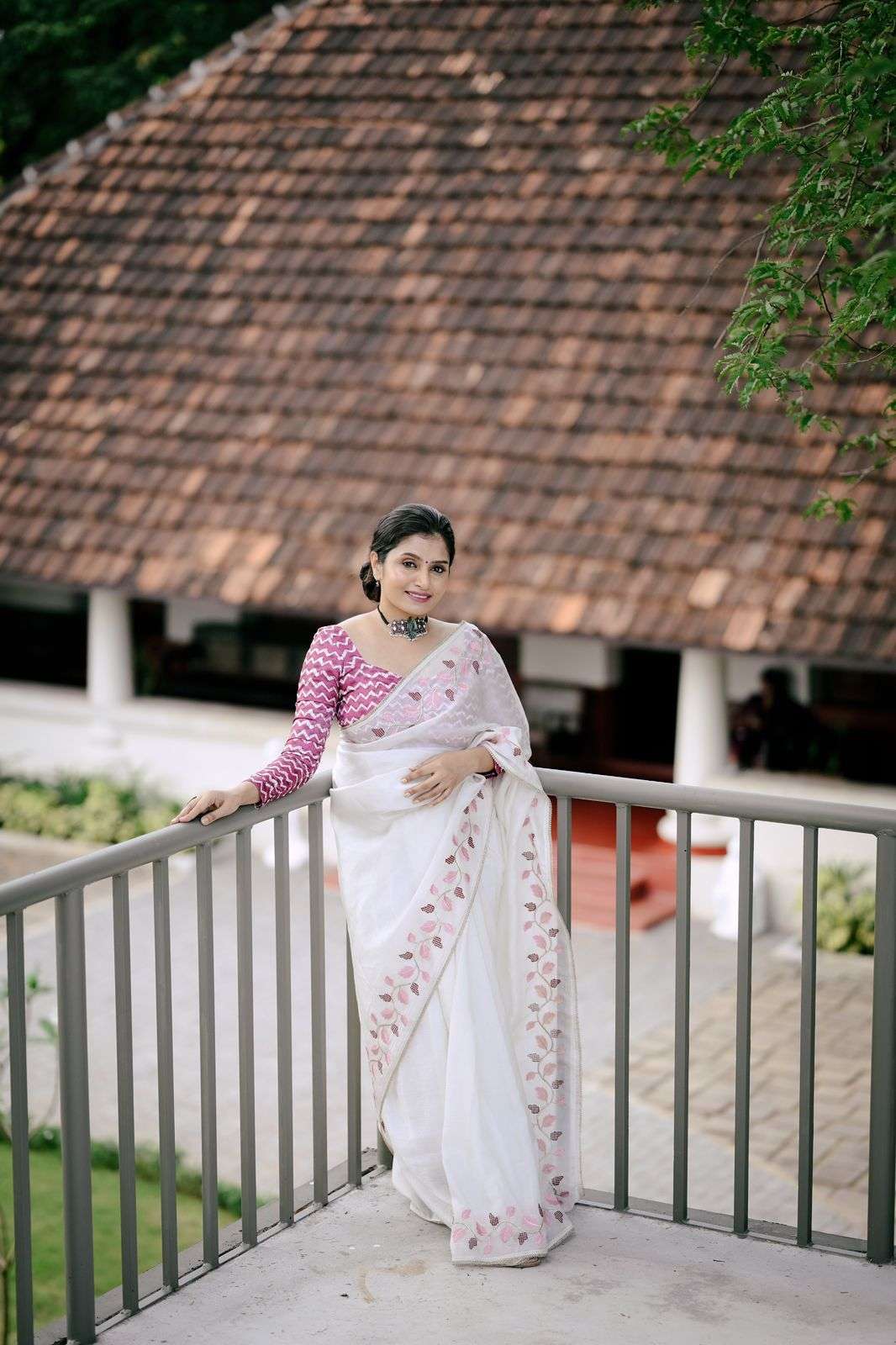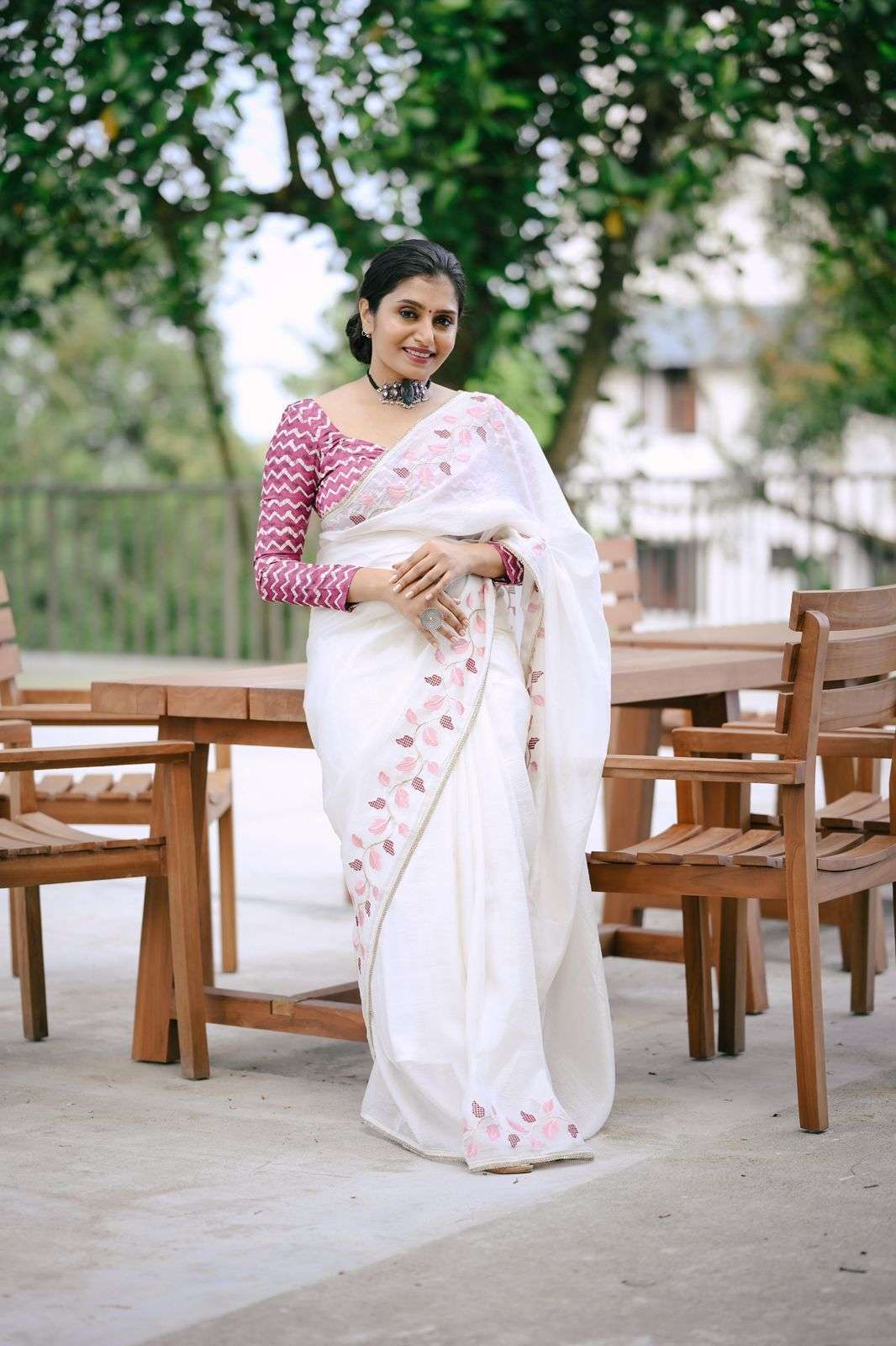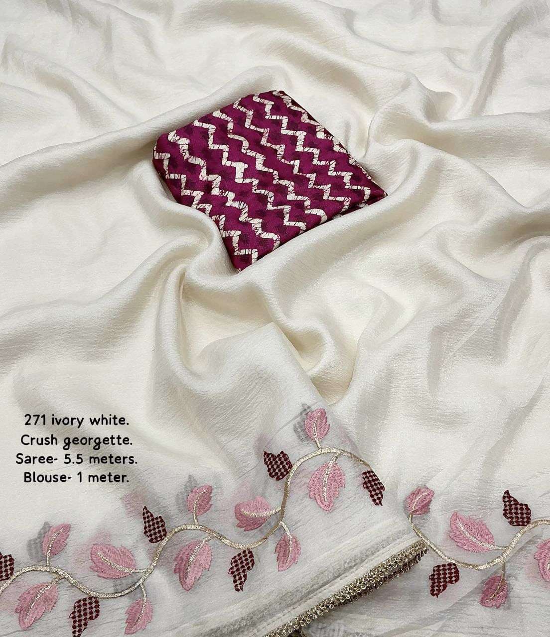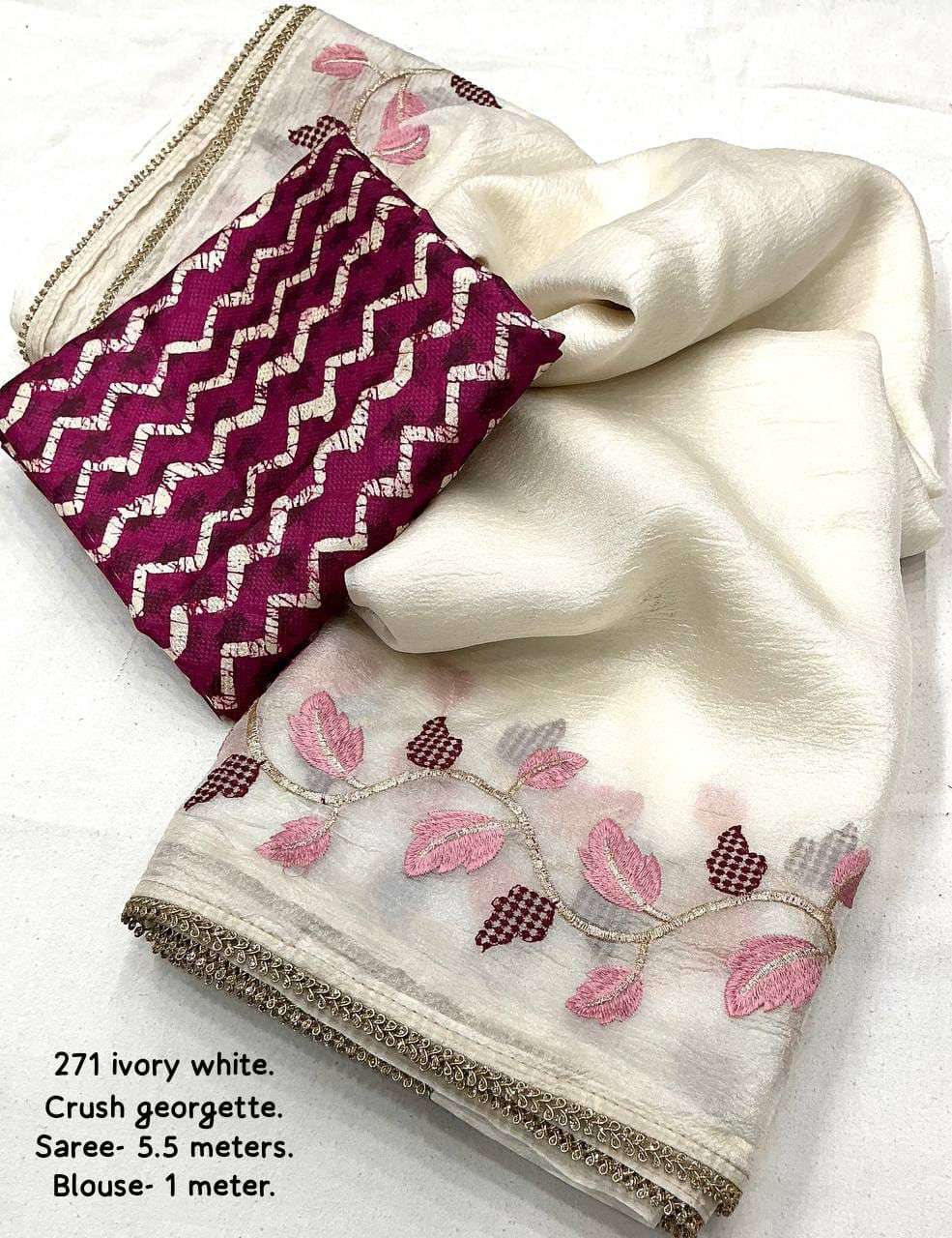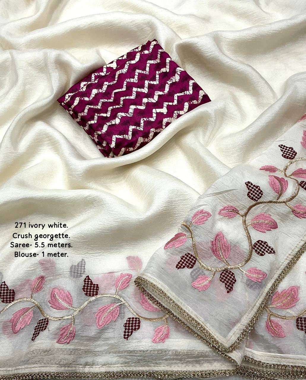new arrivals New premium single color edition deaigner saree KC- 271 white leaf. Quality - soft crush georgette saree with leaf design emboridary c-pallu with patched lace border Blouse- perfectly matched batik style digital printed crape silk. Rate - 1099+ship Top preimum quality |