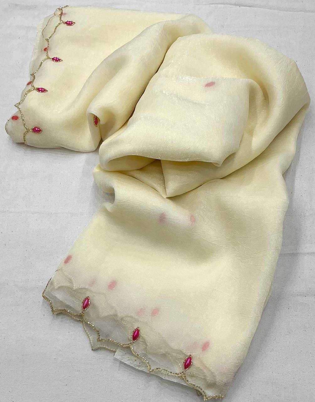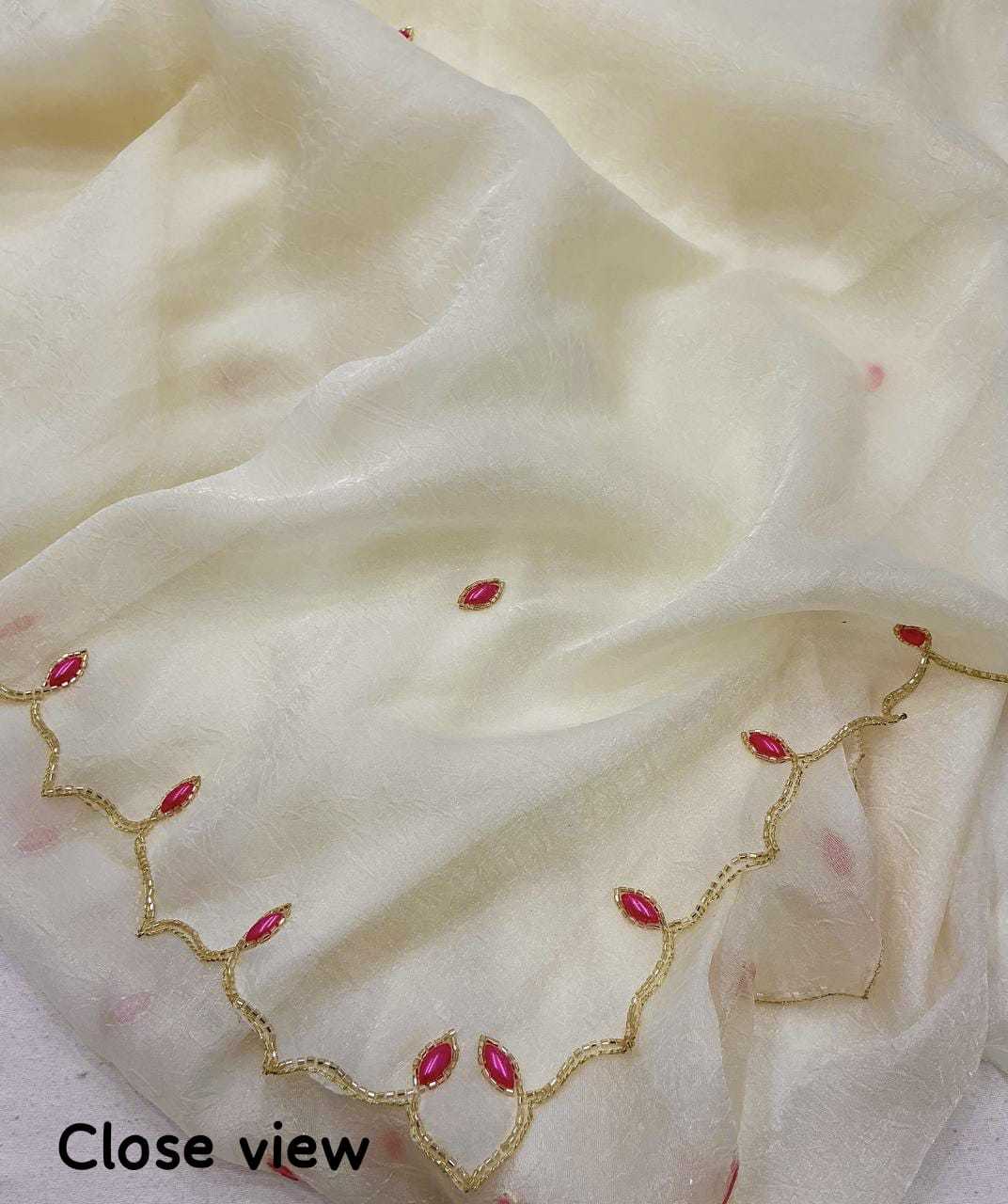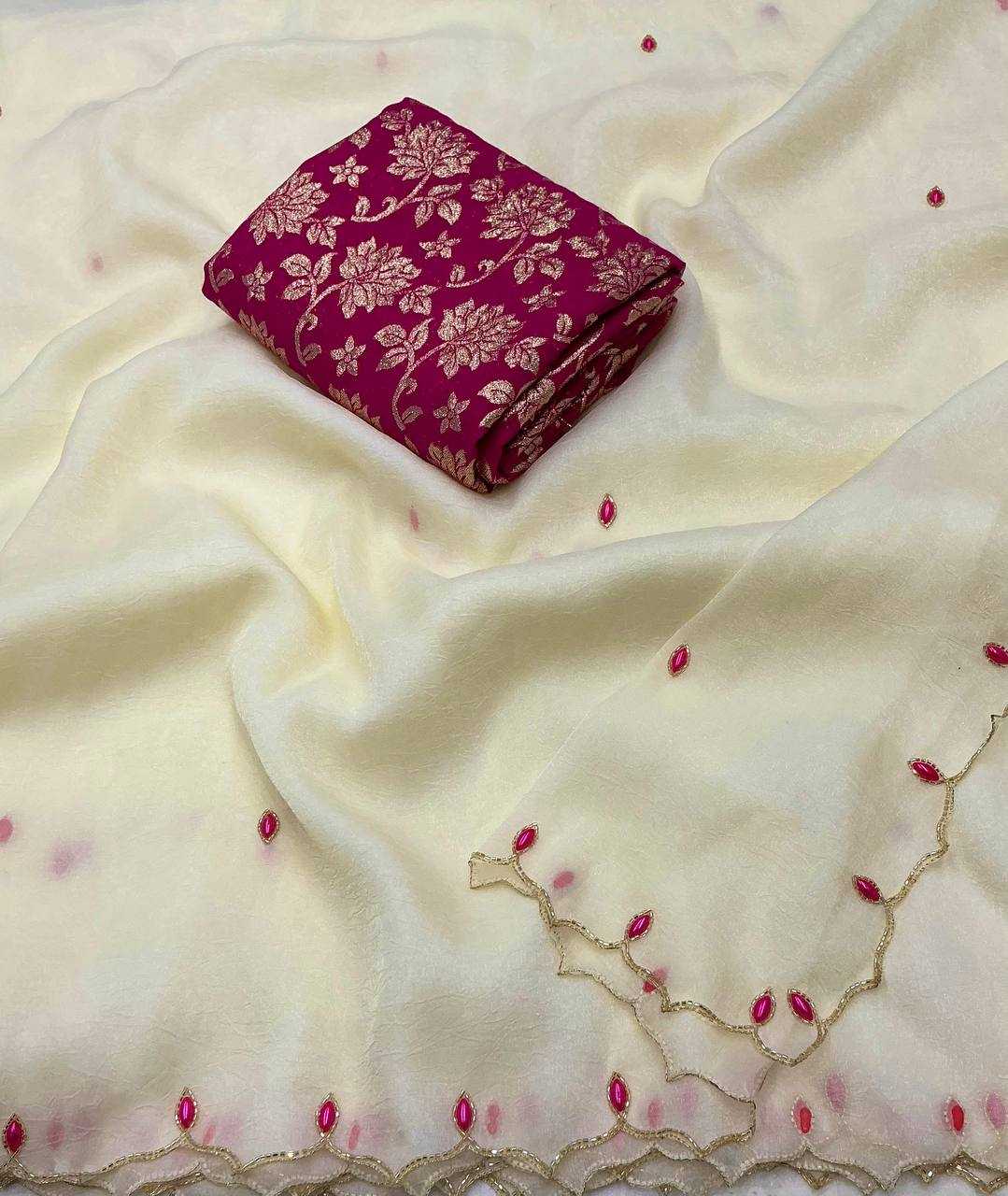 new arrivals New single color edition in handwork KC - 273 pink pearl. Quality- soft crush georgette saree with beautiful handwork and cut work design. Hand sticked rani tilak style stone work. Blouse- contrast tye and dye banarsi zari woven zaal blouse. Rate - 2000+ship Top premium quality |