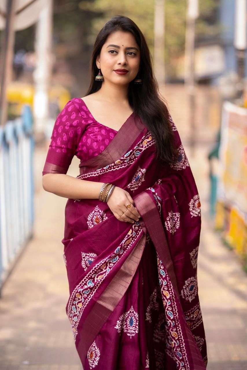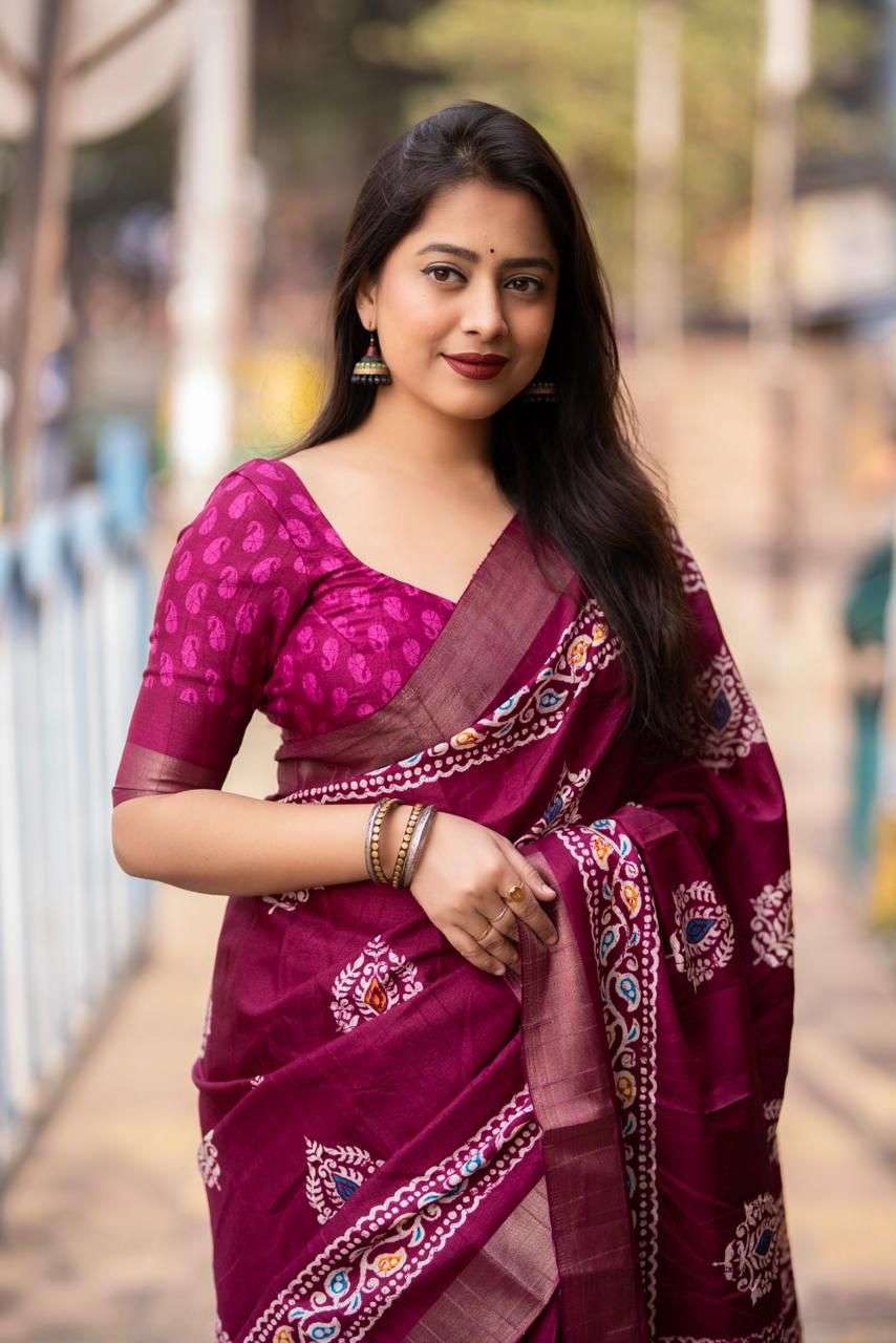 BEST SELLER BACK IN STOCK One of best selling printed catalog in look. KC - 28 KC - batik handloom (vol-3) Quality- soft silk slub woven saree with batik print deaign. Blouse- runing batik printed blouse. Rate- 520+ship Top trusted quality |