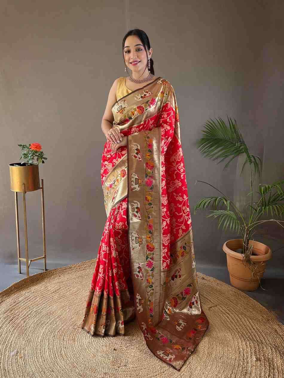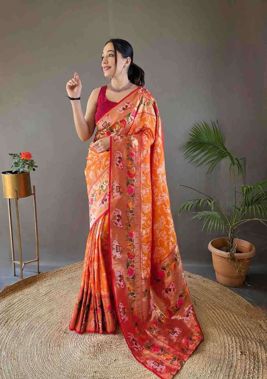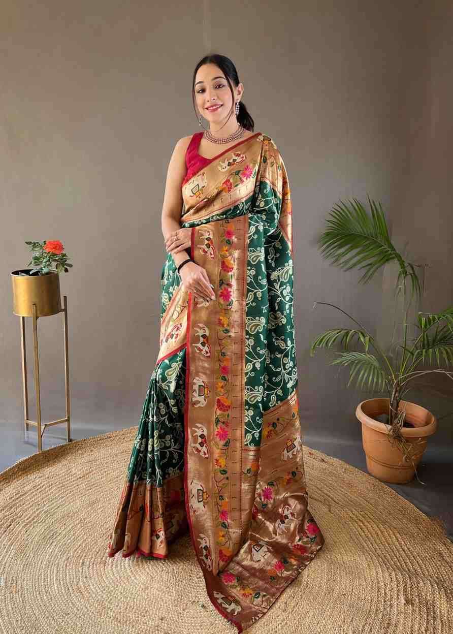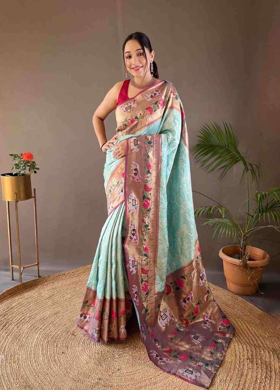 FRESH ARRIVAL❤️ KC-3028 Beautiful Lucknowi Concept weaving saree with Paithani and Patola fusion Taste with rich Meenakari pallu and elegant border having Natural Concept with rich Golden Zari Blend along with contrast blouse. Price :-1799 |