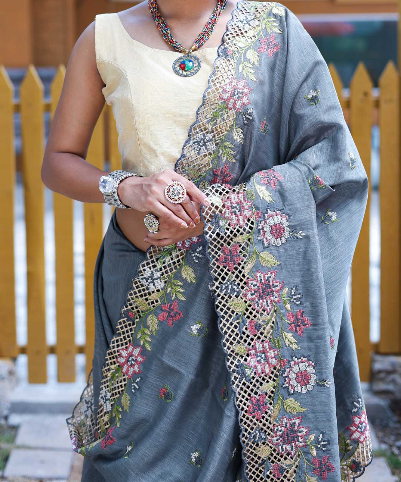 New Catalogue ❣️❣️❣️ 😍Exclusive range of product.😍 KC-3046 Pure marks silk saree with all over beautiful contrast embroidery work and motifs with cutwork border. Price :- 1599/- |
