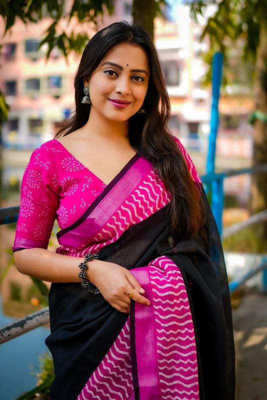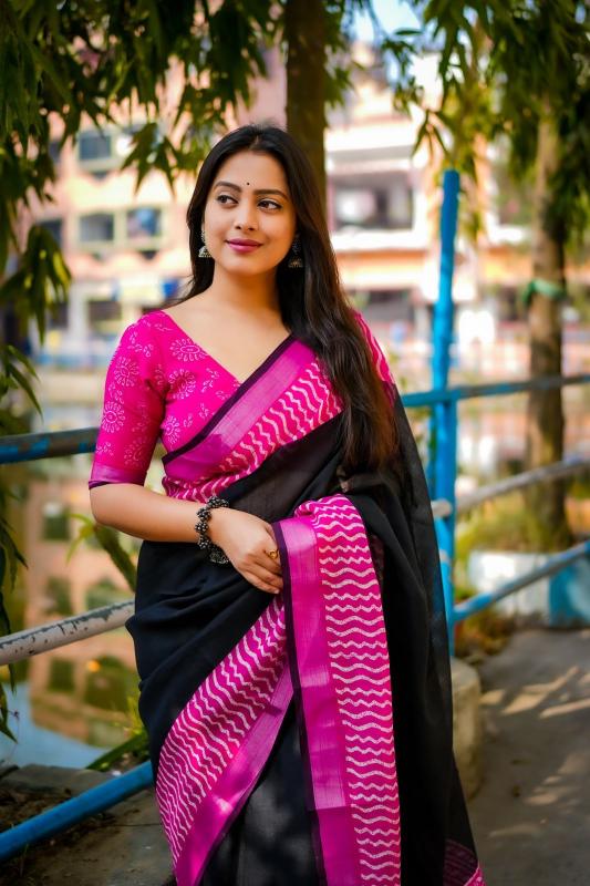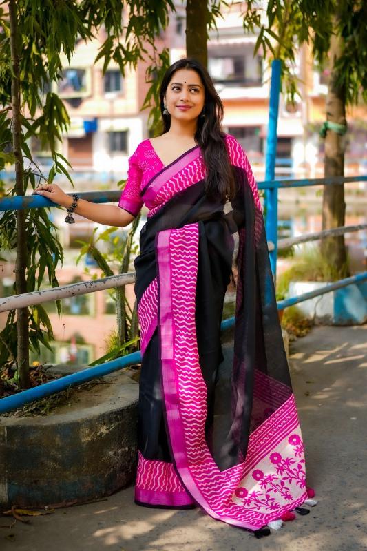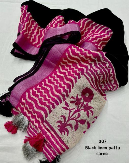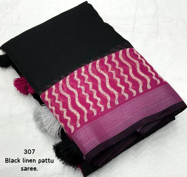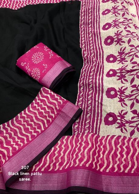 new arrivals New single color black edition linen KC 307 black linen. Quality - soft linen saree with pink contrast pink prints. Zari woven border with black pattu border. Running linen blouse with contrast prints. Rate - 570+ship. Top trusted quality |