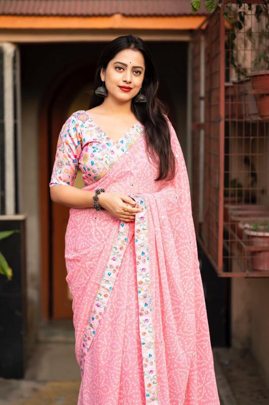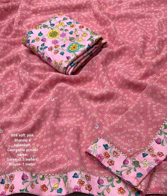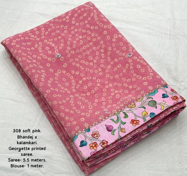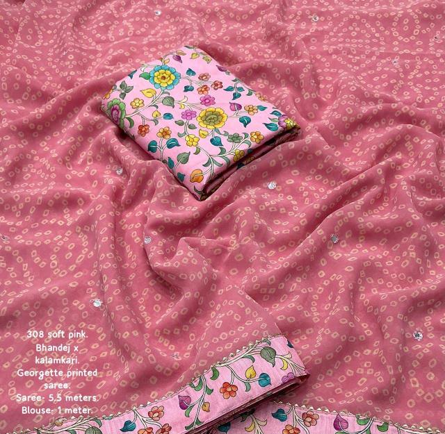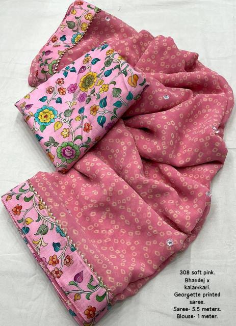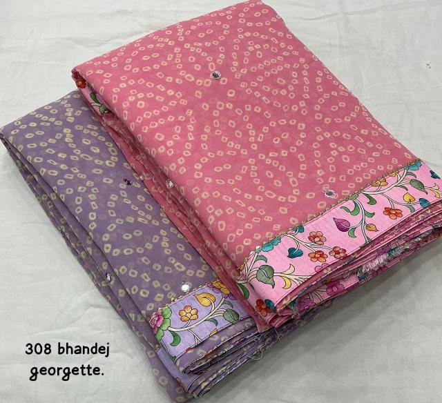 new arrivals New fancy georgette saree BHANDANI X KALAMKARI. KC- 308 bhandan georgette. soft georgette saree with bandej prints and perfectly matched kalamkari patched border. slub Bangalori digital printed blouse Rate - 699/- +ship Top trusted quality |
