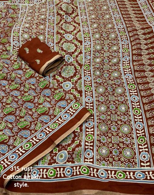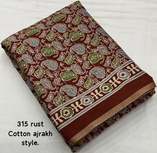 NEW ARRIVALS New ajrakh style peinted catalog COTTON X AJRAKJ kc - 315 ajrakh cotton. quality- soft cotton feel saree with zari woven border. Ajrakh prints Blouse- running cotton feel blouse. Rate- 620/-* +ship Full length 6.30 meters. Top trusted quality |