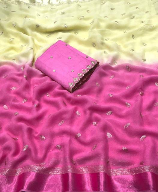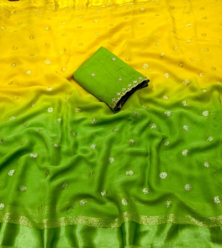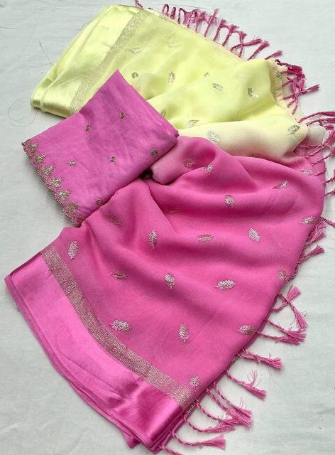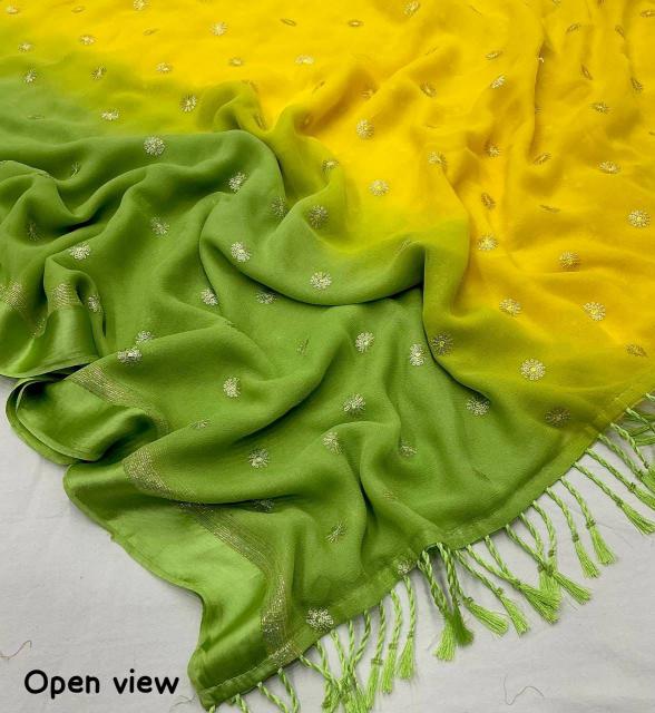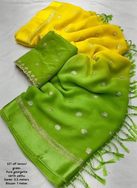 new arrivals New pure georgette sartin pattu saree. Beautiful half half. Olor saree. kc - 321 jaipuri georgette. Pure georgette saree with sartin pattu woven border. Sequence embroidery allover. Half half dying. Murli tassles on pallu. Perfectly matched pure chanderi embroidery blouse with cutwork selvees. Rate - 1350/- +ship Top premium quality |