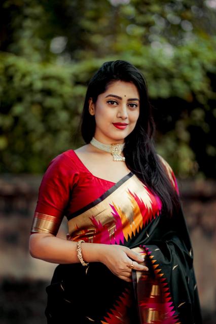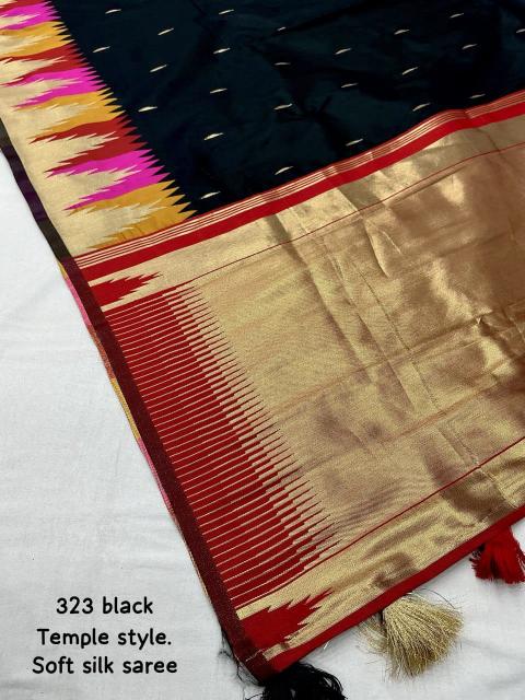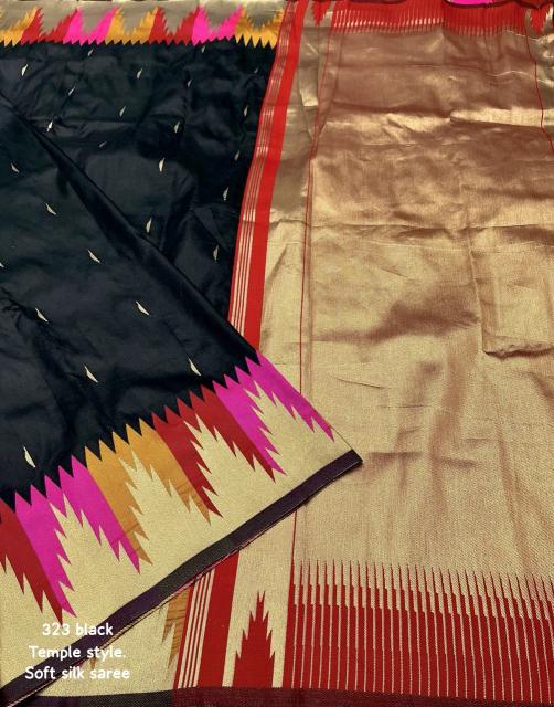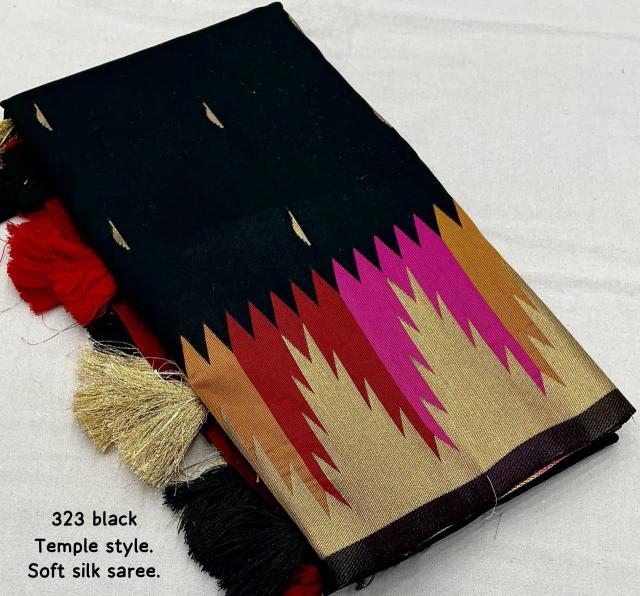new arrivals New soft silk single color edition KC- 323 temple black. Soft silk temple woven design zari and multicolor. Cotton tassles on pallu. Contrast marron soft silk blouse. Rate -1350+ship Top trusted quality |