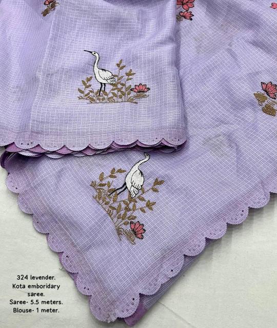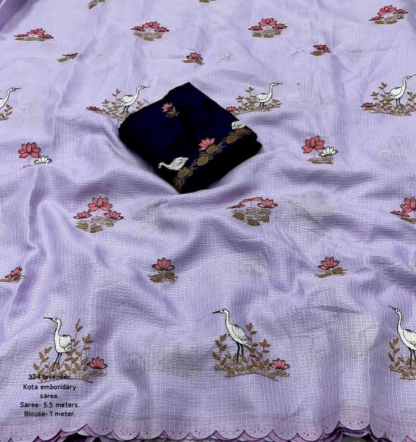 new arrivals New fancy kota embroidery saree KC - 324 kota swam. Soft kota doria saree with bird embroidery design. Cutwork style border. Contrast uptone phantom emboridary blouse. Rate - 850+ship Top premium quality |