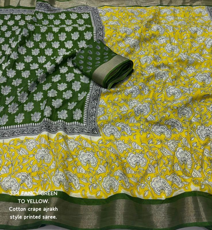 top trending New fancy ajrakh style printed saree. KC - 334 kusum ajrakh. Fancy green to yellow. Soft cotton crape ajrakh style printed saree. Runing small printed blouse. Rate - 499/- +ship Top truanted quality |