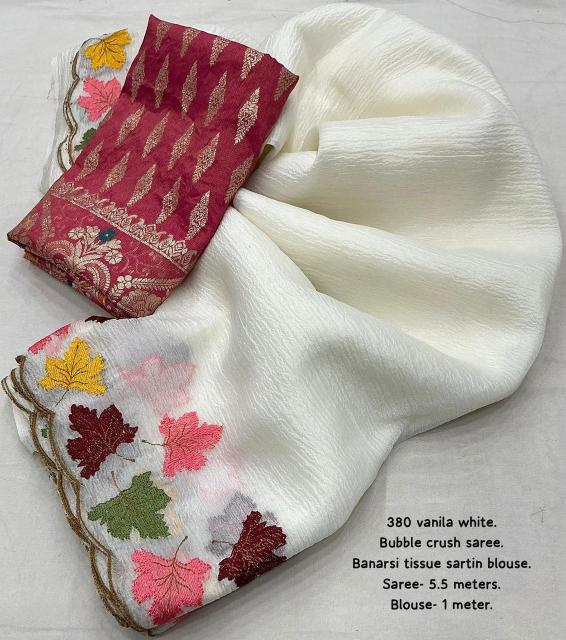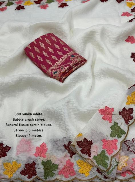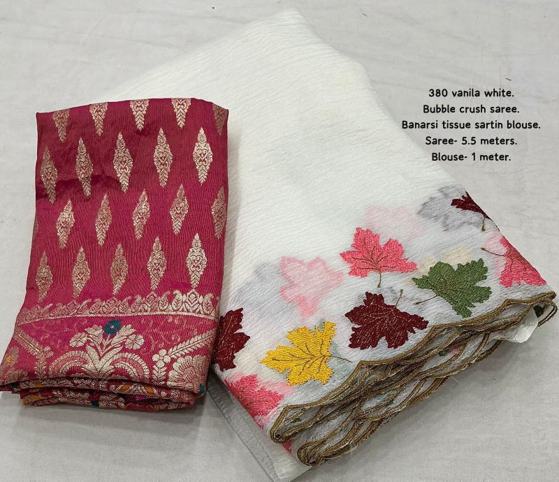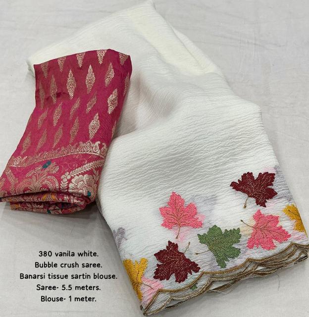 new arrivals New addition to our best selling crush saree. Single color edition. kc - 380 mapple crush. Sodt bubble crush saree in vanila white color. Mapple leaf embroidery c-pallu with cutwork. Beautiful pure banarsi tissue silk zari woven blouse. Rate - 1450+ship Top premium quality |