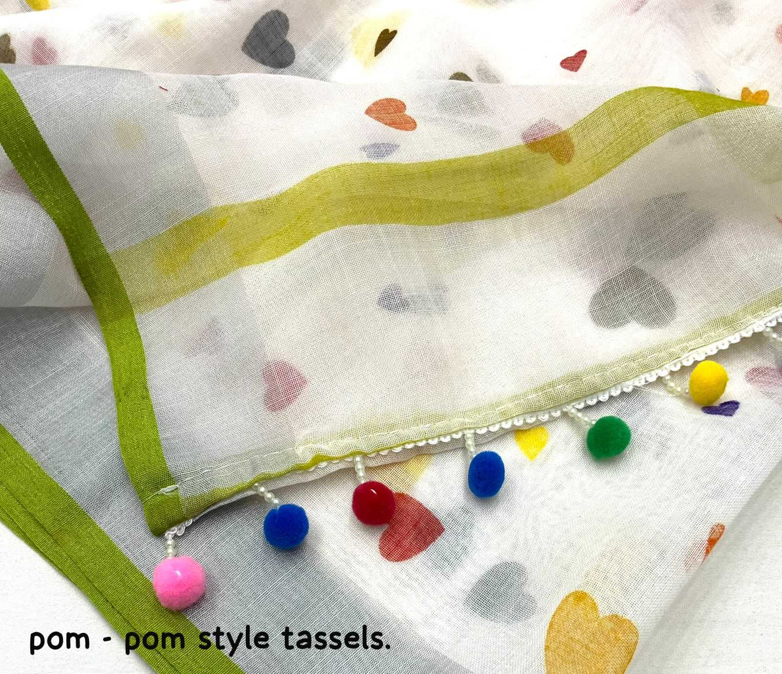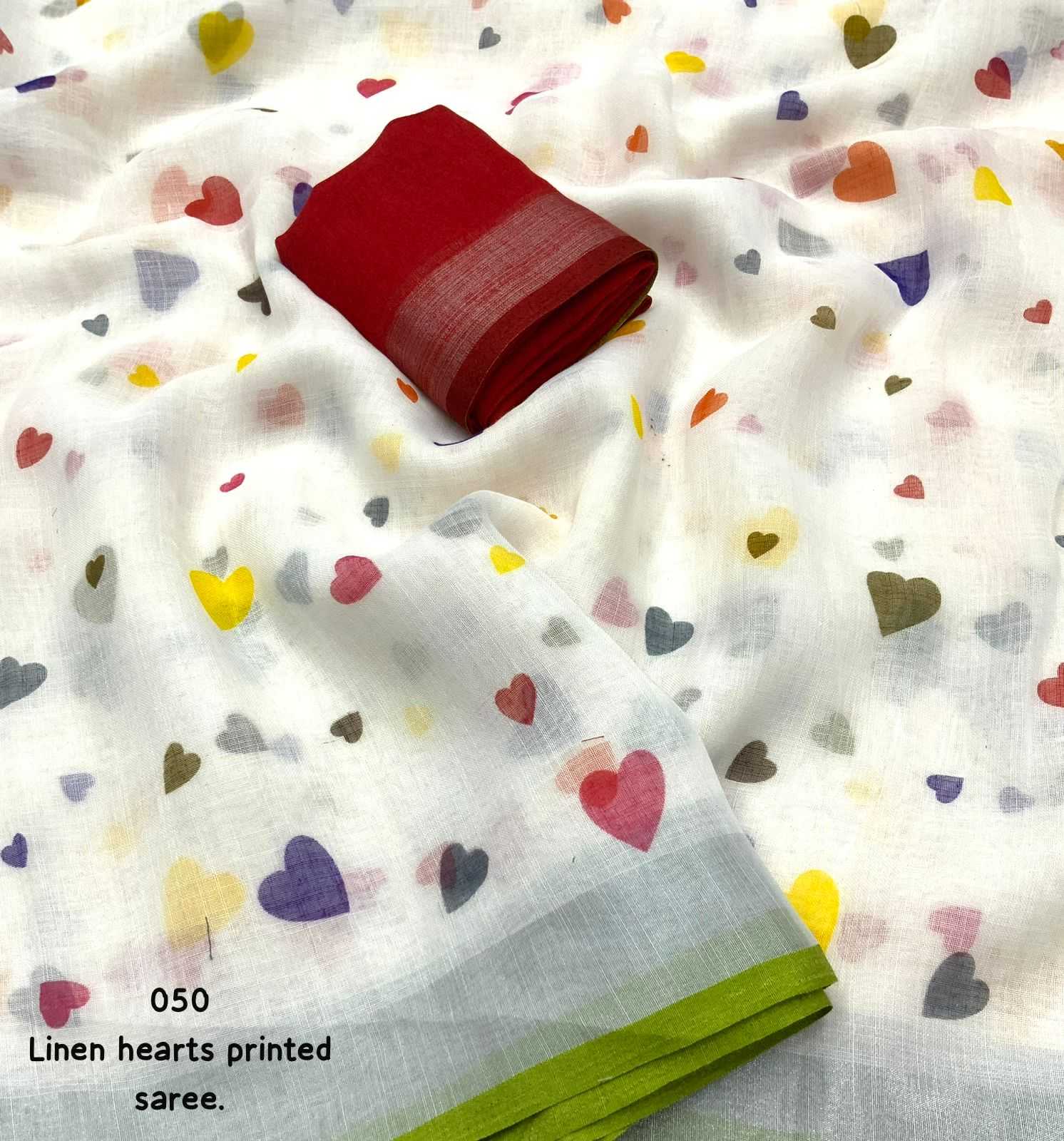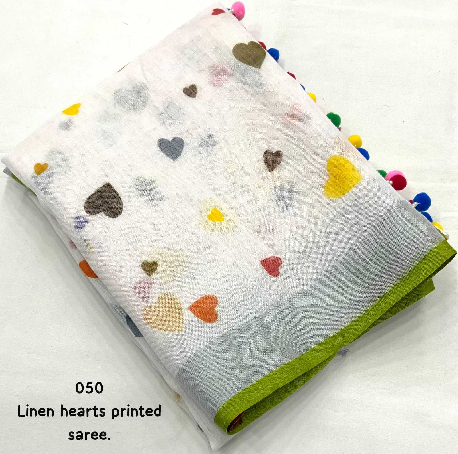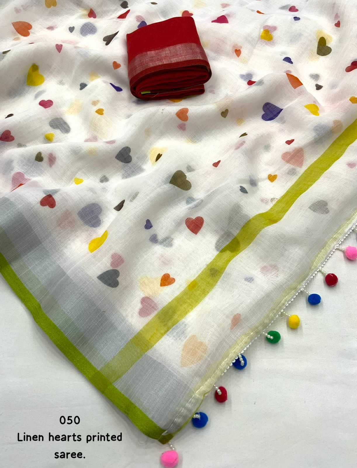 new arrivals New single colour edition in our best clothing. Linen × herats KC- 050 Quality- soft linen saree with silver and mehendi weaving broder. Multi colors heart design prints on white ground. Pom-pom fancy jumkas which gives sober linen look. Blouse - contrast red linen blouse. Rate- 599+ship Top trusted quality |