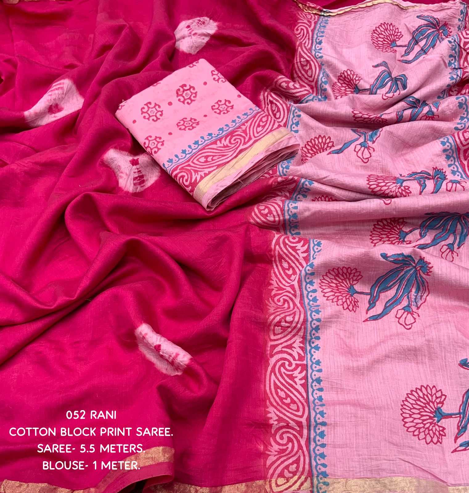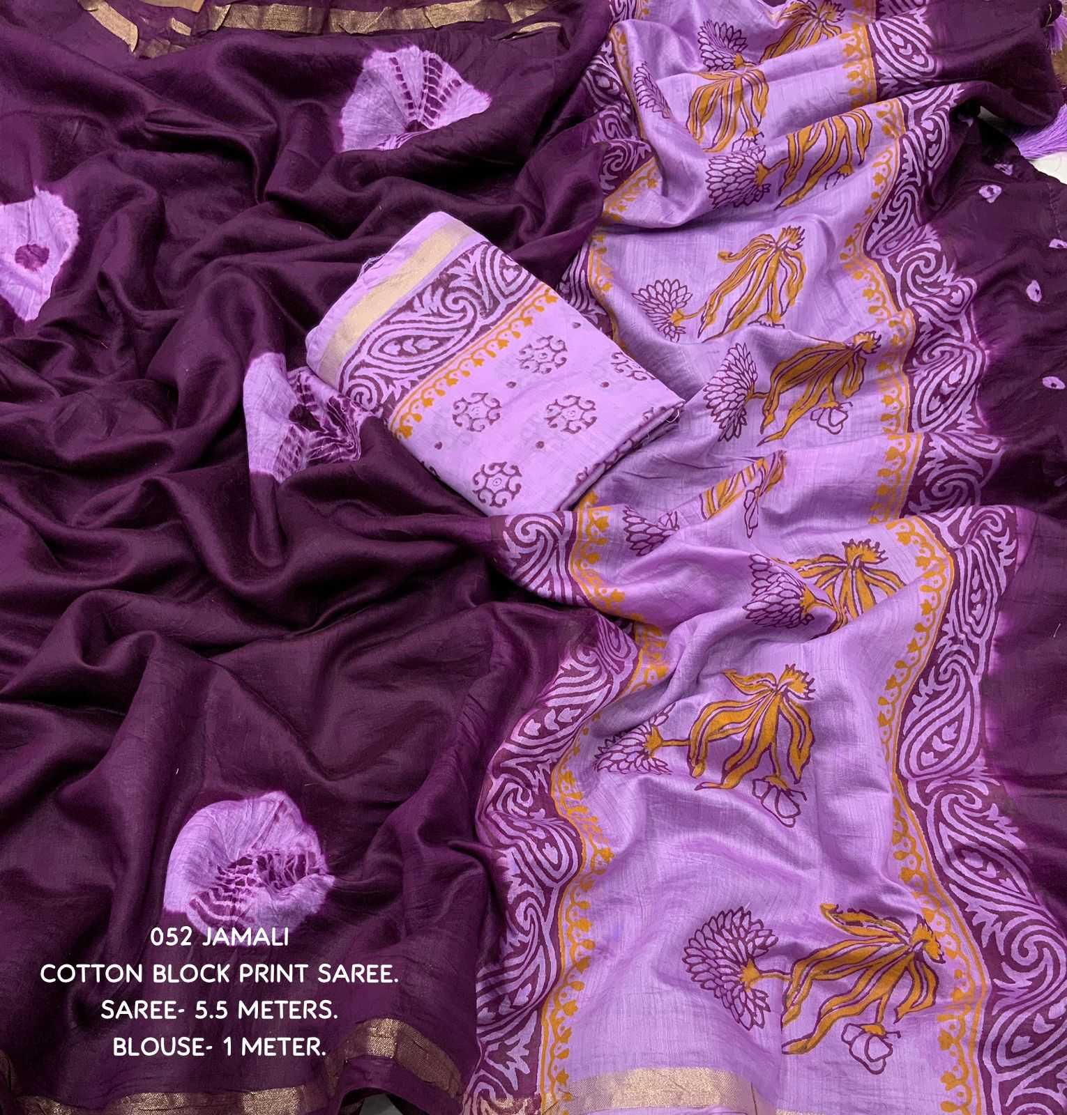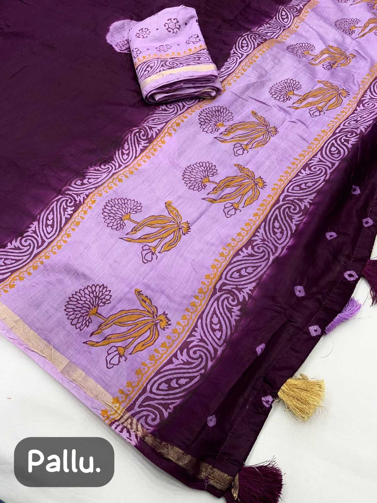 Cotton tassles on pallu. Blouse - pure cotton block print blouse perfectly designed for saree. Rate - 899+ship Top Perimum quality |