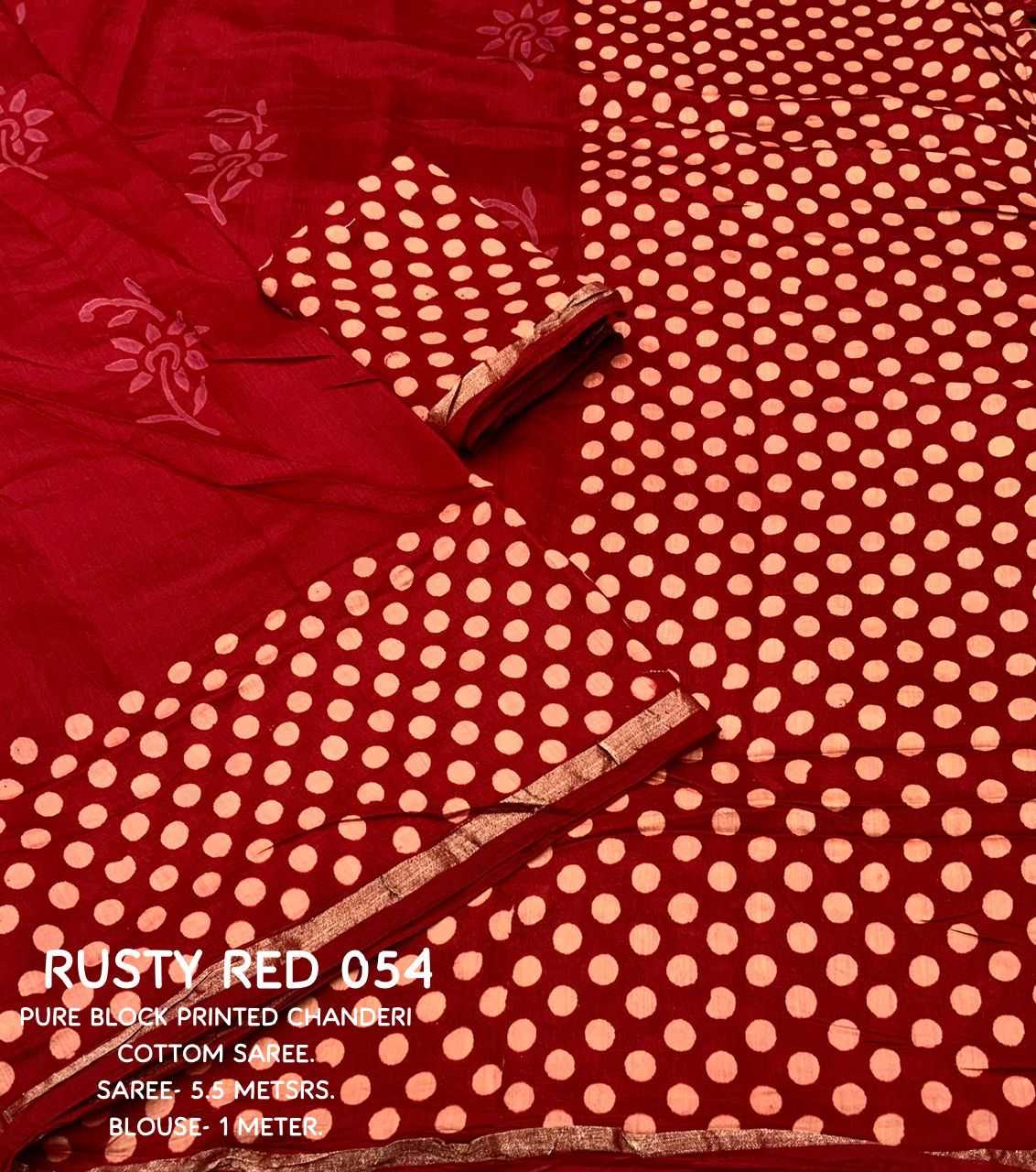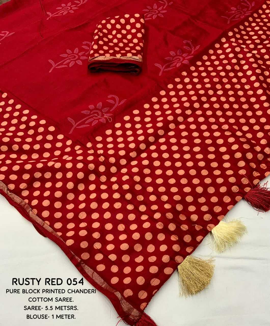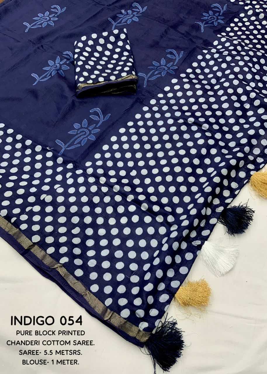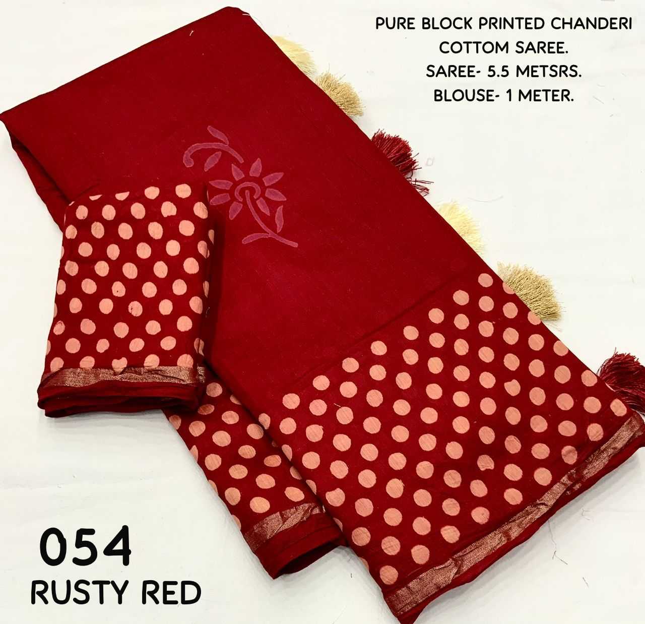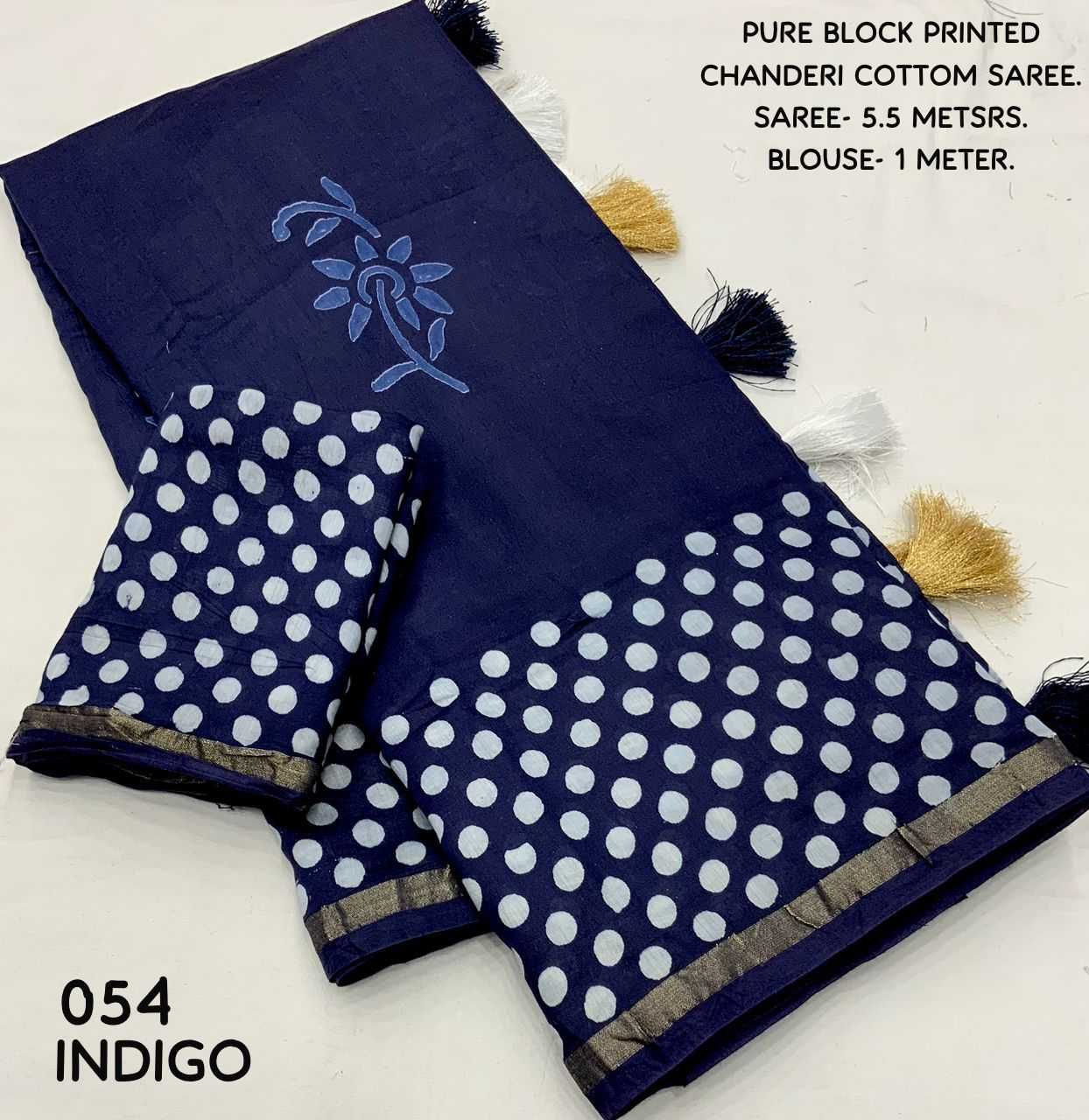 New hand block printed chander saree. Beautifull polkadot style design. Designed in two colors KC - 054 KC - POLKI BATIK. Quality- soft pure chanderi cotton saree with hand block prints. Cotton tassels on pallu. Blouse- perfectly matched polkadot hand blocked printed blouse. Rate - 1450+ship Top Perimum quality |
