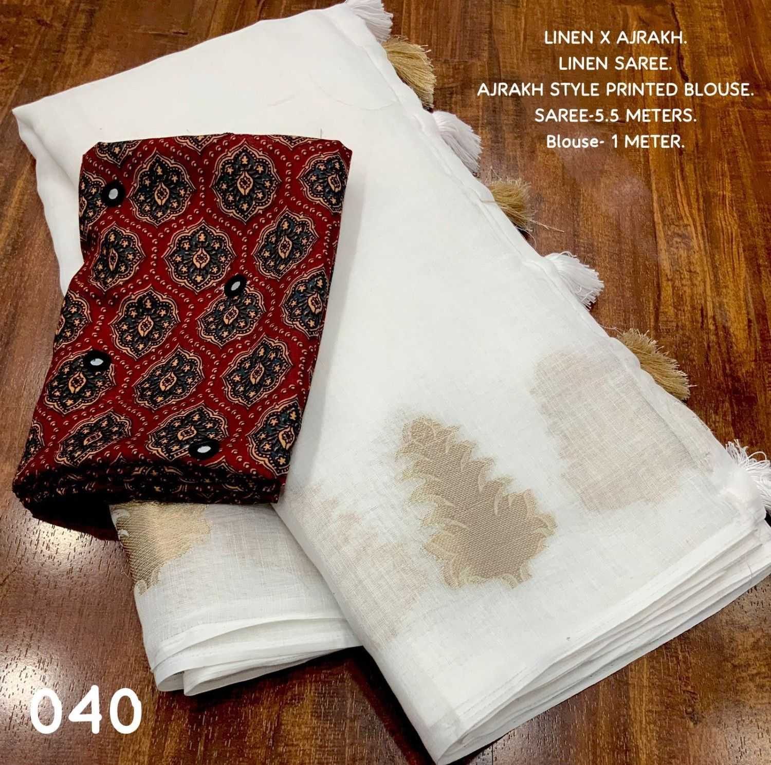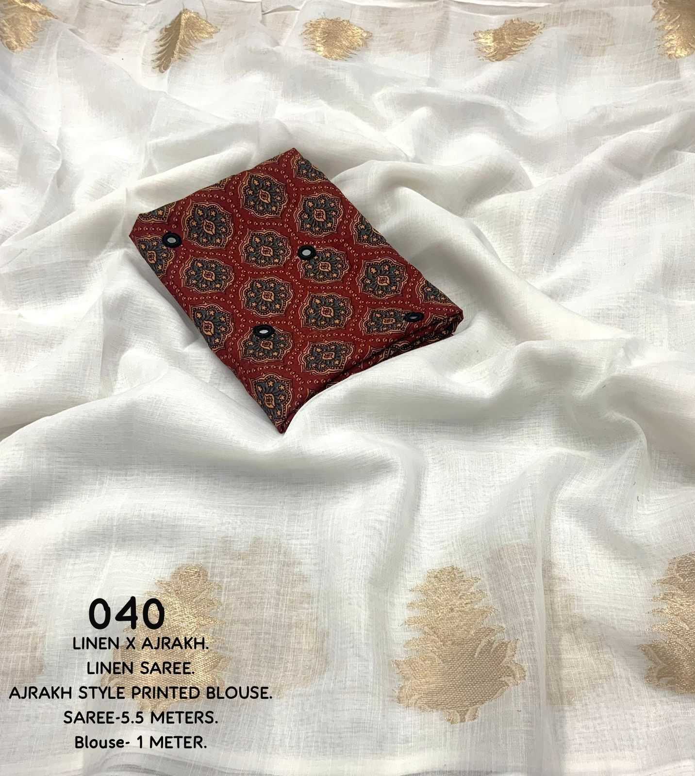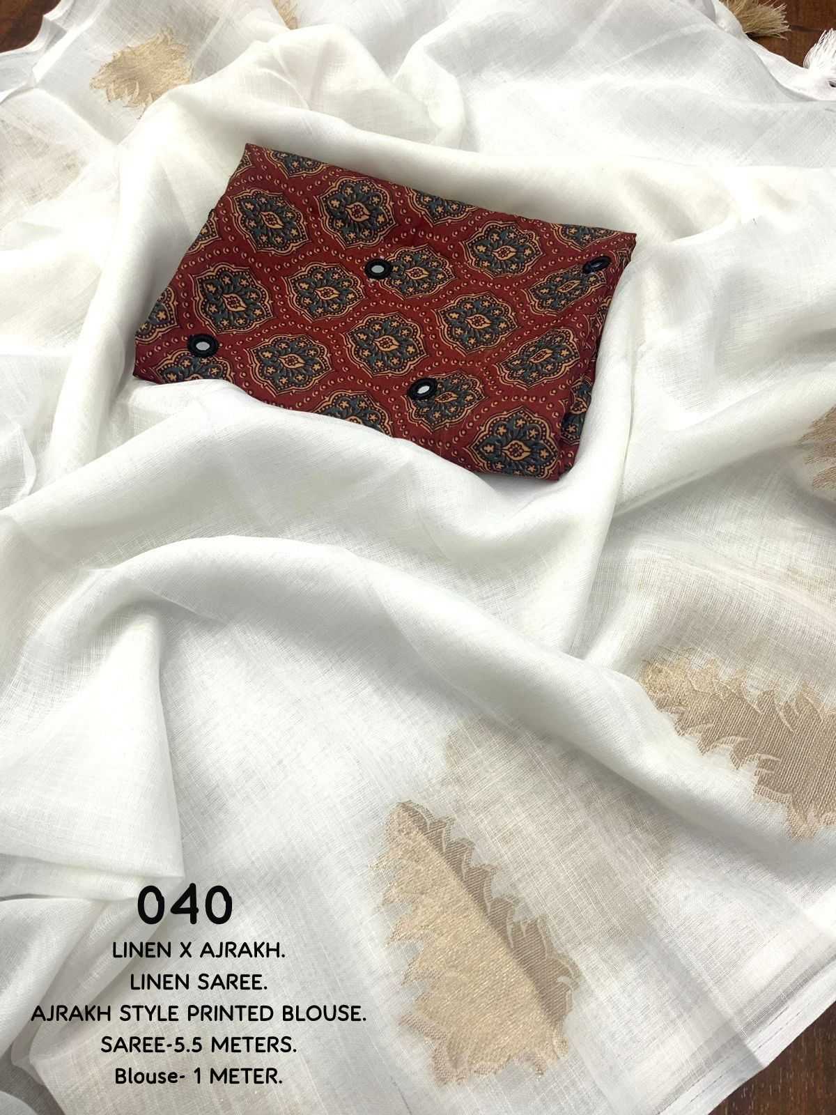 BEST SELLER BACK IN STOCK LINEN X AJRAKH. New pure white linen saree KC- 007 Quakity- soft white linen saree with zari woven leaf design. Cotton tassels on pallu. Blouse- ajrakh style prints on linen fabric with aarir mirror work. Rate- 1000+ship Top trusted quality |