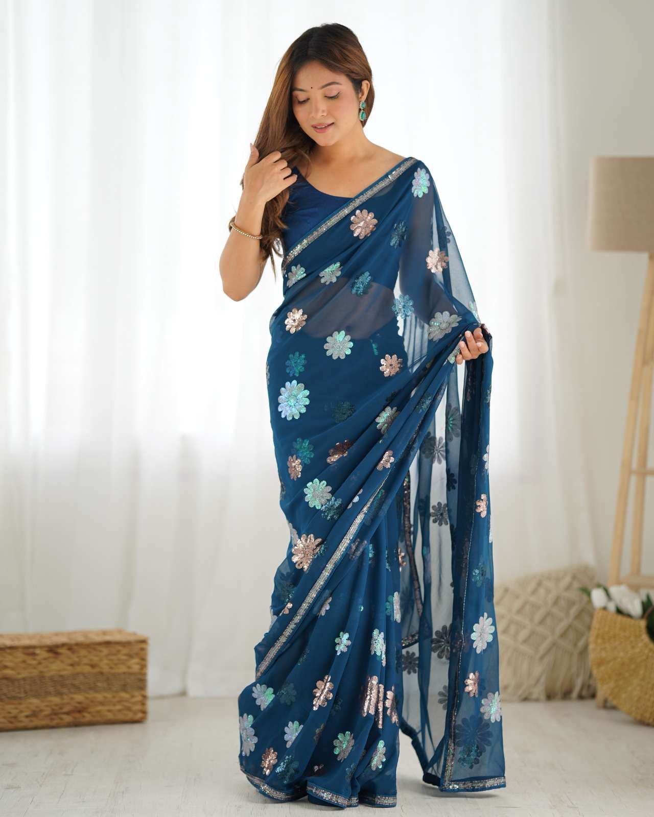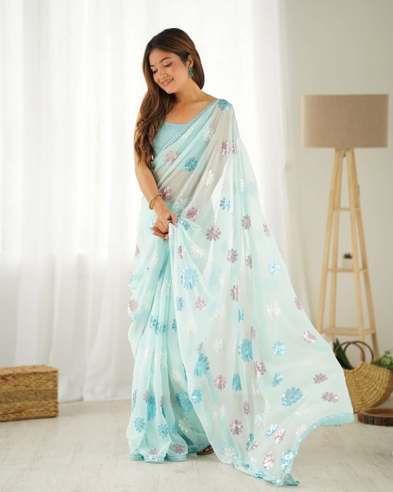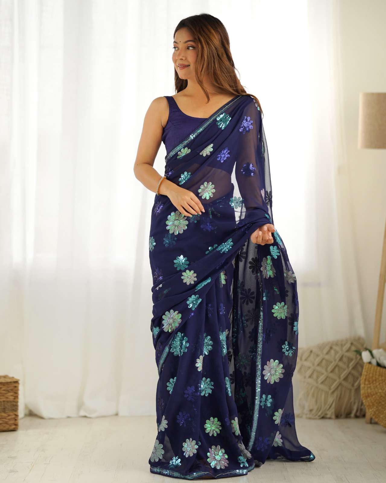 🛑SAREE FABRIC- Faux Georgette 🛑SAREE LENGTH- 5.50 Mtr 🛑SAREE WORK- Multicolour seqwance work with seqwance lace border 🛑BLOUSE FABRIC- Daimond silk 🛑BLOUSE LENGTH- 1 Mtr