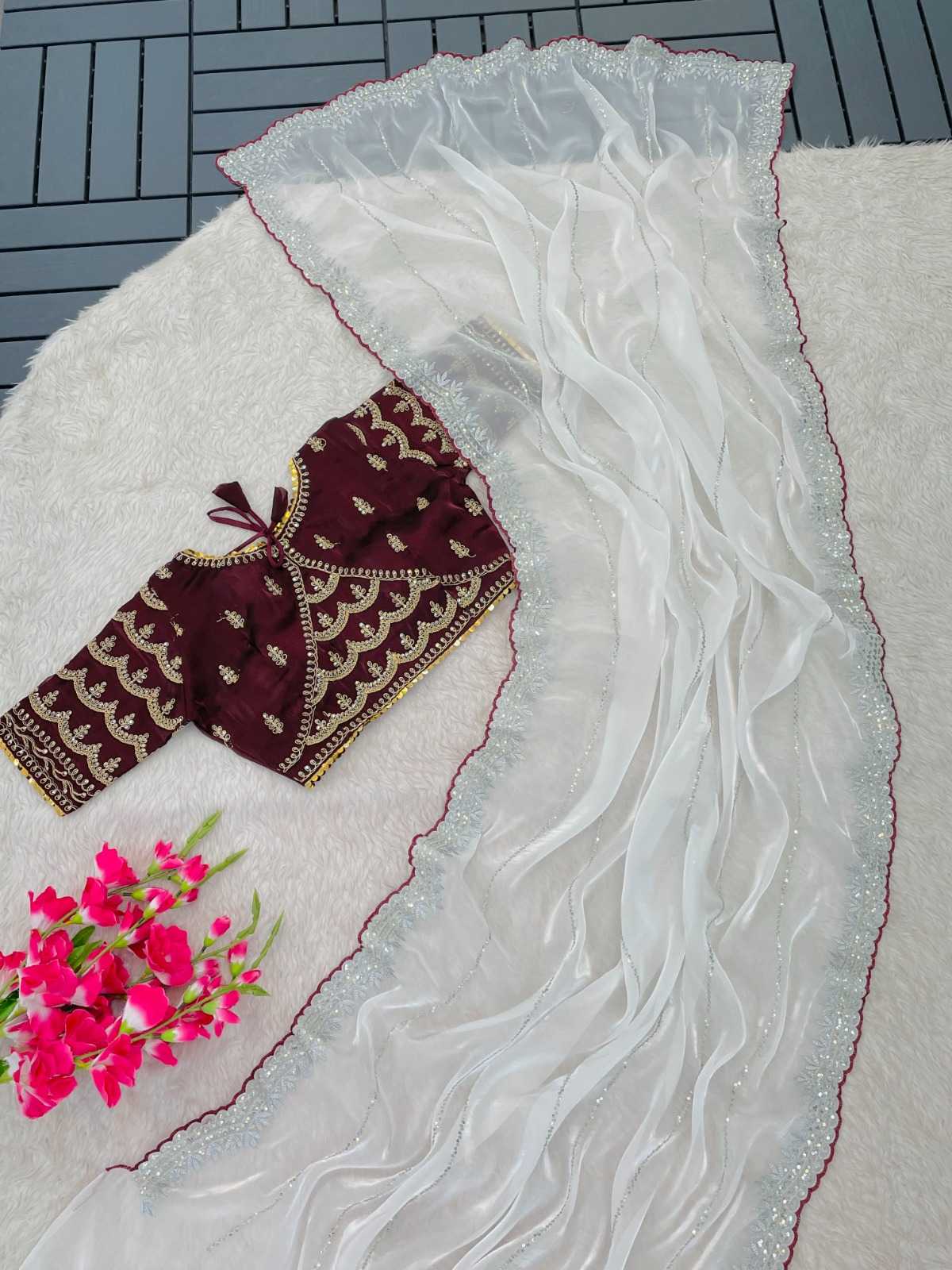 KC-829 Pure soft zimmy choo silk sarees with amazing 3 mm sequence work with work border nd aarco.. Paired with zimmy chhoo Fabric fully stiched embroidery work blouse with latkan nd extra margin unstich. Rate. 899/- |
