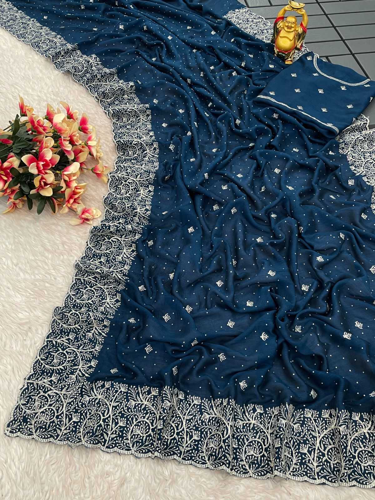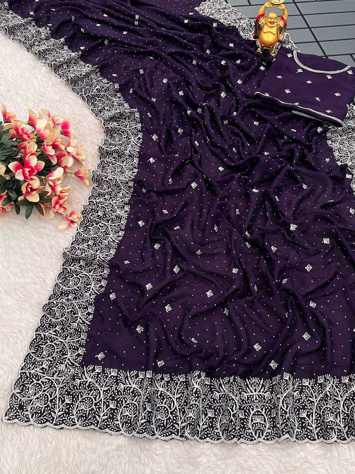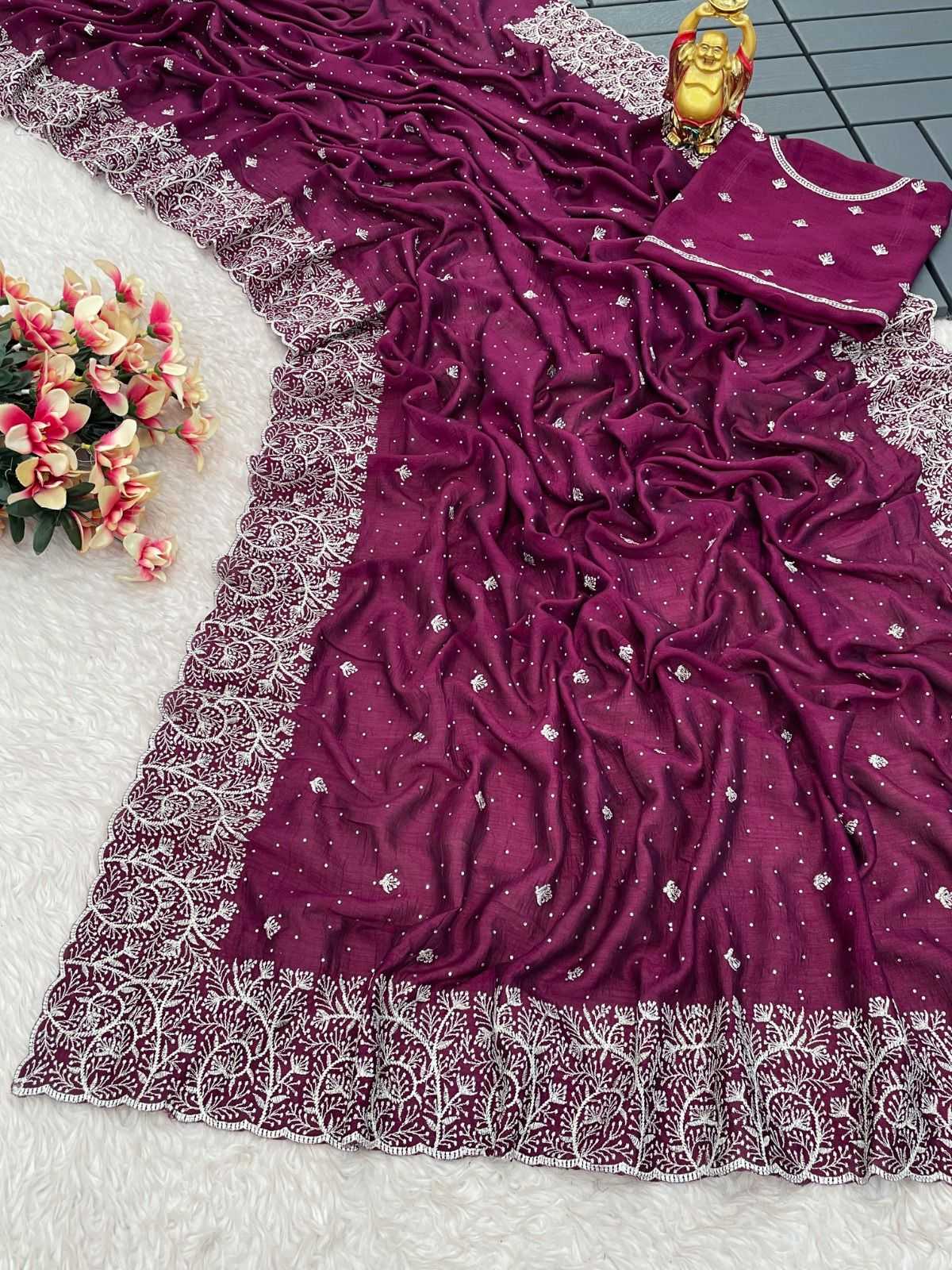 Presenting you most beautiful Saree collection KC-842 👇 Fabric details 👇 🛑SAREE FABRIC - Blooming Vichitra silk 🛑SAREE LENGTH- 5.50 Mtr 🛑SAREE WORK- Zari work with stone work 🛑BLOUSE FABRIC- Blooming Vichitra silk with embroidery work 🛑BLOUSE LENGTH- 1 Mtr with embroidery work Original quality RATE - 1049/- |