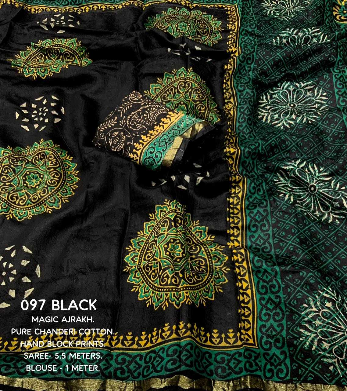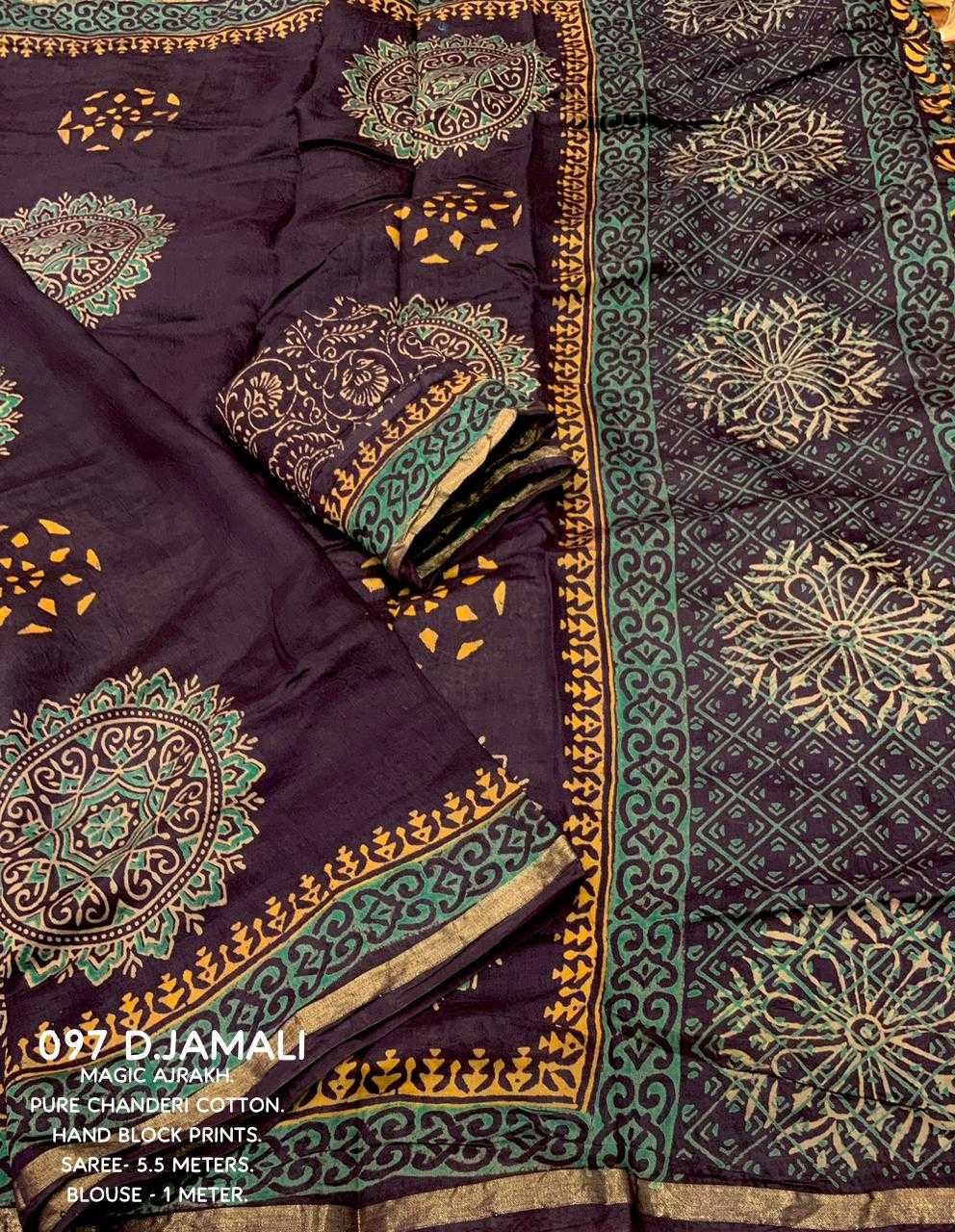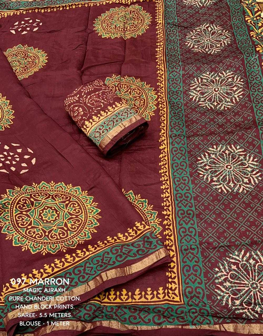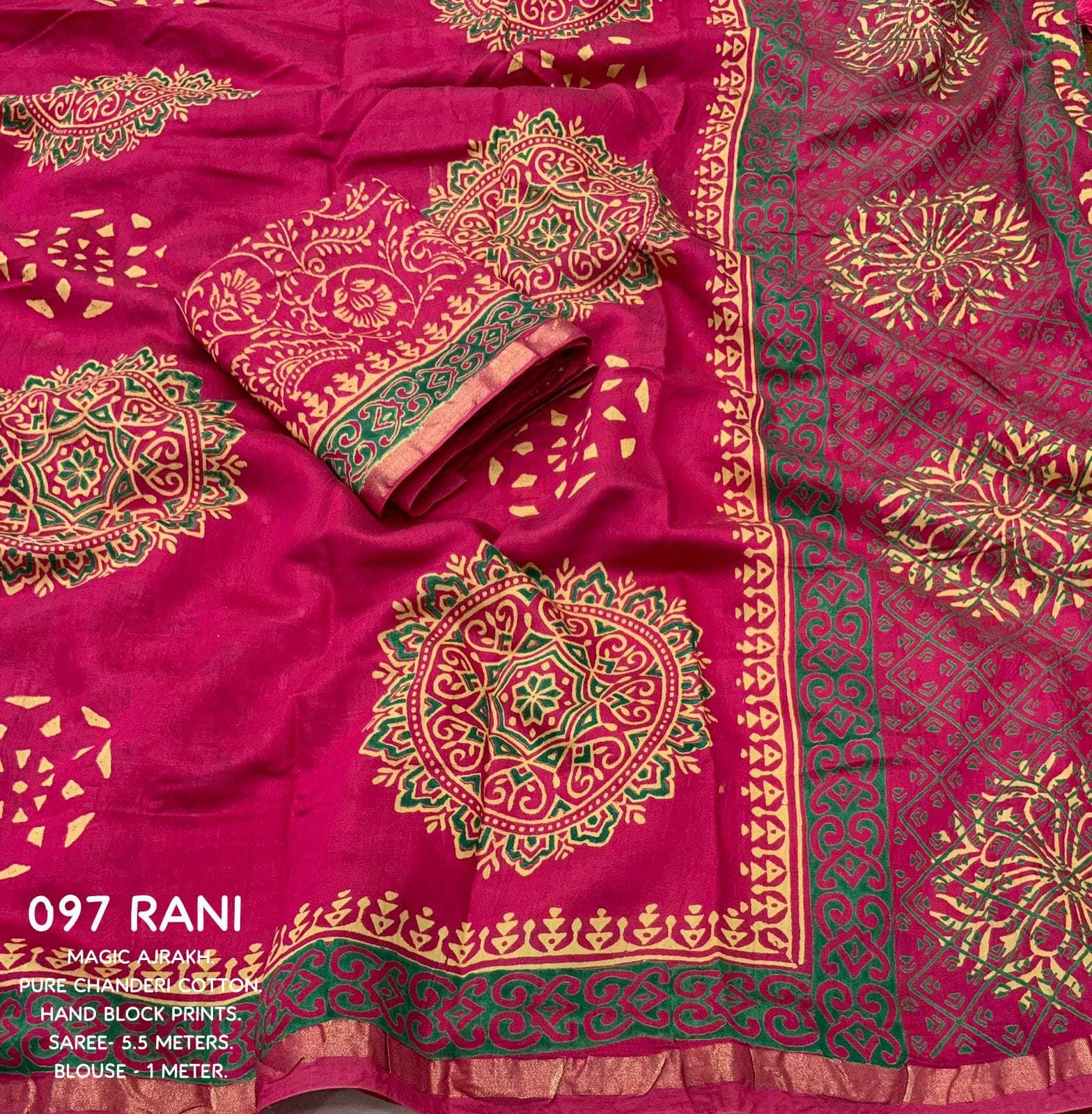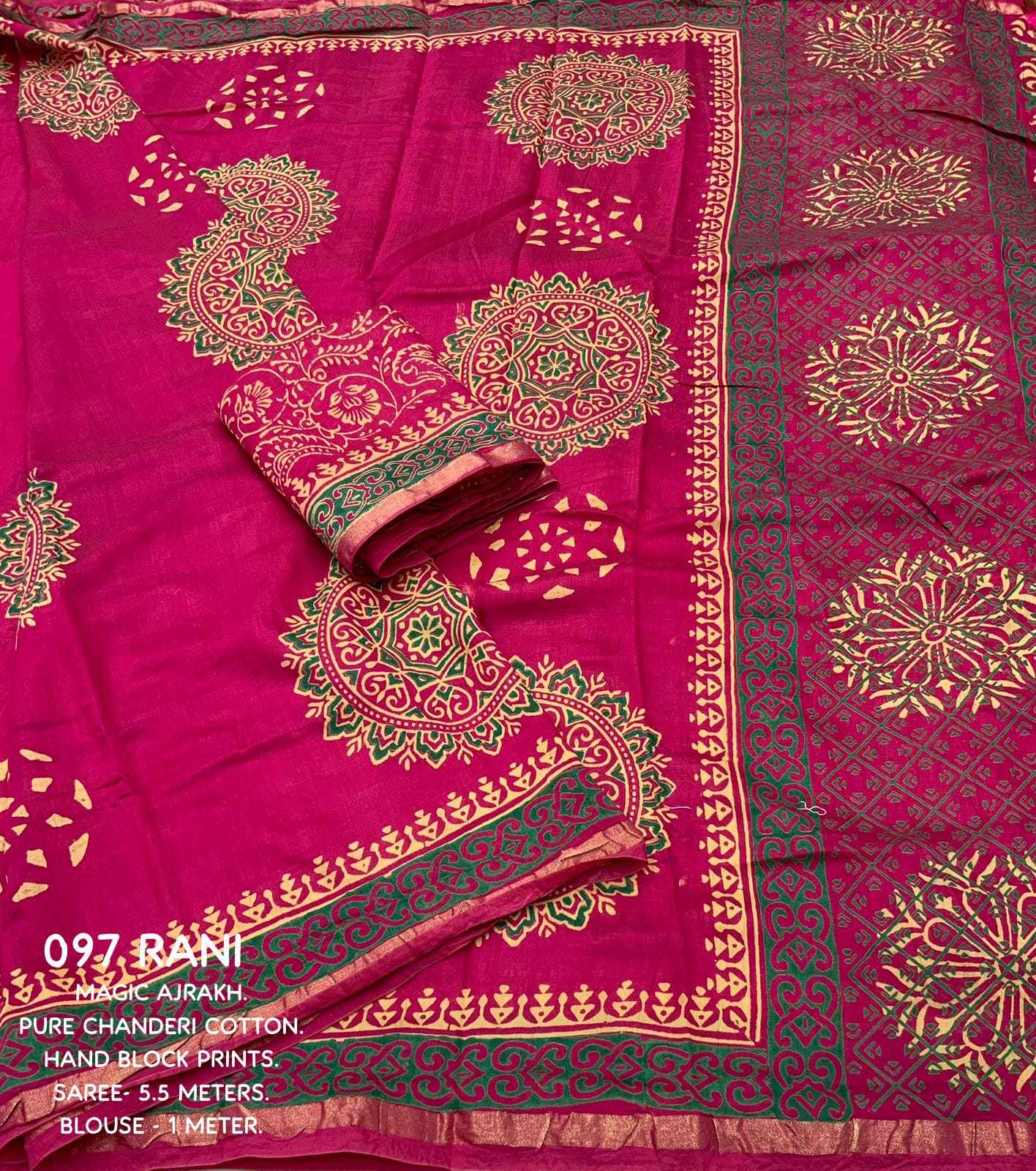 New preimum hand block printed anrakh saree. KC- 97 KC- magic Ajrakh Quality- pure chanderi cotton zare with zari woven pattu border. Ajrakh butta style hand block prints. Blouse- pure chamderi hand block printed blouse. Rate - 1550+ship Top premium quality |