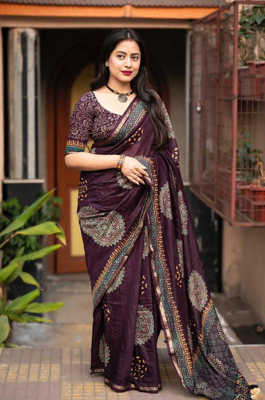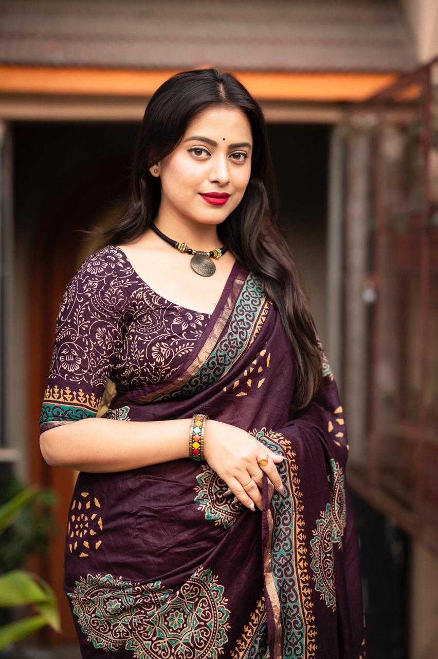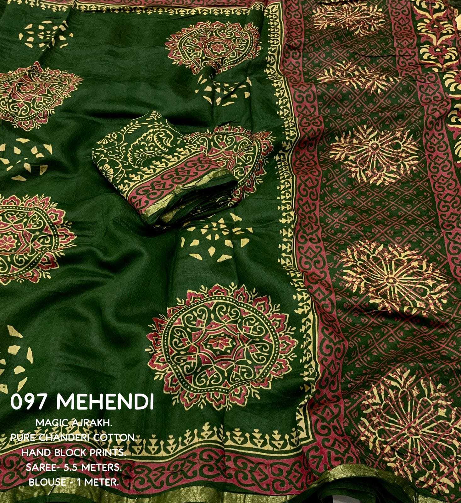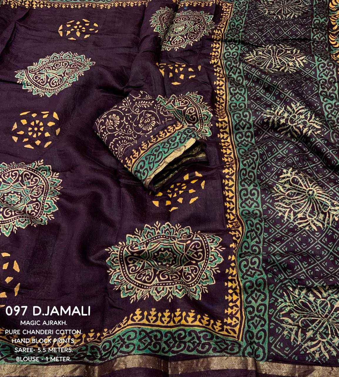 New preimum hand block printed anrakh saree. KC- 97 KC- magic Ajrakh Quality- pure chanderi cotton zare with zari woven pattu border. Ajrakh butta style hand block prints. Blouse- pure chamderi hand block printed blouse. Rate - 1550+ship Top premium quality |