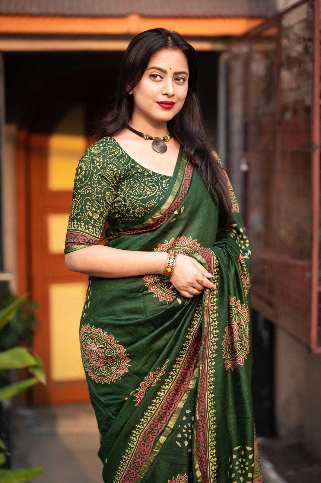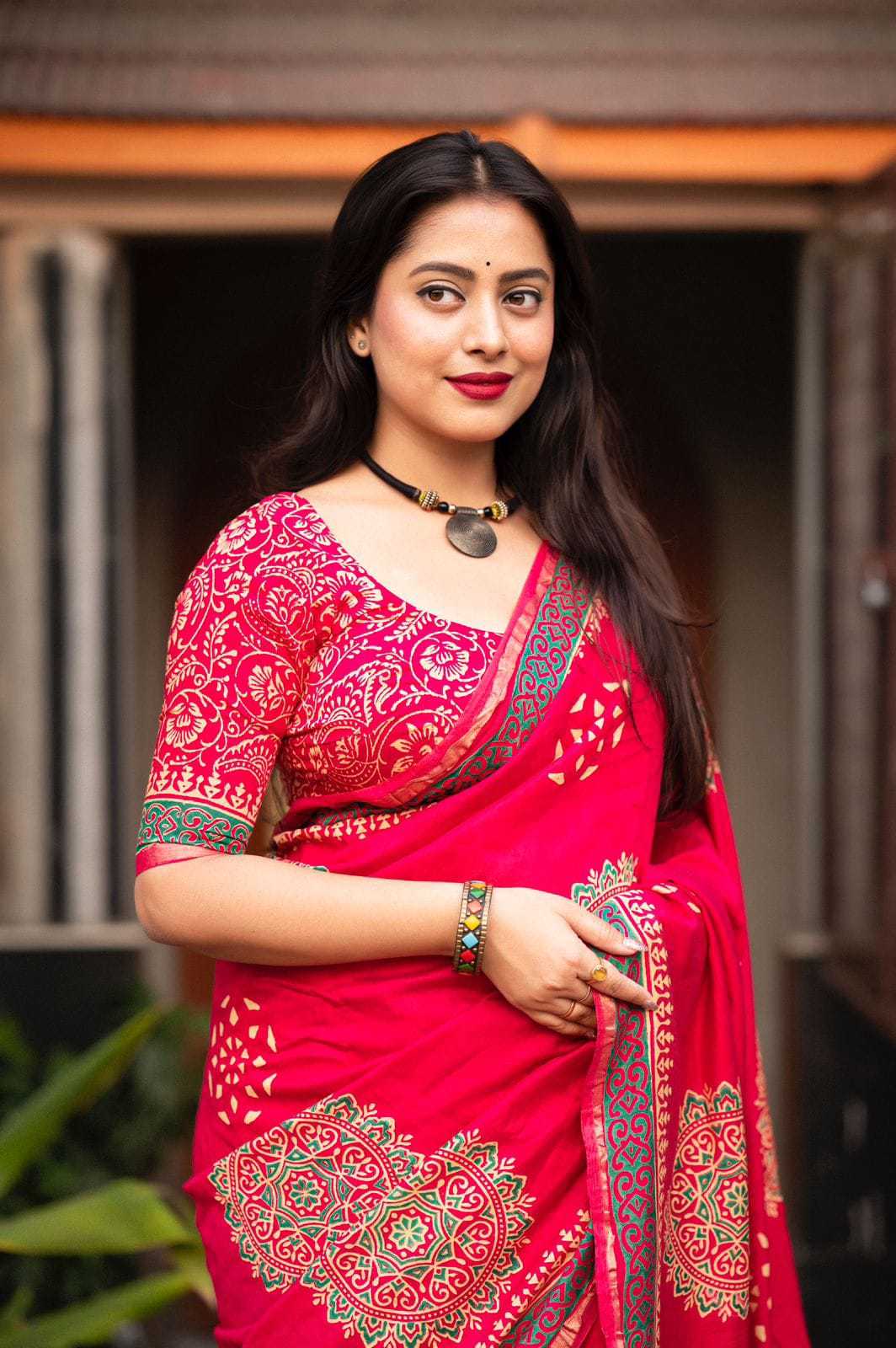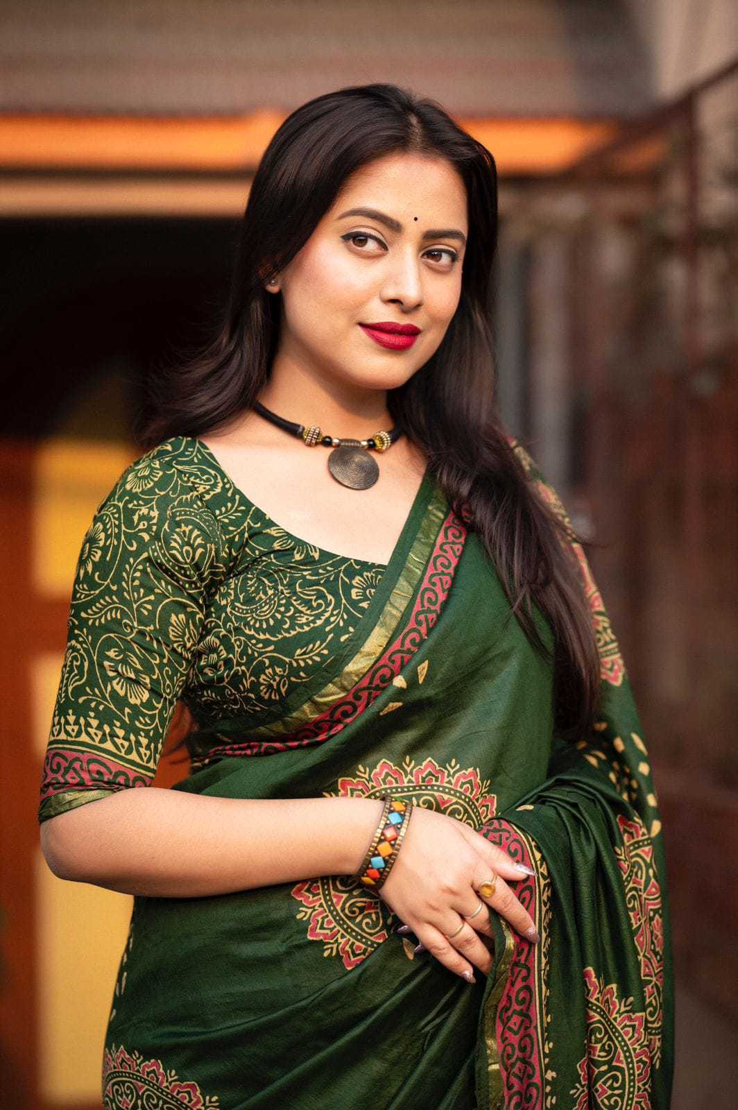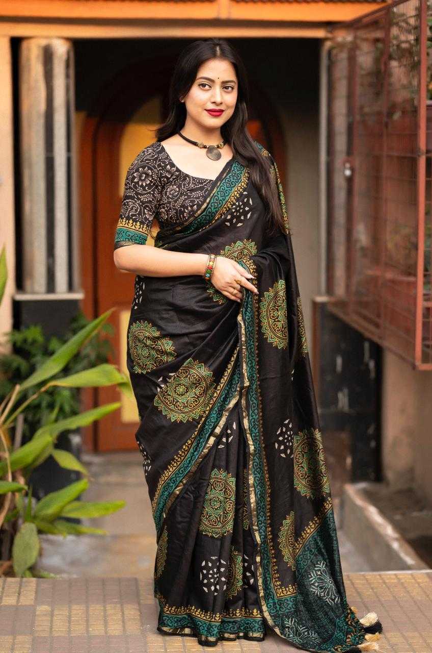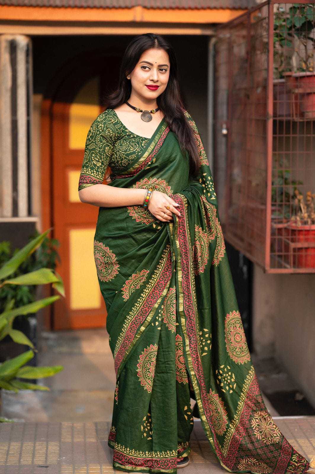 New preimum hand block printed anrakh saree. KC- 97 KC- magic Ajrakh Quality- pure chanderi cotton zare with zari woven pattu border. Ajrakh butta style hand block prints. Blouse- pure chamderi hand block printed blouse. Rate - 1550+ship Top premium quality |