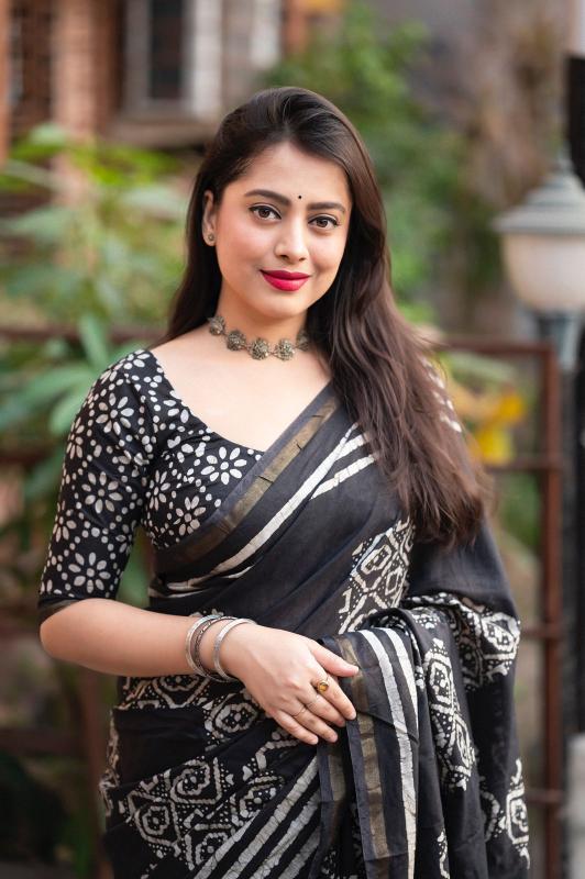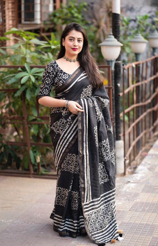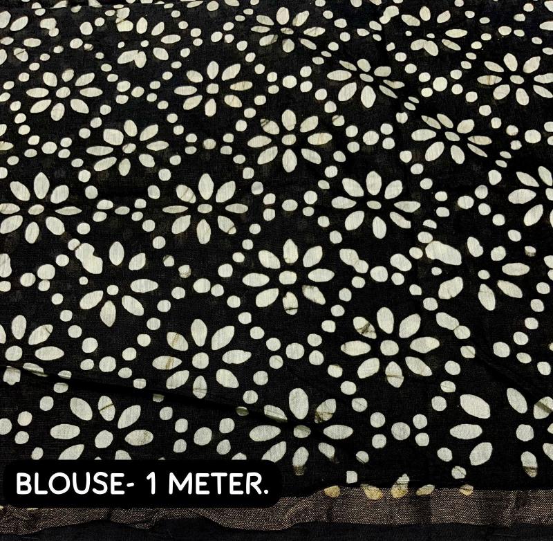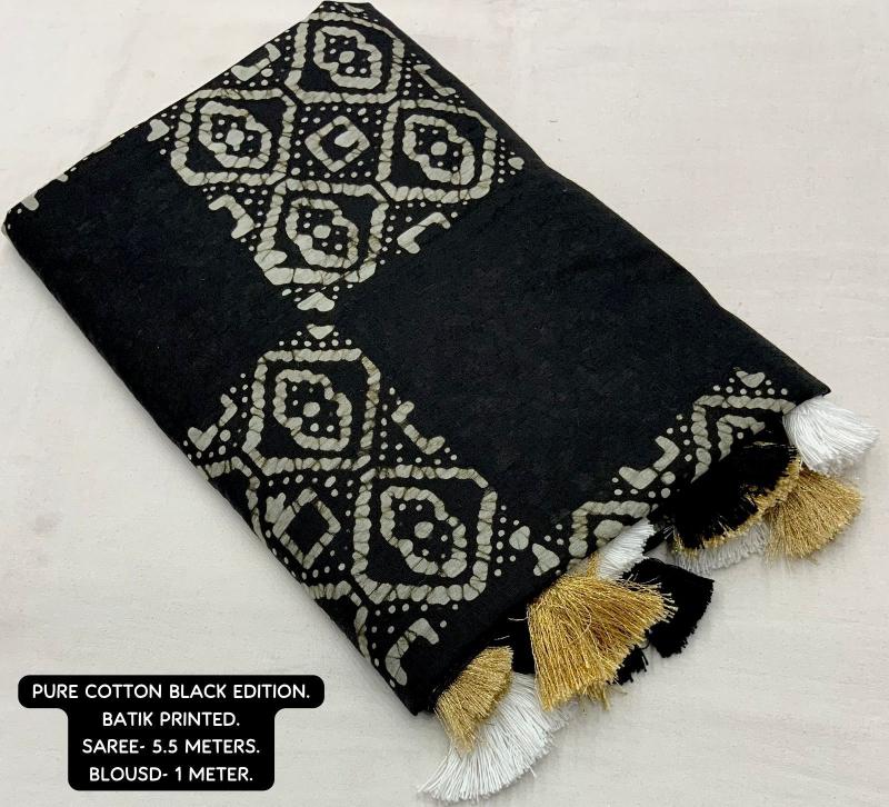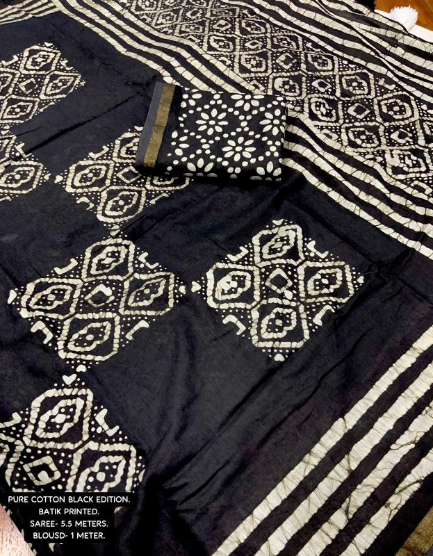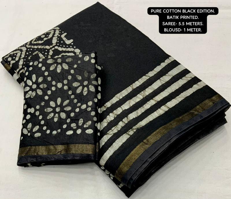 new arrivals New pure cotton black edition KC- black batik cotton. Quality- soft pure cotton saree with zari woven border. Handblock batik prints. Blouse- pure corron separate printed blouse. Rate- 945+ship. Top trusted quality |