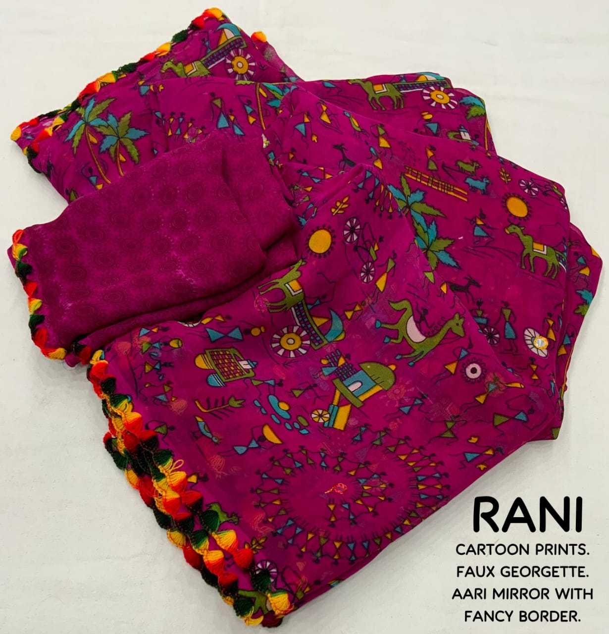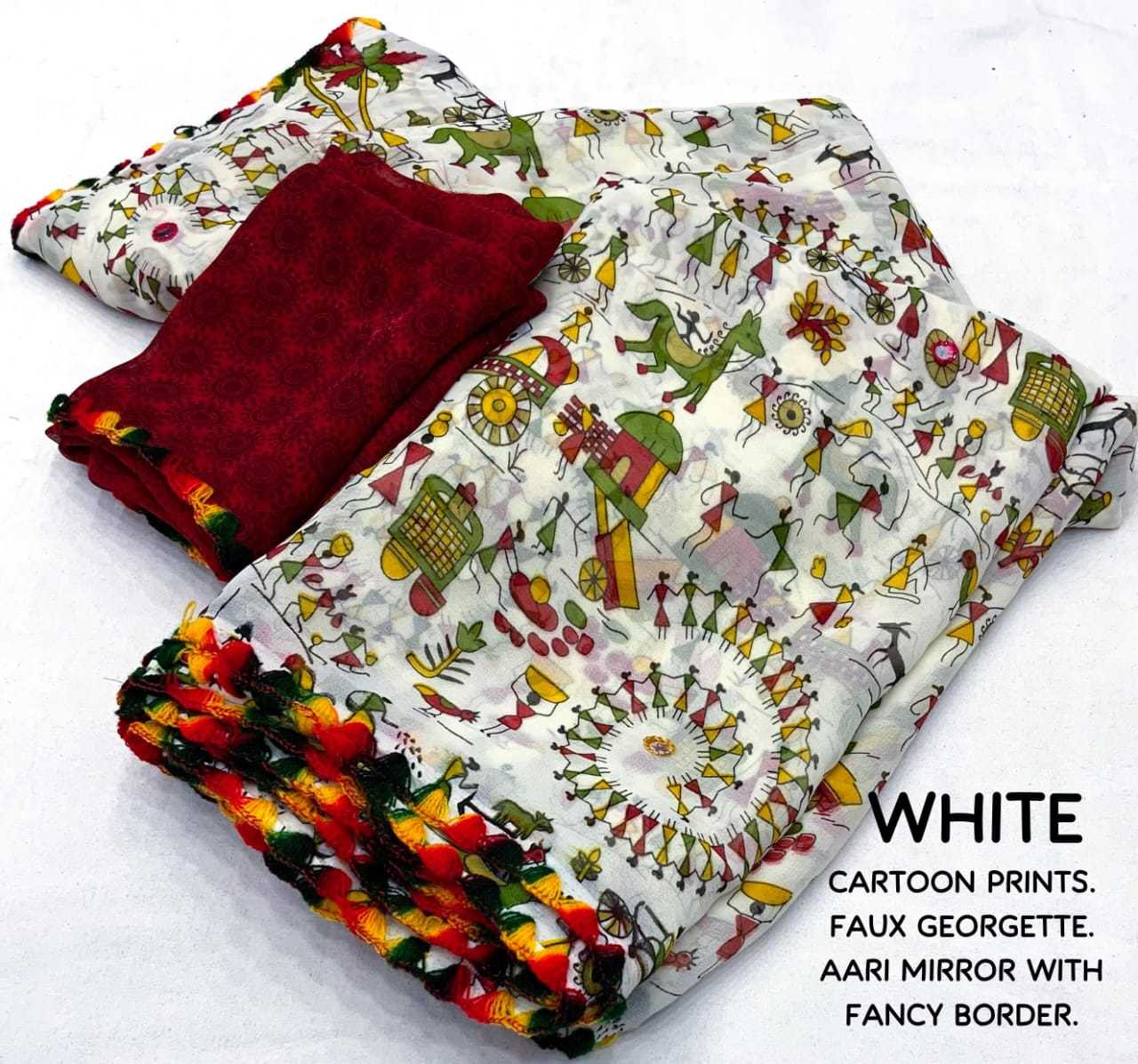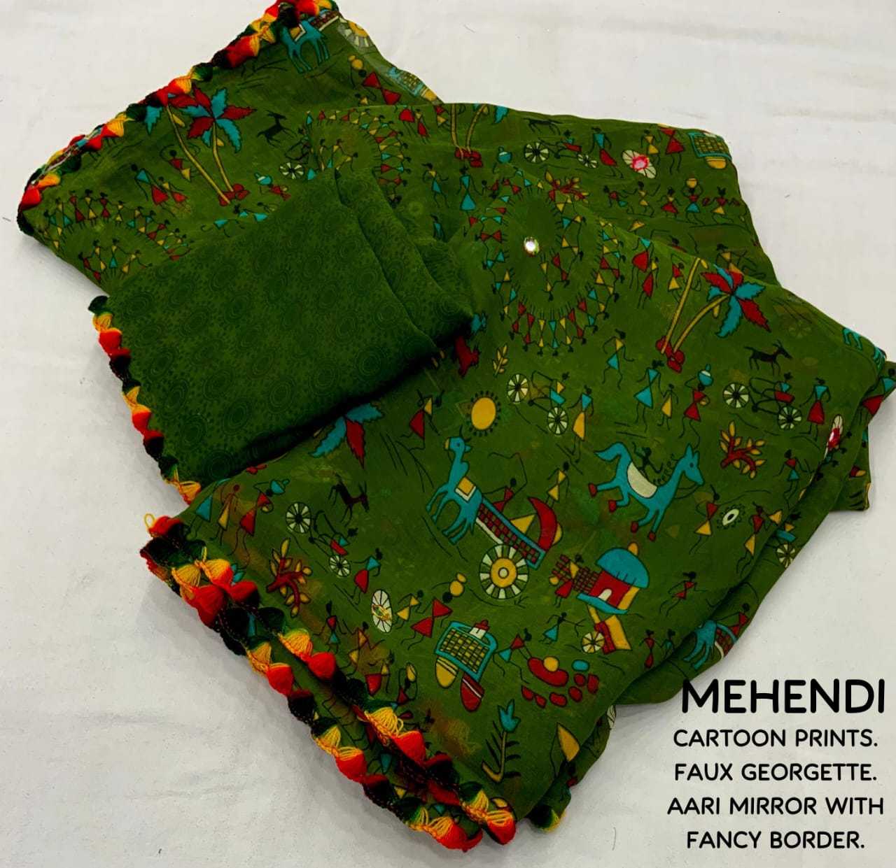 ready stock New beautifull peinted georgette saree KC- cartoon georgette. Quality- soft georgette saree with fancy worli and cartoon prints. Aari mirror and multi-colors samosa aari border. Blouse- separately printed running georgette blouse. Rate- 600+ship Top trusted quality |