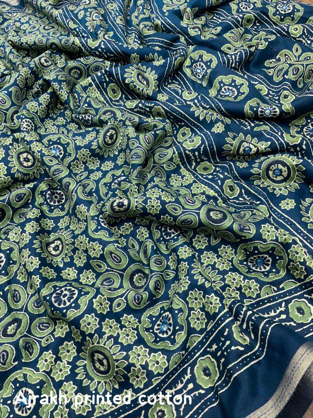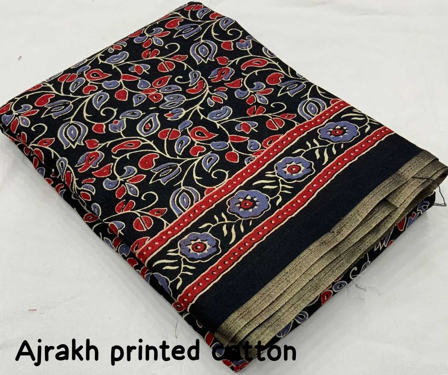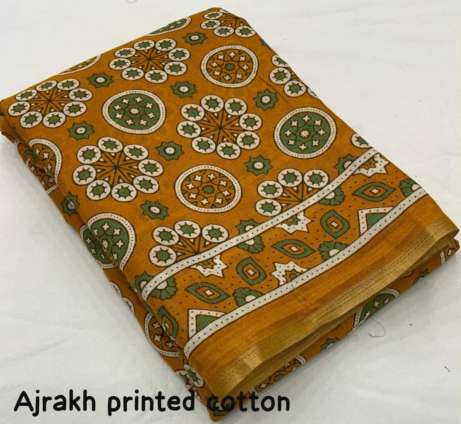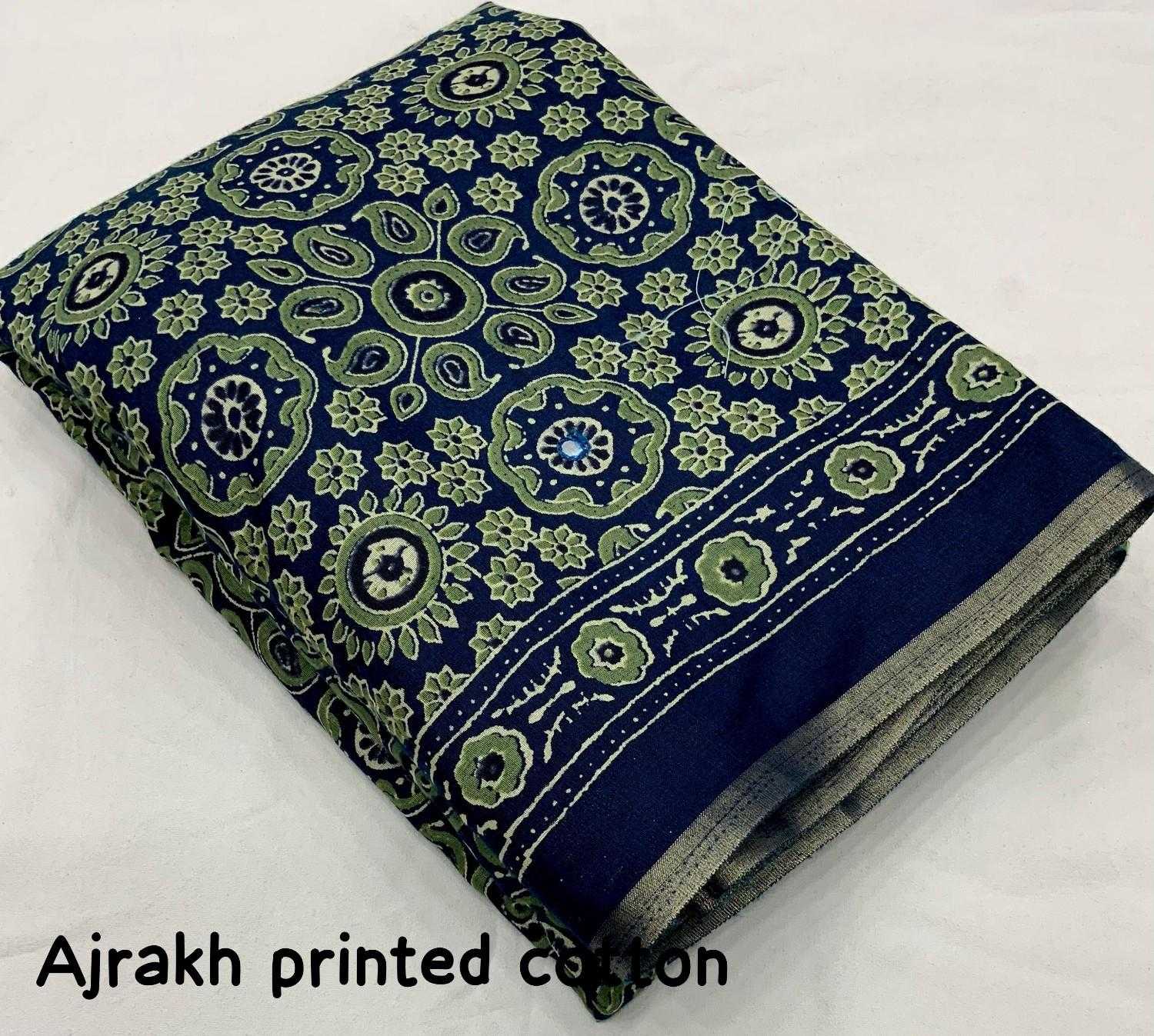 best seller New ajrakh style peinted catalog COTTON X AJRAKJ KC - ajrakh cotton quality- soft cotton feel saree with zari woven border. Ajrakh prints Aari mirror work. Blouse- running cotton feel blouse. Rate- 620+ship Full length 6.30 meters. Top trusted quality |