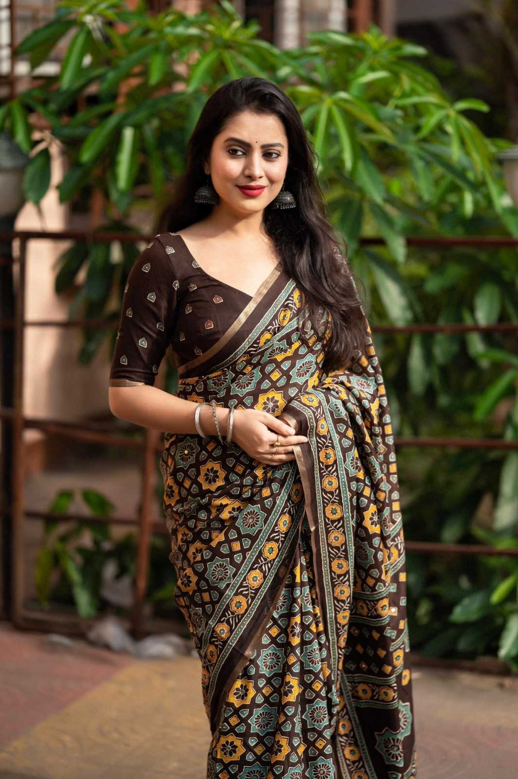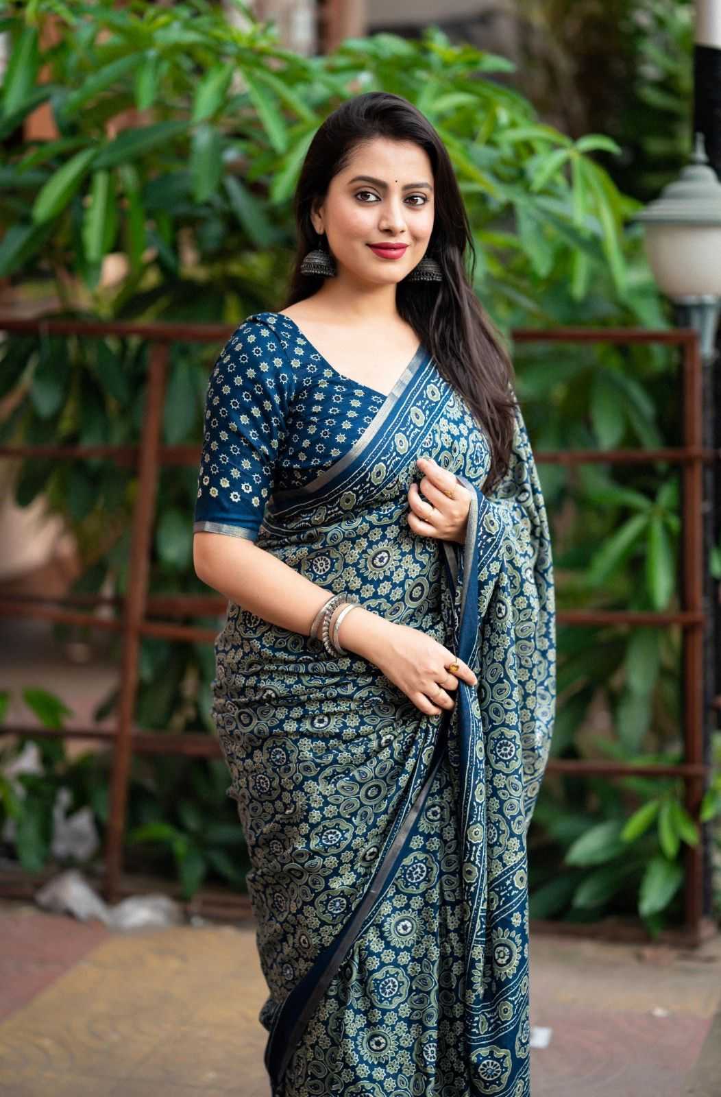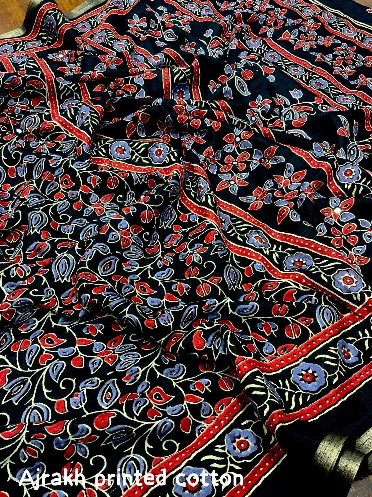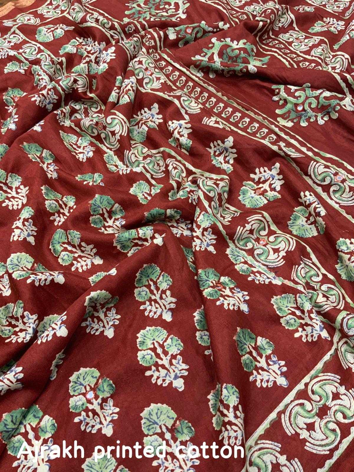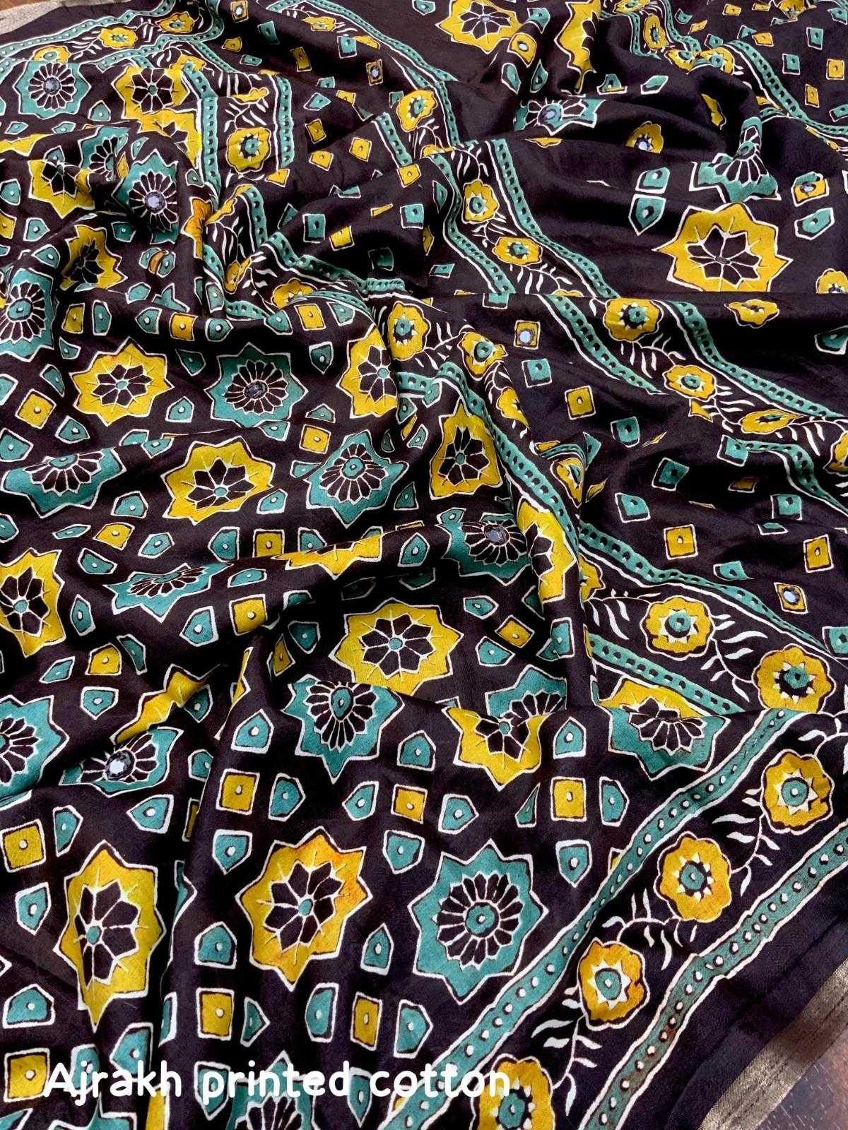 best seller New ajrakh style peinted catalog COTTON X AJRAKJ KC - ajrakh cotton quality- soft cotton feel saree with zari woven border. Ajrakh prints Aari mirror work. Blouse- running cotton feel blouse. Rate- 620+ship Full length 6.30 meters. Top trusted quality |