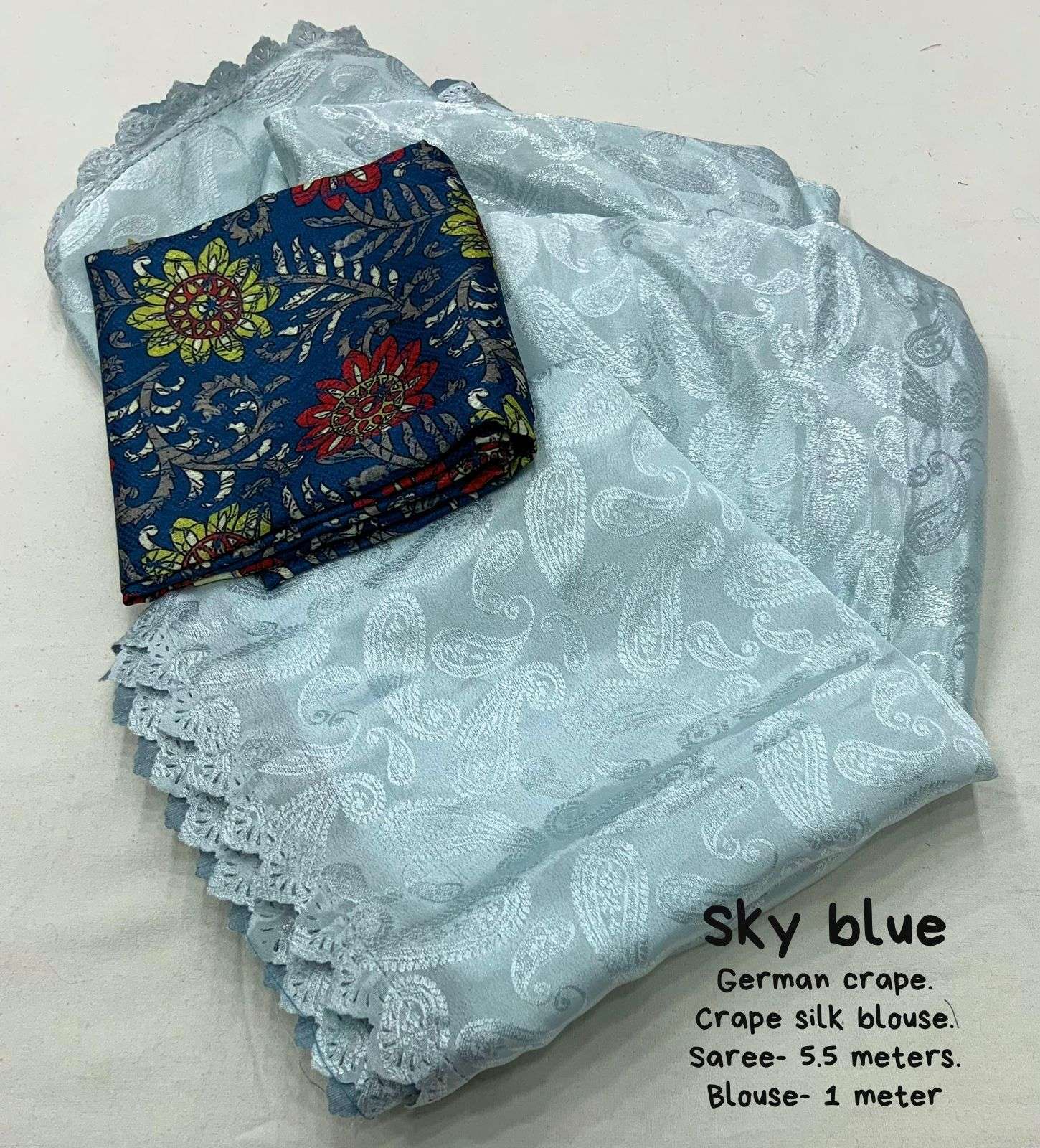 BEST SELLER New crape silk catalog KC- German crape. Quality- soft crape silk saree with allover mango woven design. Fancy cutworkstyle border. Blouse- perfectly matched self woven tilak crape silk. Rate- 700/- +ship. Top trusted quality |