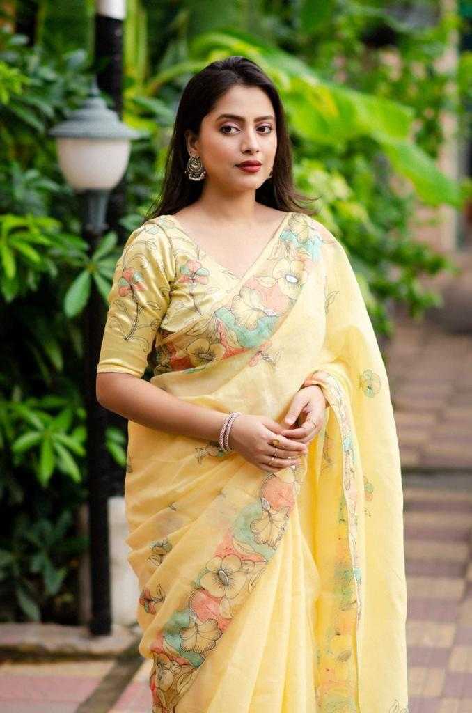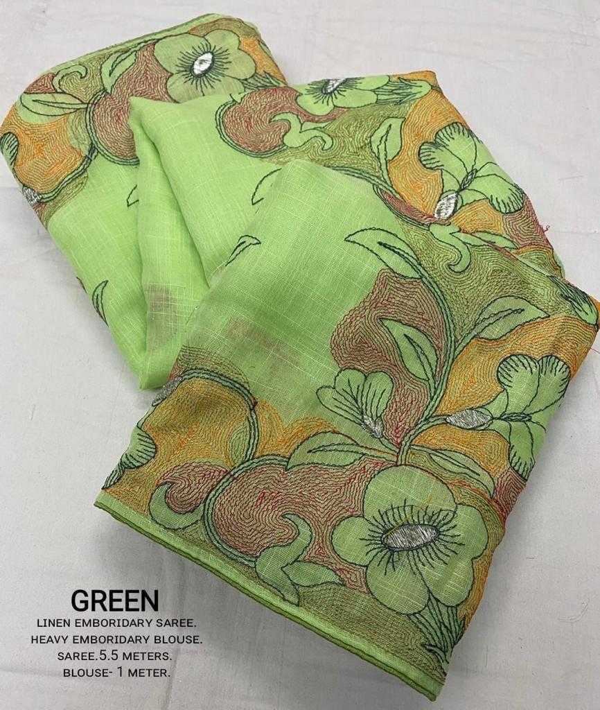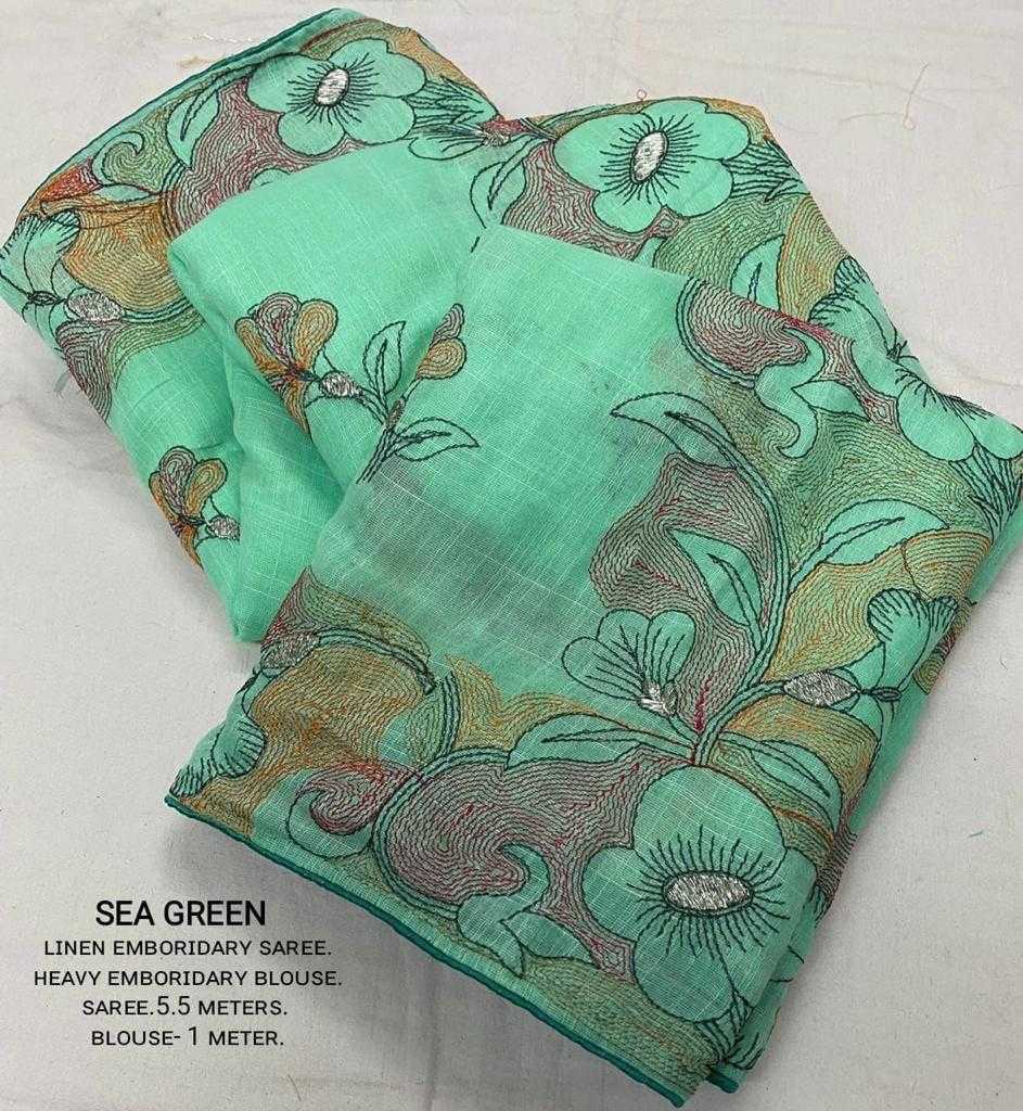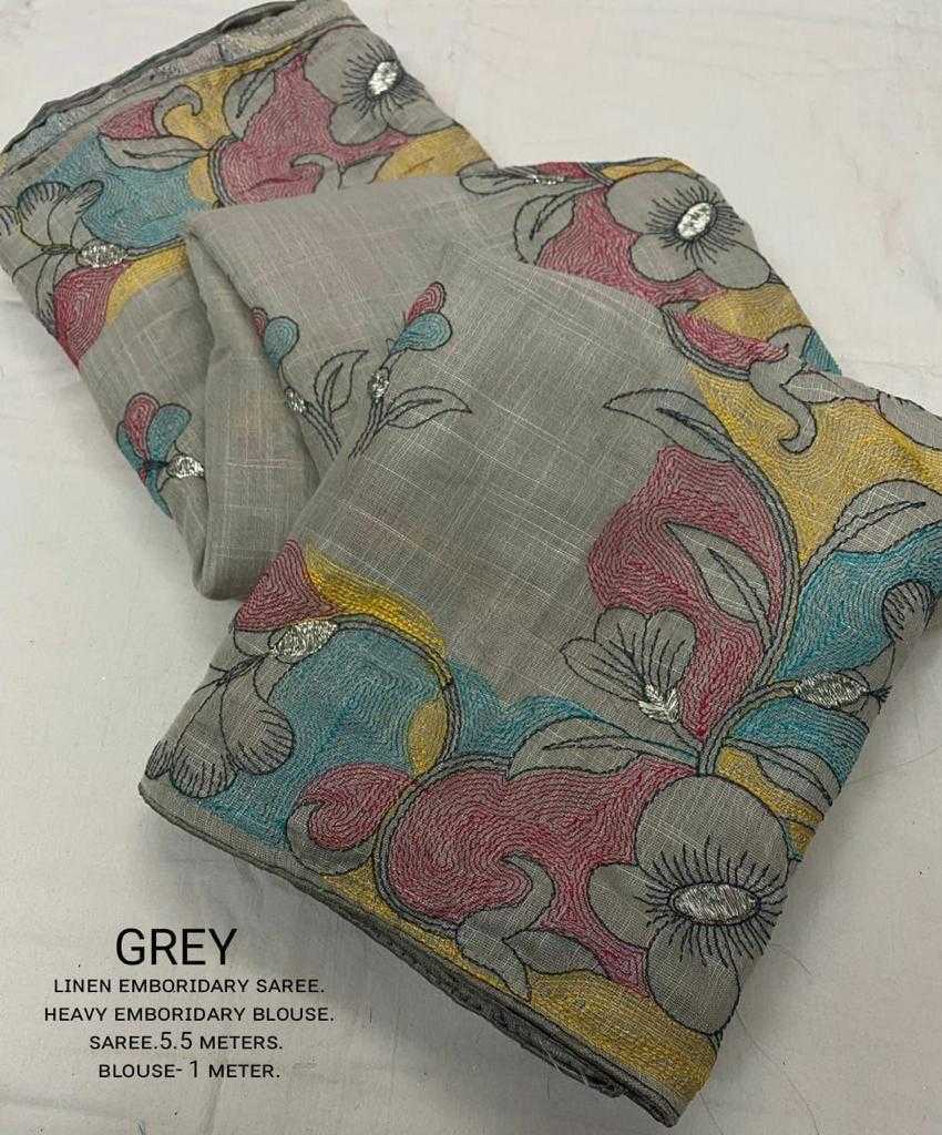 best seller Linen emboridary saree KC- pencil linen Quality- soft linen by line saree with beautifull pencil stich emboridary Very rich emboridary pallu and piping border. Blouse- perfectly matched phantom silk heavy emboridary. Length Rate - 1150+ship Top trusted quality |