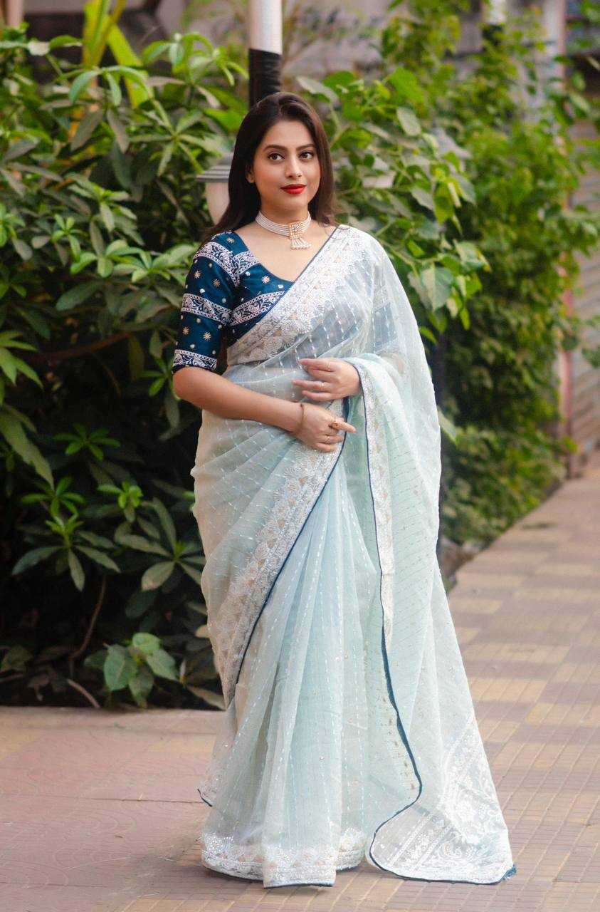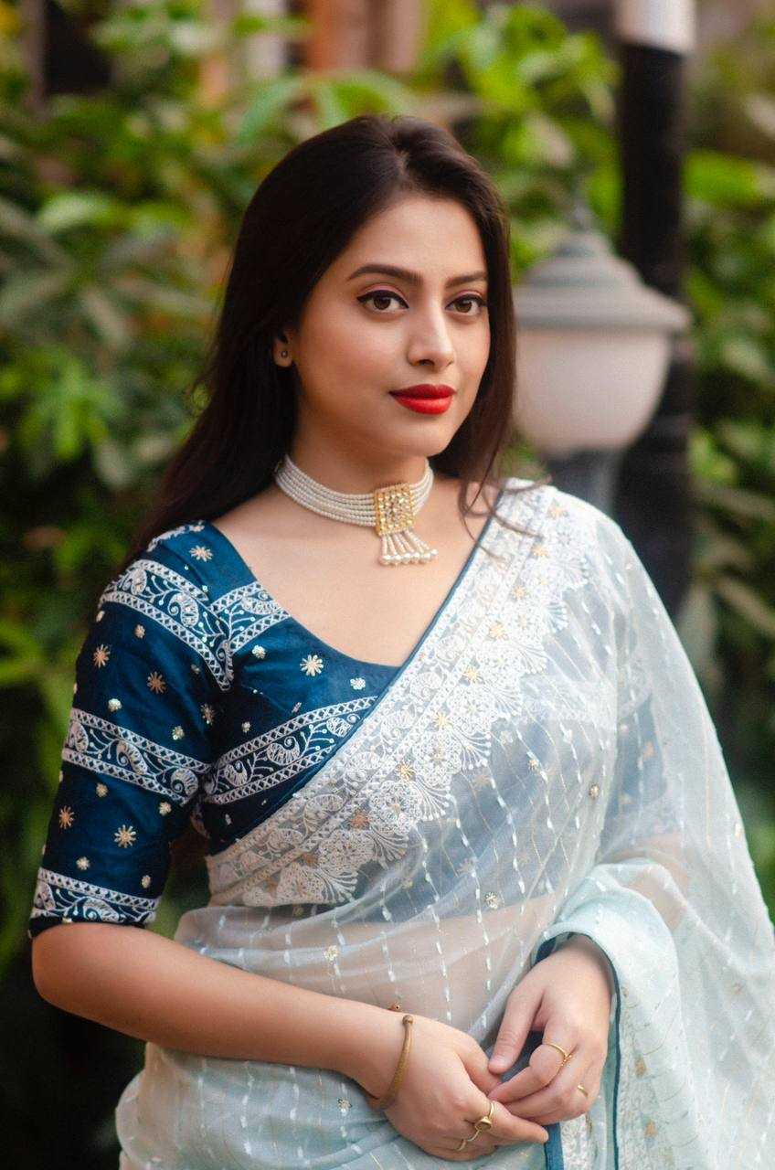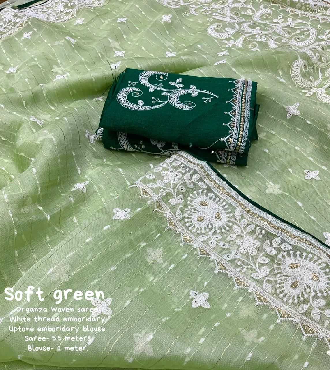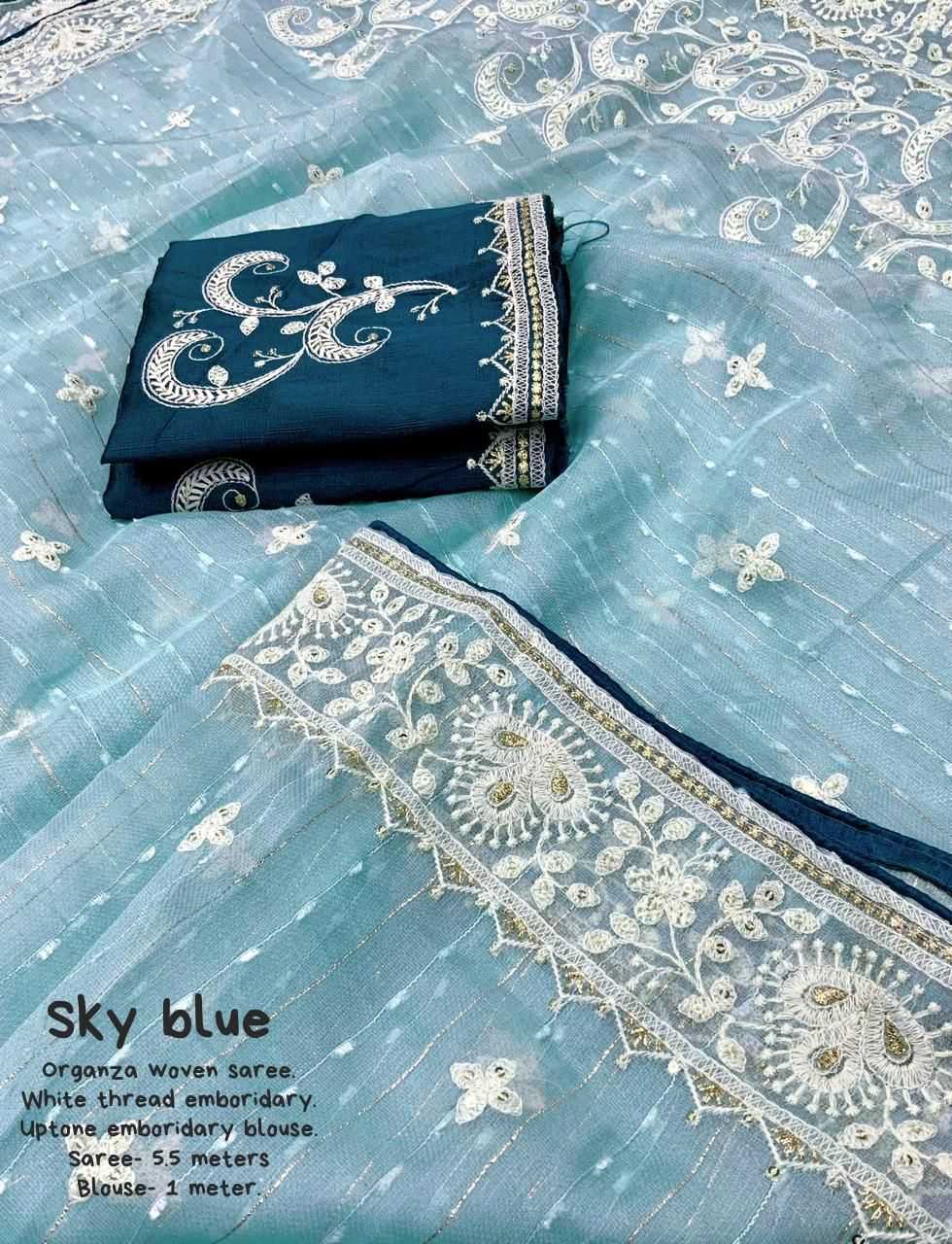 new arrivals New beautiful perimum organza catalog #organzaintrend KC- ritika organza. Quality- soft organza saree with with allover woven zari linings and woven rice shaped white thread. Specialty- white thread and sequence embroidery with c-pallu concept. Blouse- up-tone phantom silk with white thread and sequence embroidery. Rate- 1450+ship Top trusted quality |