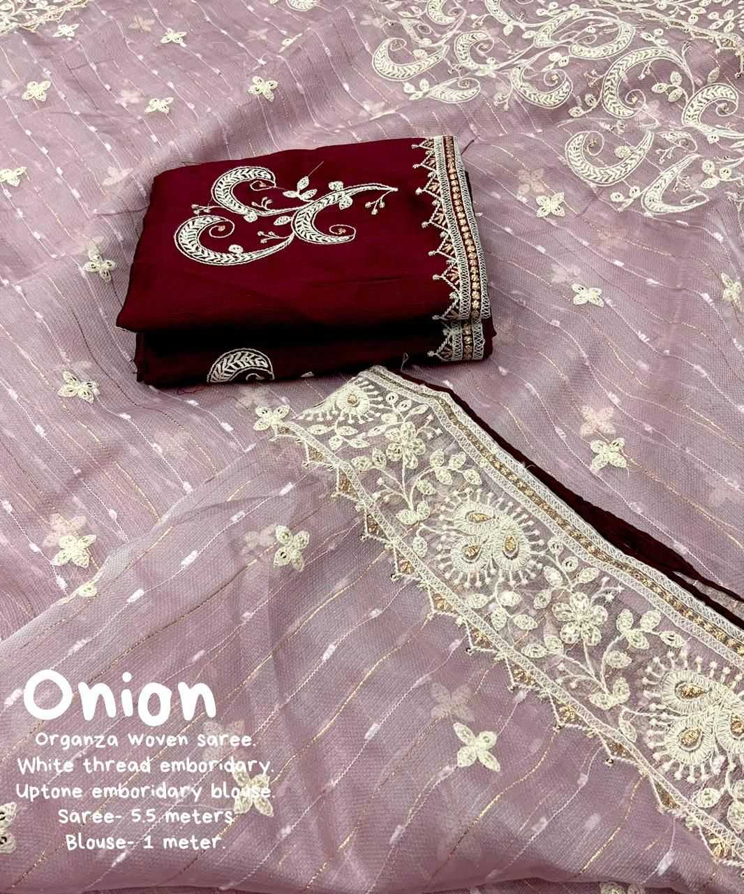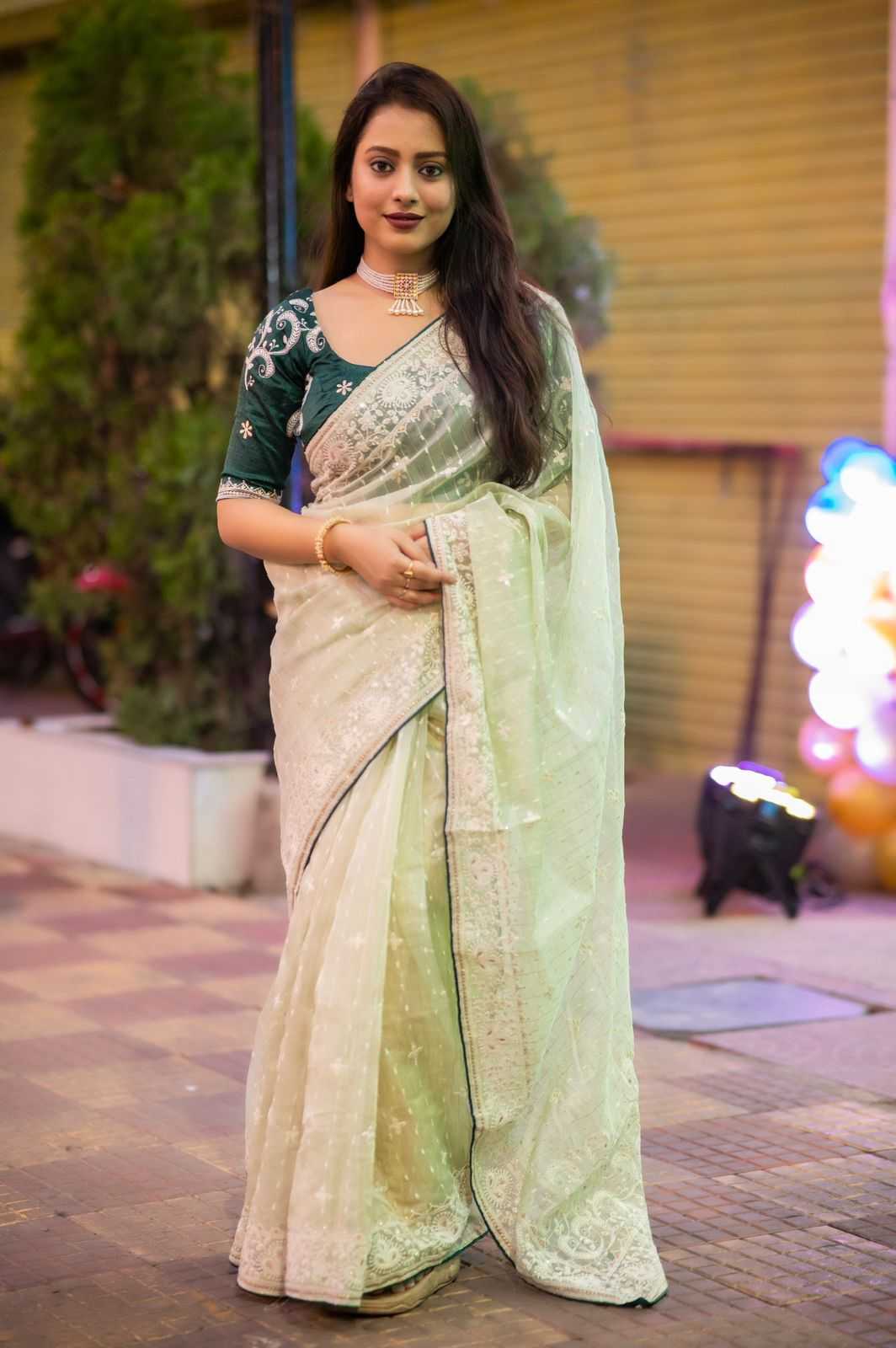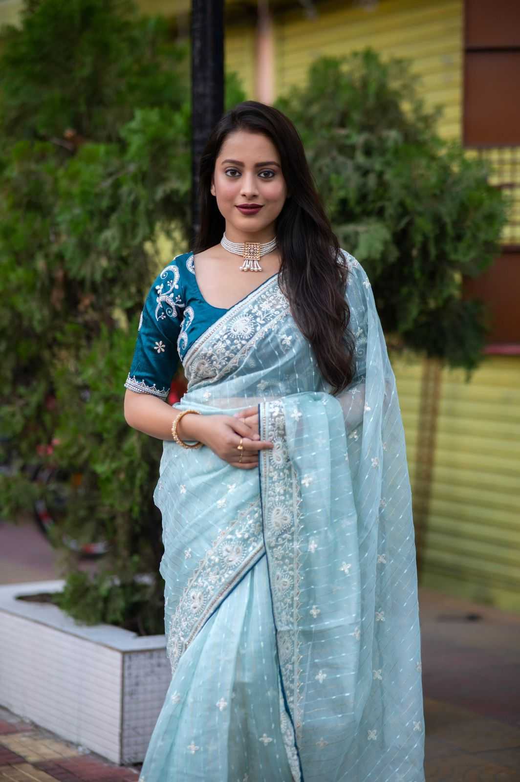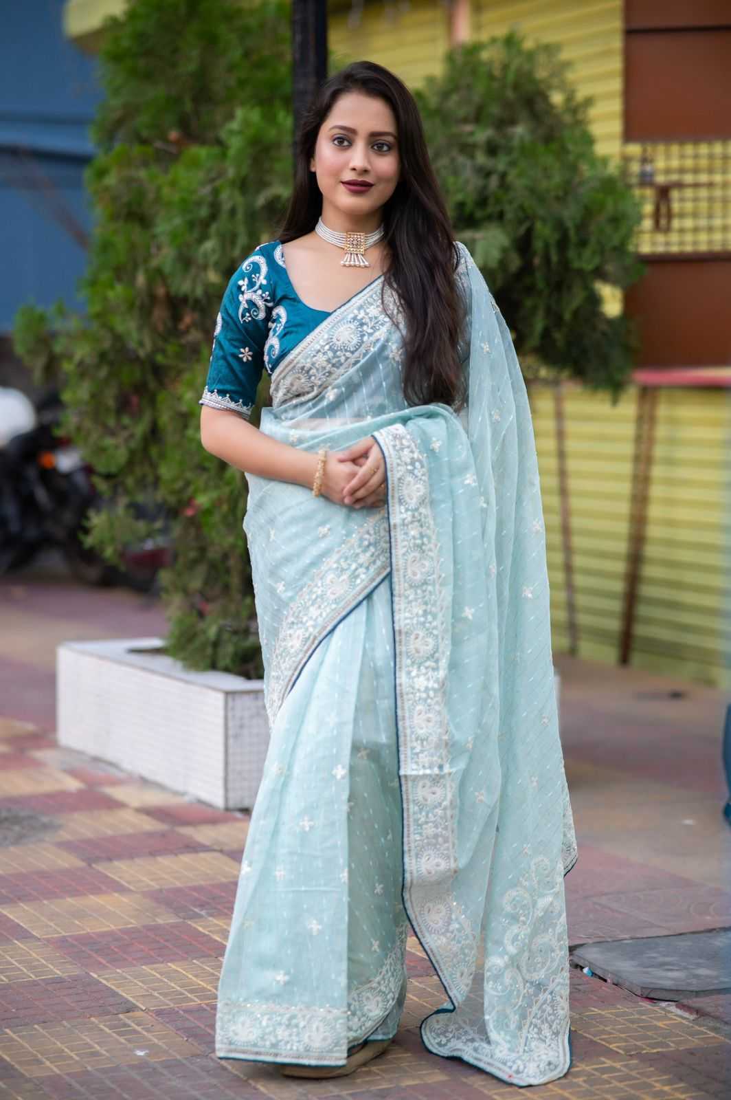 new arrivals New beautiful perimum organza catalog #organzaintrend KC- ritika organza. Quality- soft organza saree with with allover woven zari linings and woven rice shaped white thread. Specialty- white thread and sequence embroidery with c-pallu concept. Blouse- up-tone phantom silk with white thread and sequence embroidery. Rate- 1450+ship Top trusted quality |