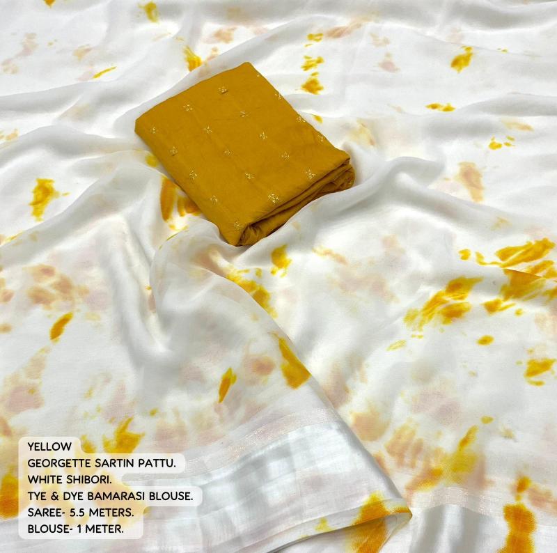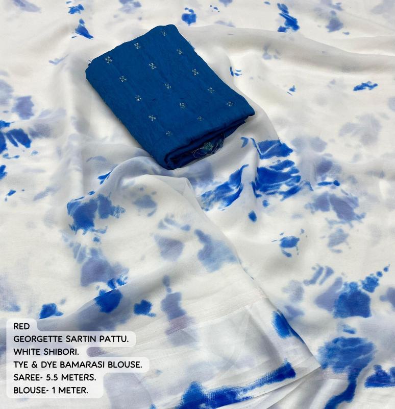 TOP TRENDING New clothing in latest trending shibori designs. KC- SHIBORI GEORGETTE (VANILA WHITE EDITION) Quality- soft georgette saree with sartin pattu border. White saree with shirobi prints all over. White zalar on pallu. Blouse- tye and dye chanderi blouse with zari woven butti. Rate - 599+ship Top trusted quality |
