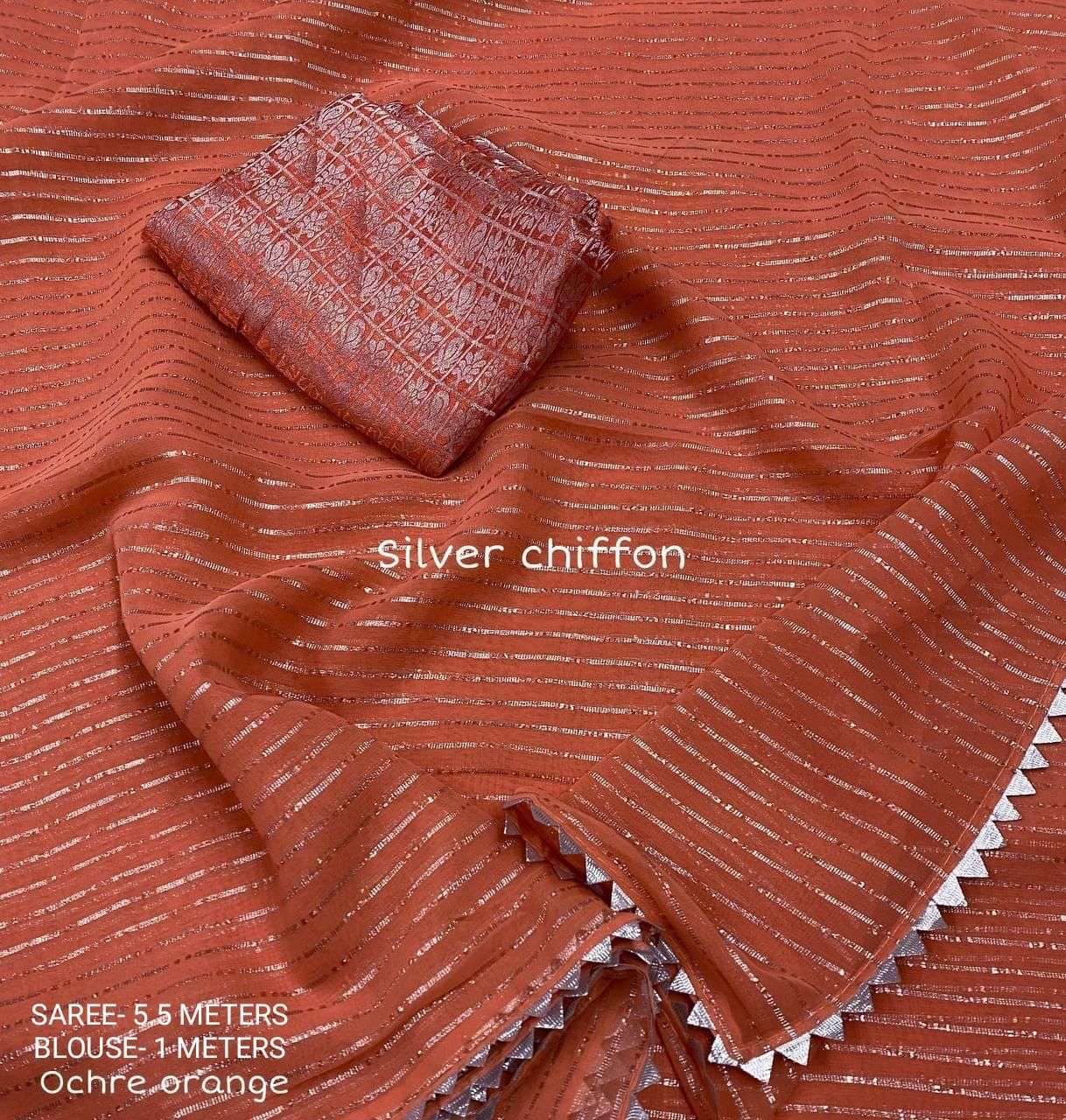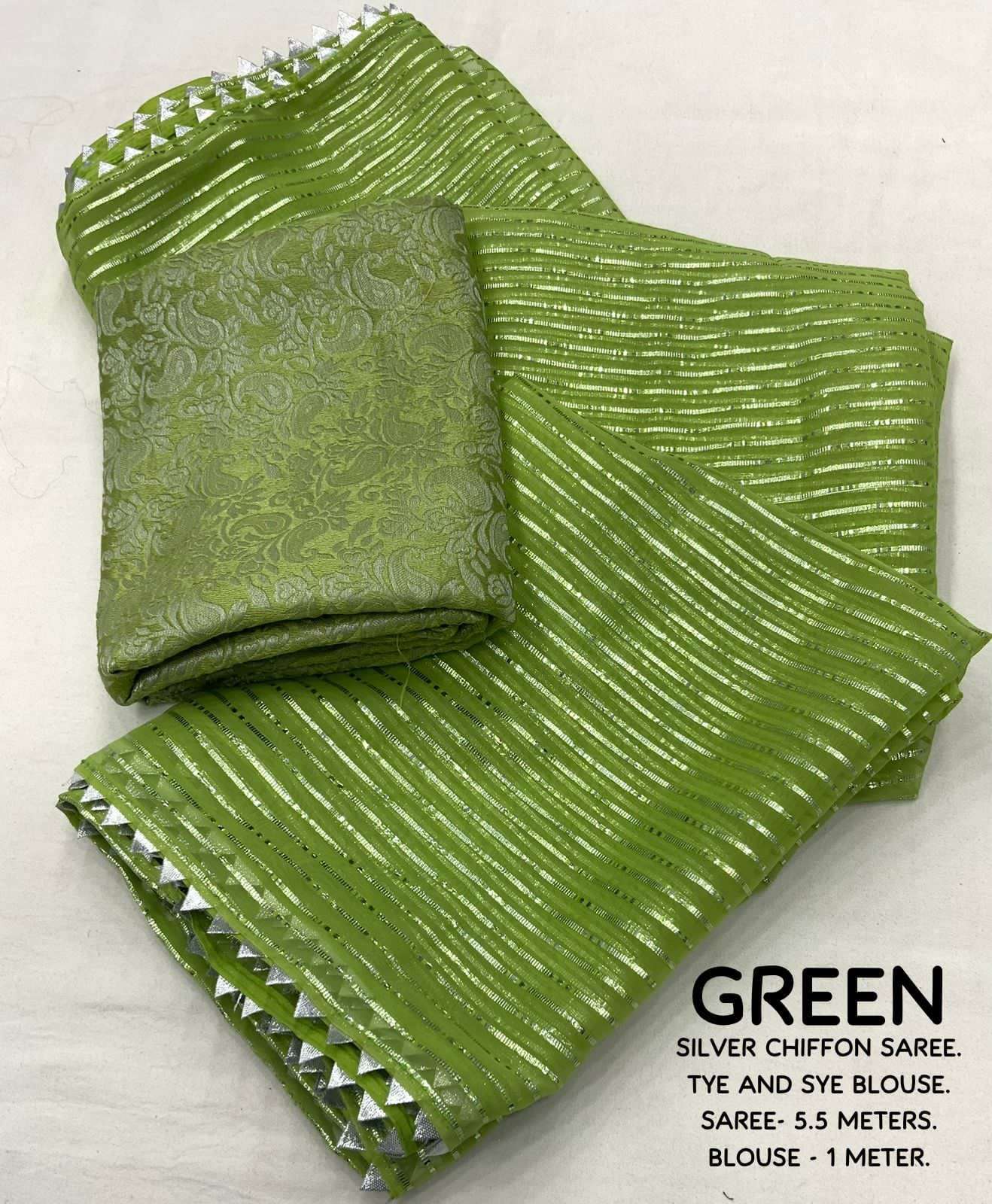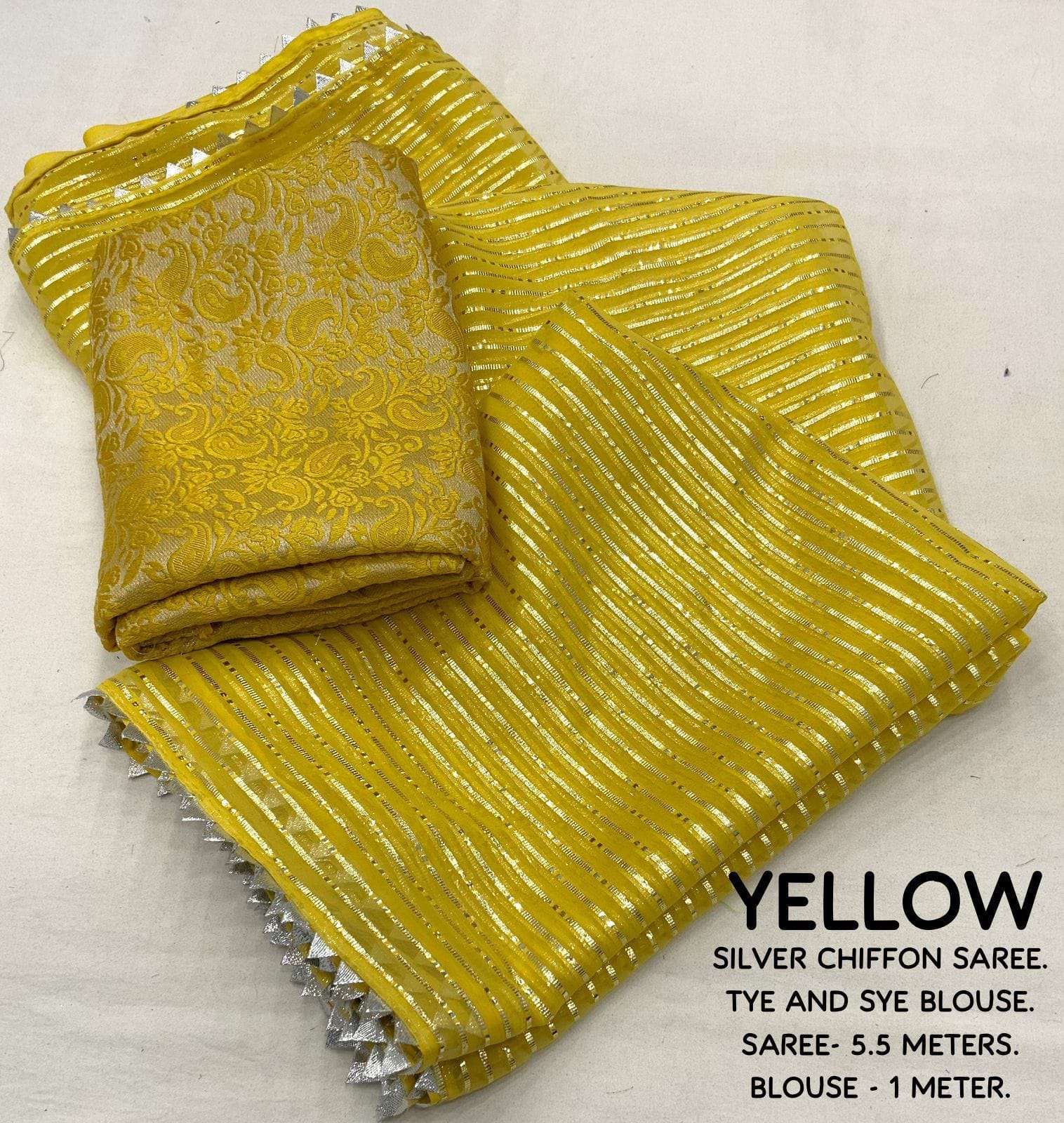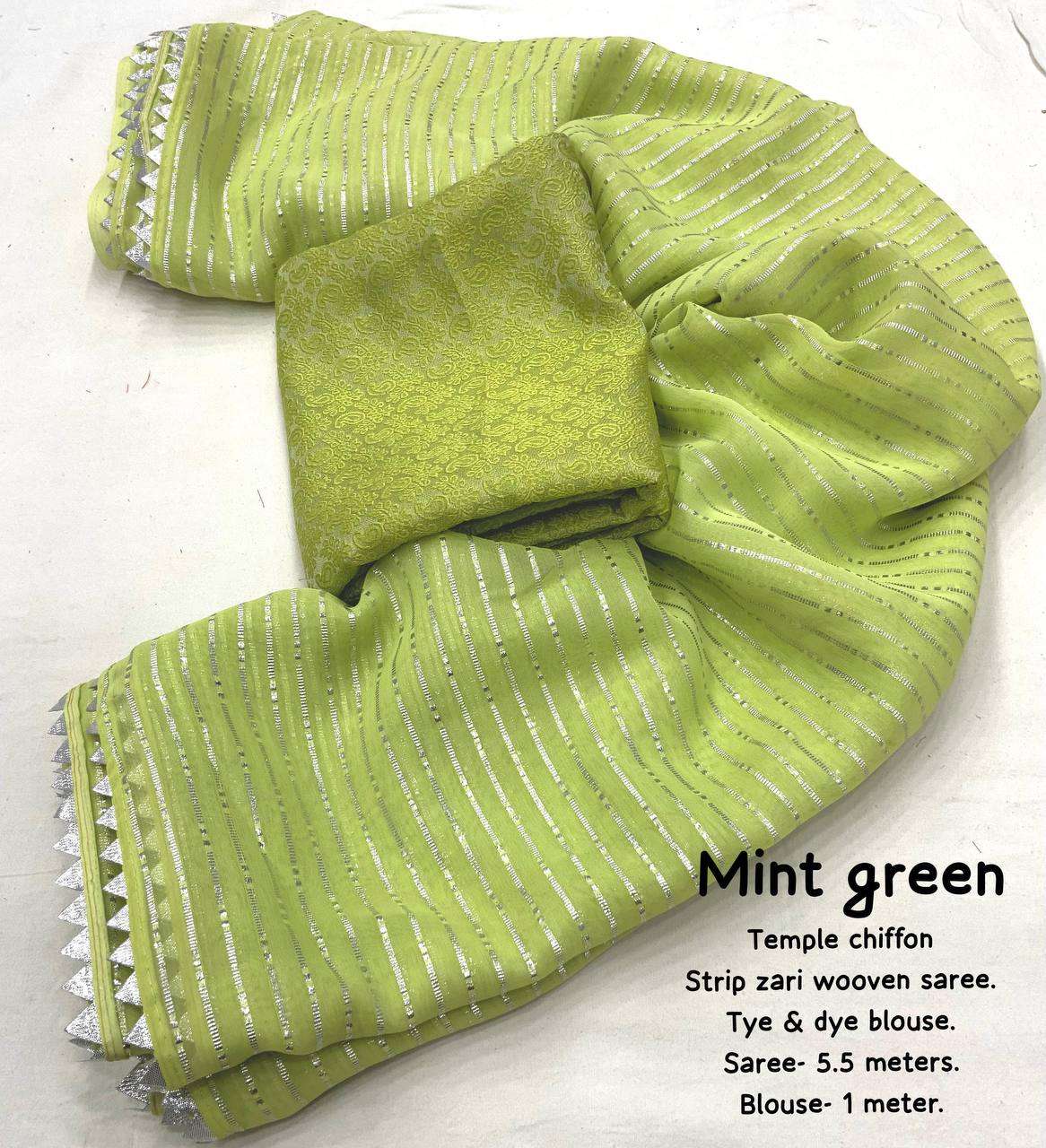 BEST SELLER KC - TEMPLE CHIFFON (VOL-3) Quality- soft chiffon saree with silver zari weaving line in allover saree Gota patcted temple border Blouse - ton to ton tye and dye banarsi silk blouse Length- Rate - 499/- +ship Top trusted quality |