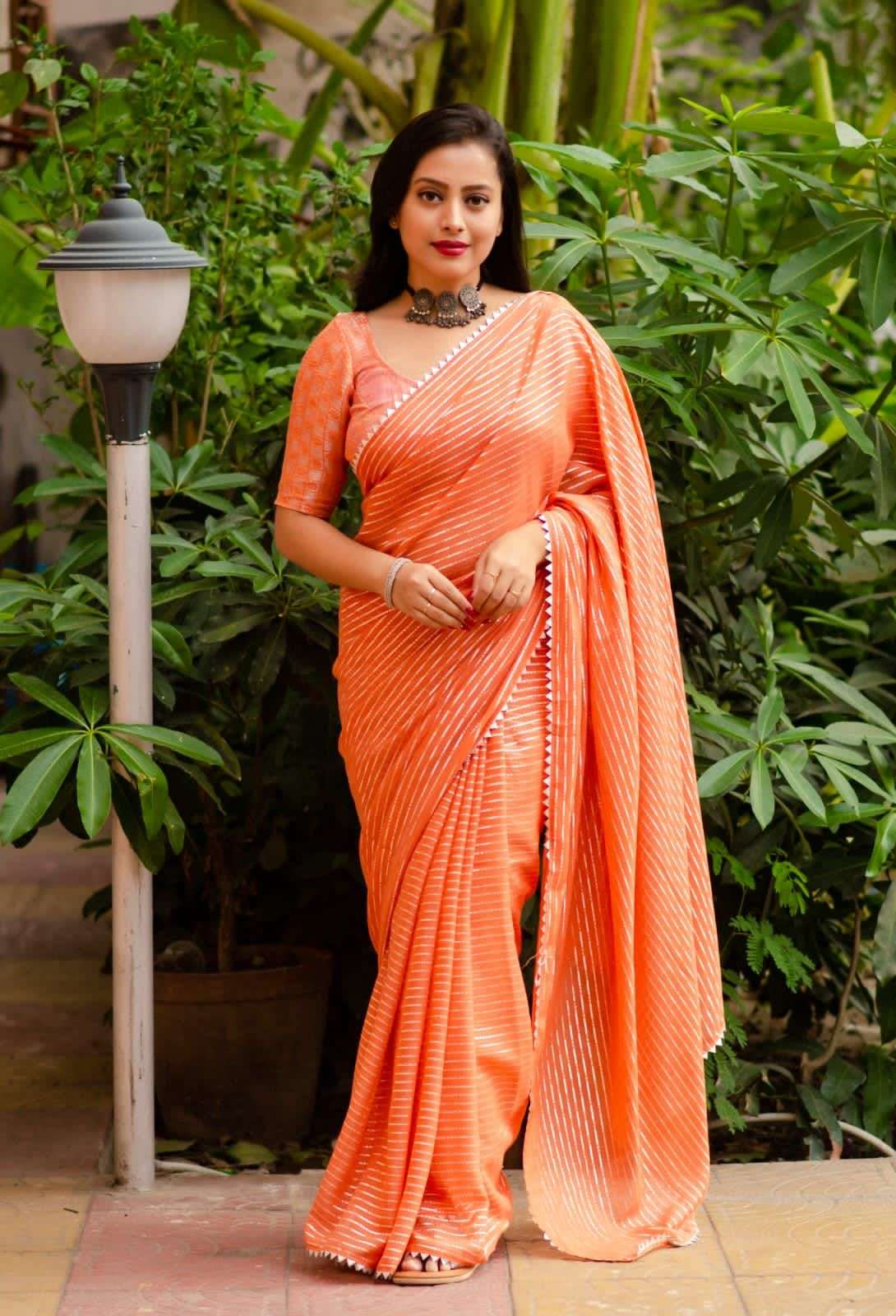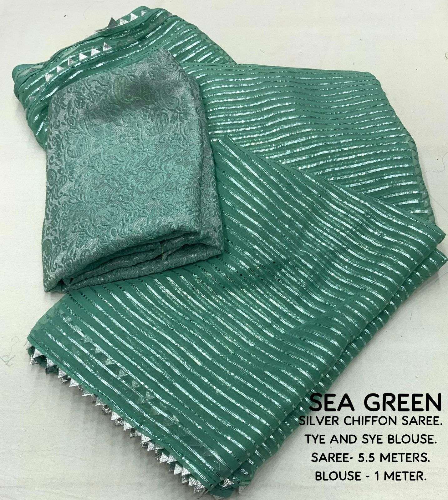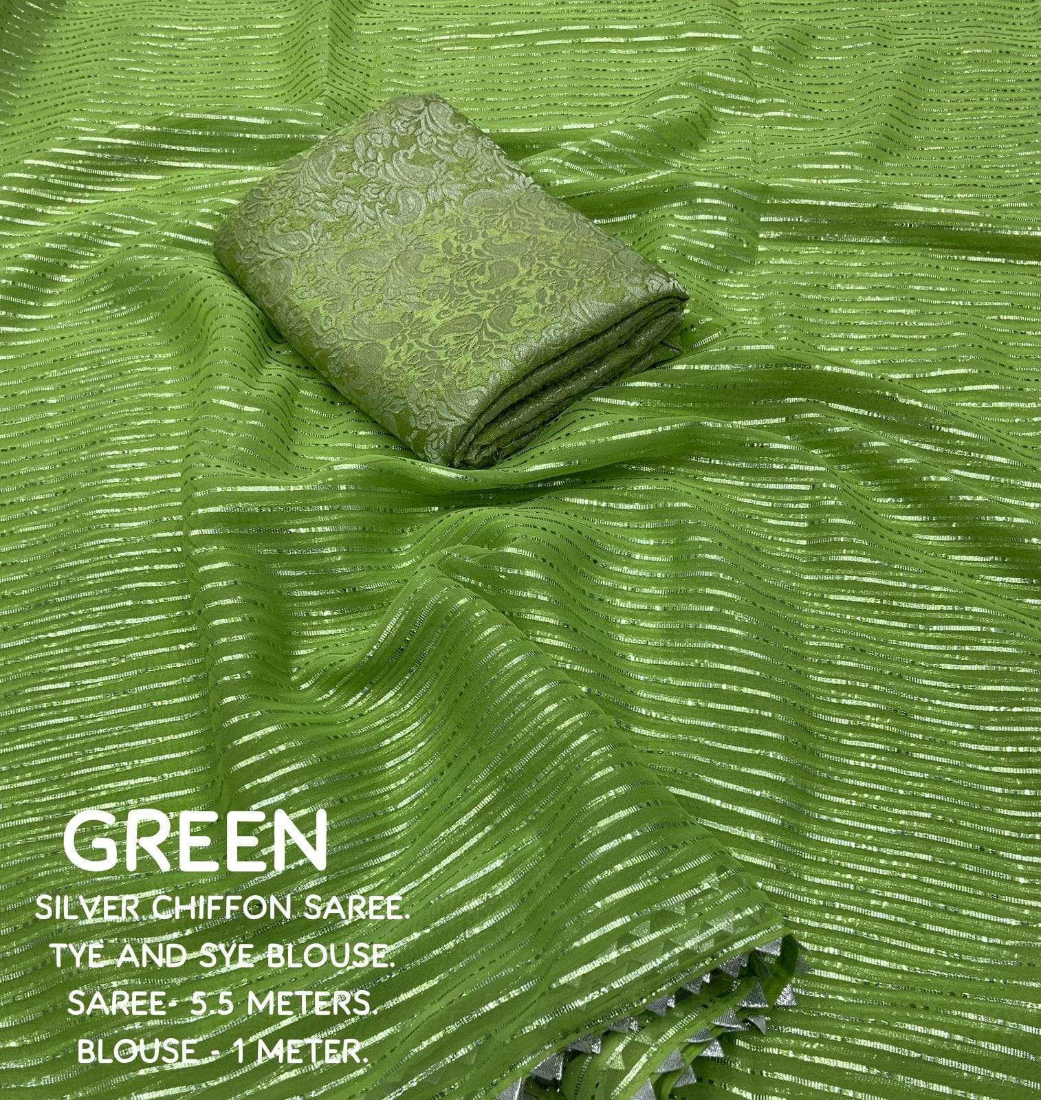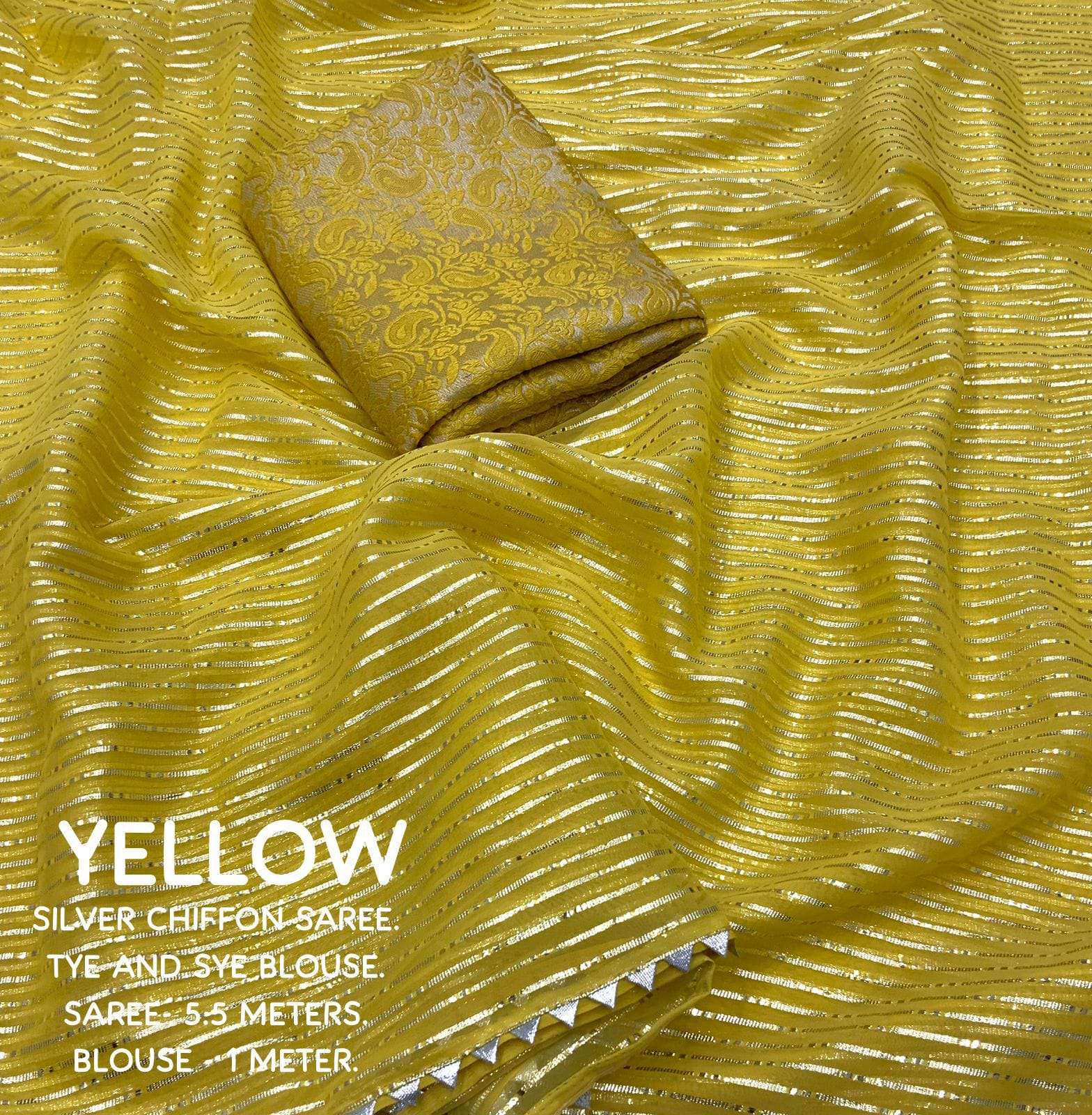 BEST SELLER KC - TEMPLE CHIFFON (VOL-3) Quality- soft chiffon saree with silver zari weaving line in allover saree Gota patcted temple border Blouse - ton to ton tye and dye banarsi silk blouse Length- Rate - 499/- +ship Top trusted quality |
